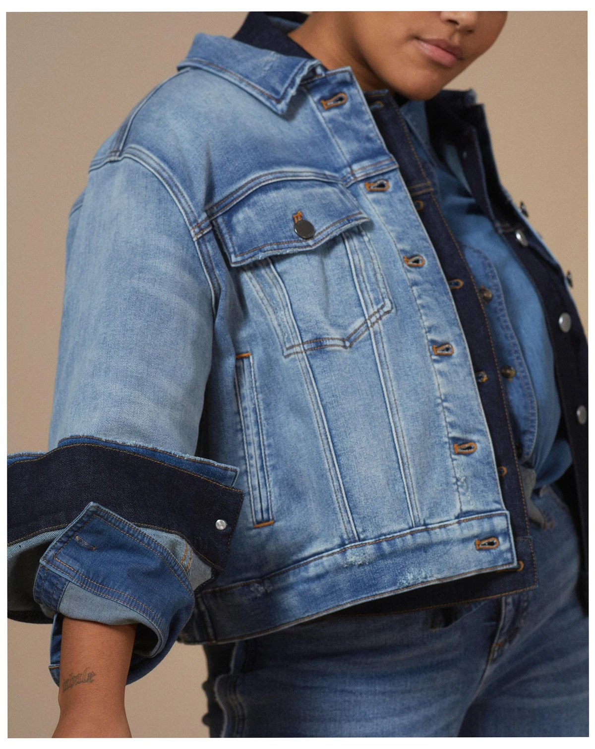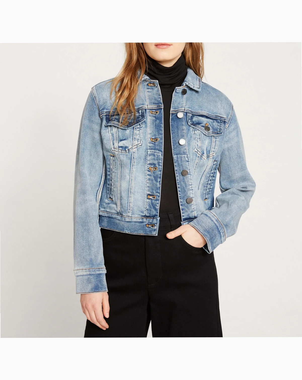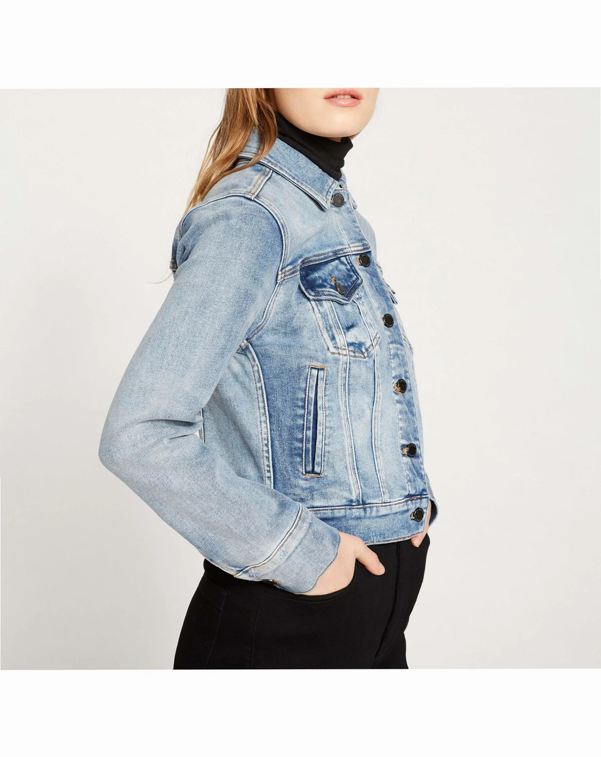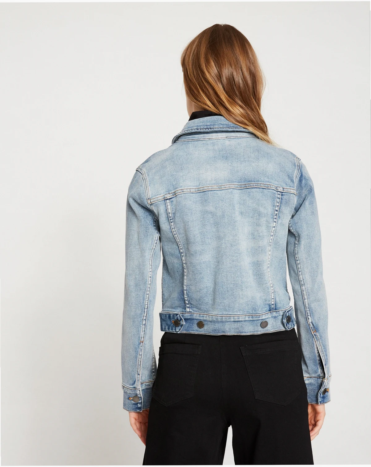 The ultimate denim jacket, tailored to perfection in stretch denim that moves with you. Designed in a versatile medium wash with contrast stitching and functional pockets, this jacket is your go-to lightweight layer. Made from 78% cotton, 19% polyester, and 3% elastane, it offers comfort and flexibility. Features include a classic collar, long sleeves, and snap-front buttons. Easy to care for—machine wash inside out with like colors. Wash separately before use. Do not bleach or tumble dry. Warm iron inside out if needed.