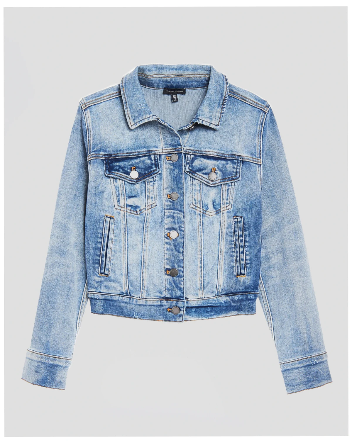 Medium-wash denim features contrast stitching and functional pockets.; Machine washable; Machine wash cold gentle do not bleach or tumble dry.