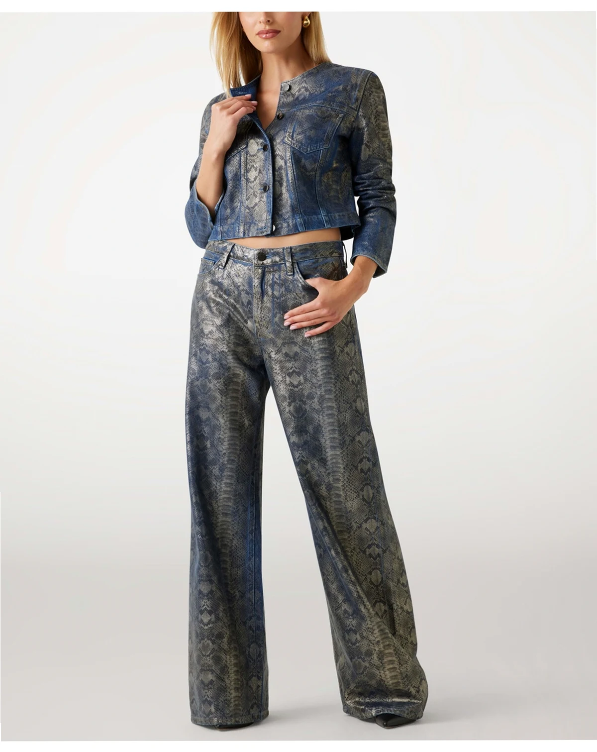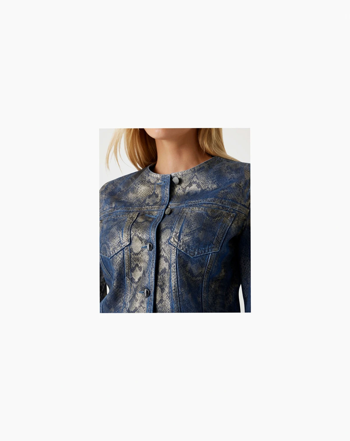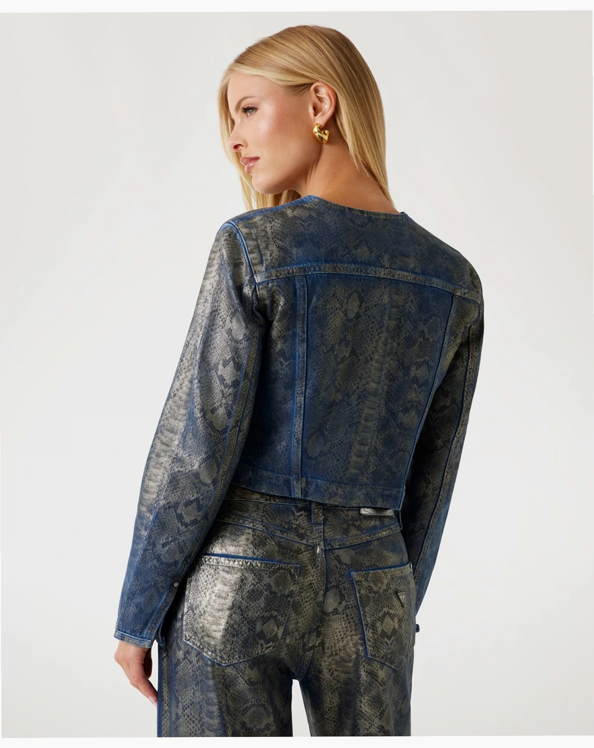 Featuring an all-over snake skin foil design, this GUESS jacket offers a unique and stylish look with a collarless neckline and long sleeves. Two front welt pockets provide practical storage, while the button-down closure ensures a secure fit.