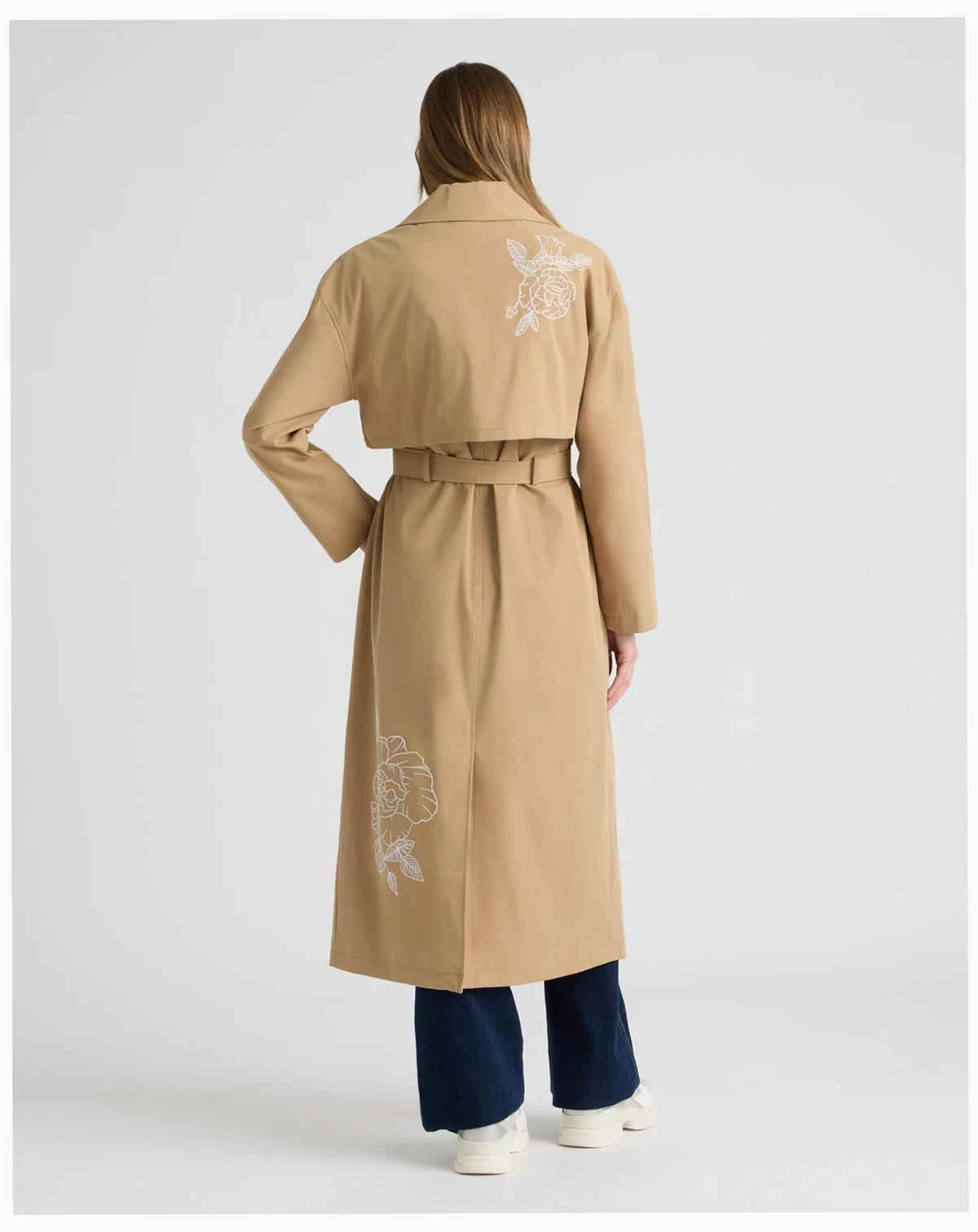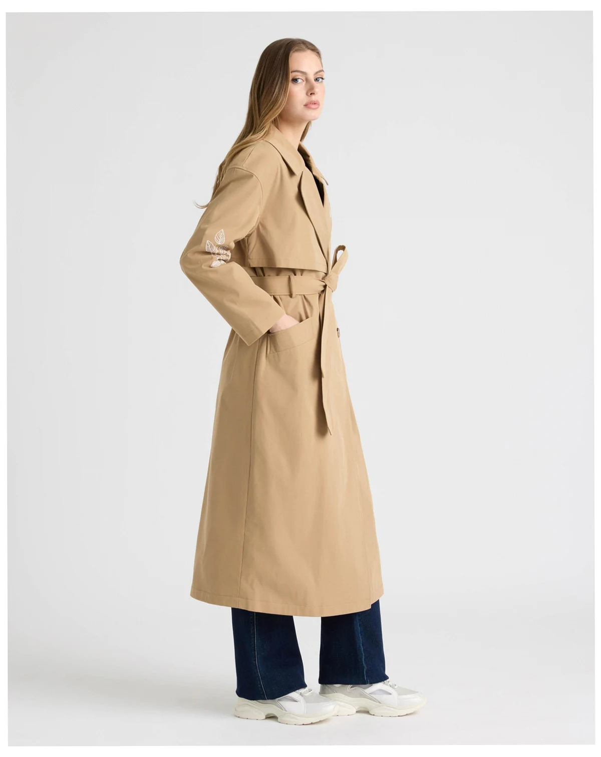 Elegant embroidery adorns this long trench, accented by storm shields at the front and back. A notch collar and self belt shape the silhouette for a flattering fit. Side welt pockets and double-breasted buttons complete the refined profile.