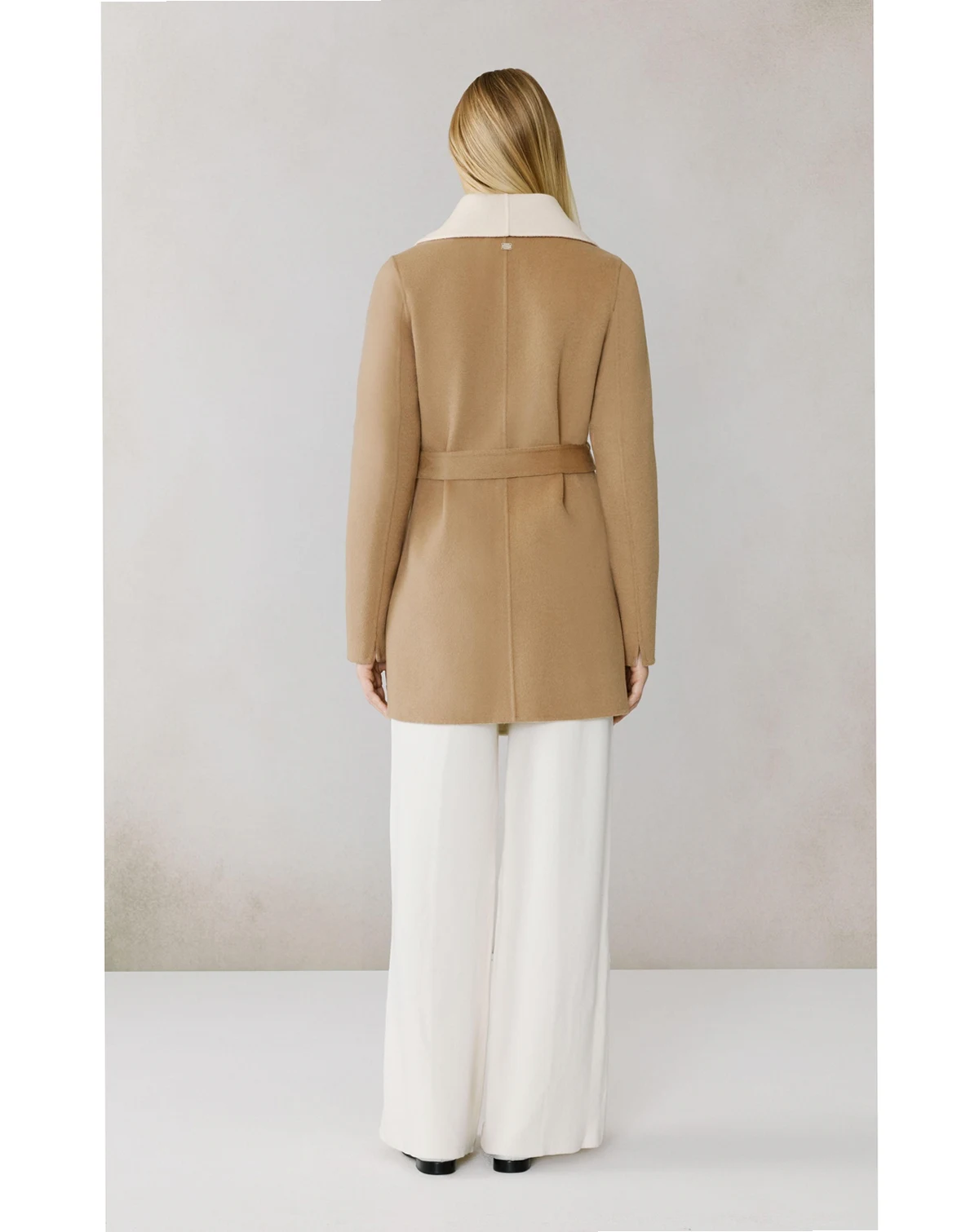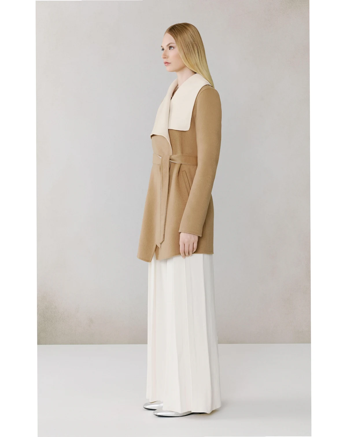 The BRIDGETTE-U by SOIA and KYO is a refined wrap coat with soft lines and tailored ease. Featuring a cascade collar, hidden button closure, and tie belt, it drapes effortlessly over layers. Made from double-face wool with hand-finished seams, it s crafted for quiet elegance.