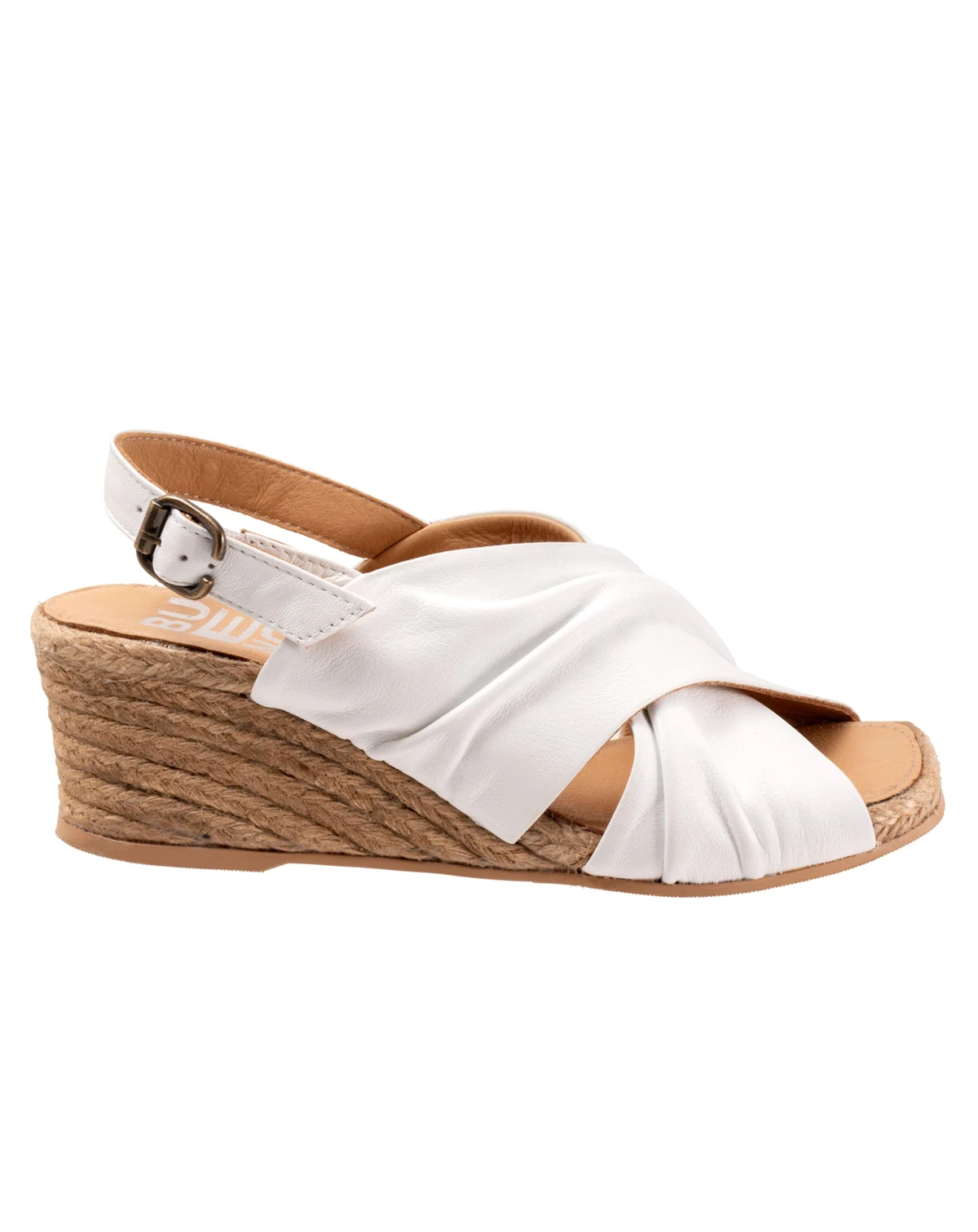 The Jasmin espadrille wedge sandal has large ruched criss cross straps with a small adjustable back strap.