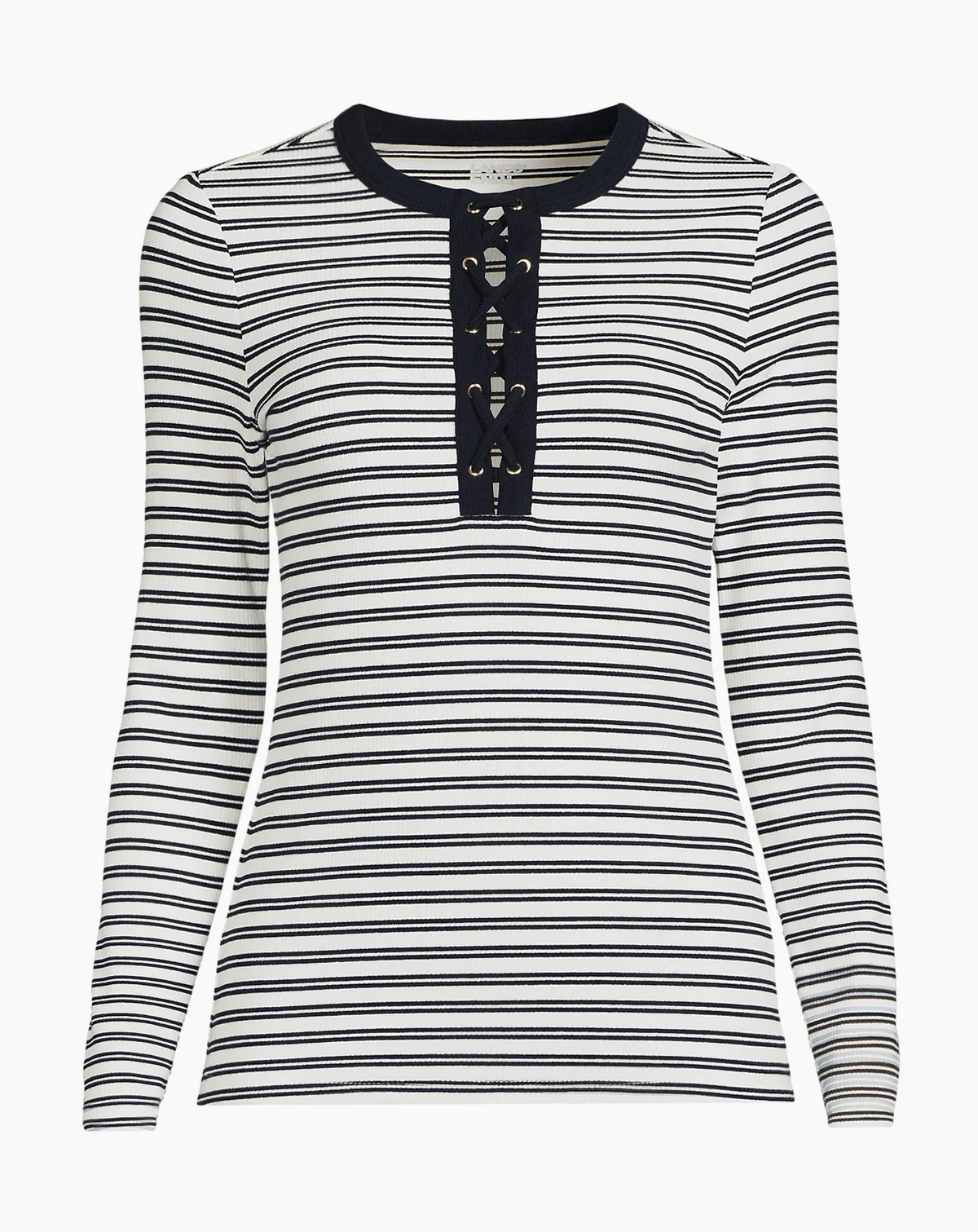 Decorative grommets and a faux tie-front placket lend a contemporary edge to this classic henley. Thoughtful details like tape binding along the neckline and placket create a refined, understated finish. Crafted from a soft cotton knit with a hint of stretch, it delivers a comfortable fit that flatters..
