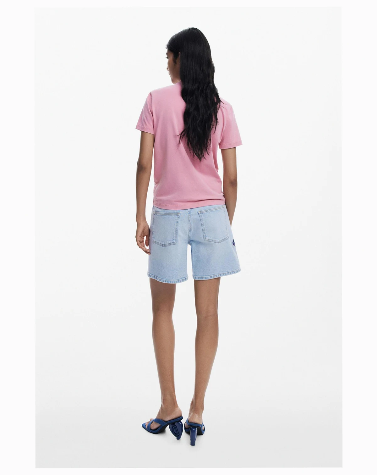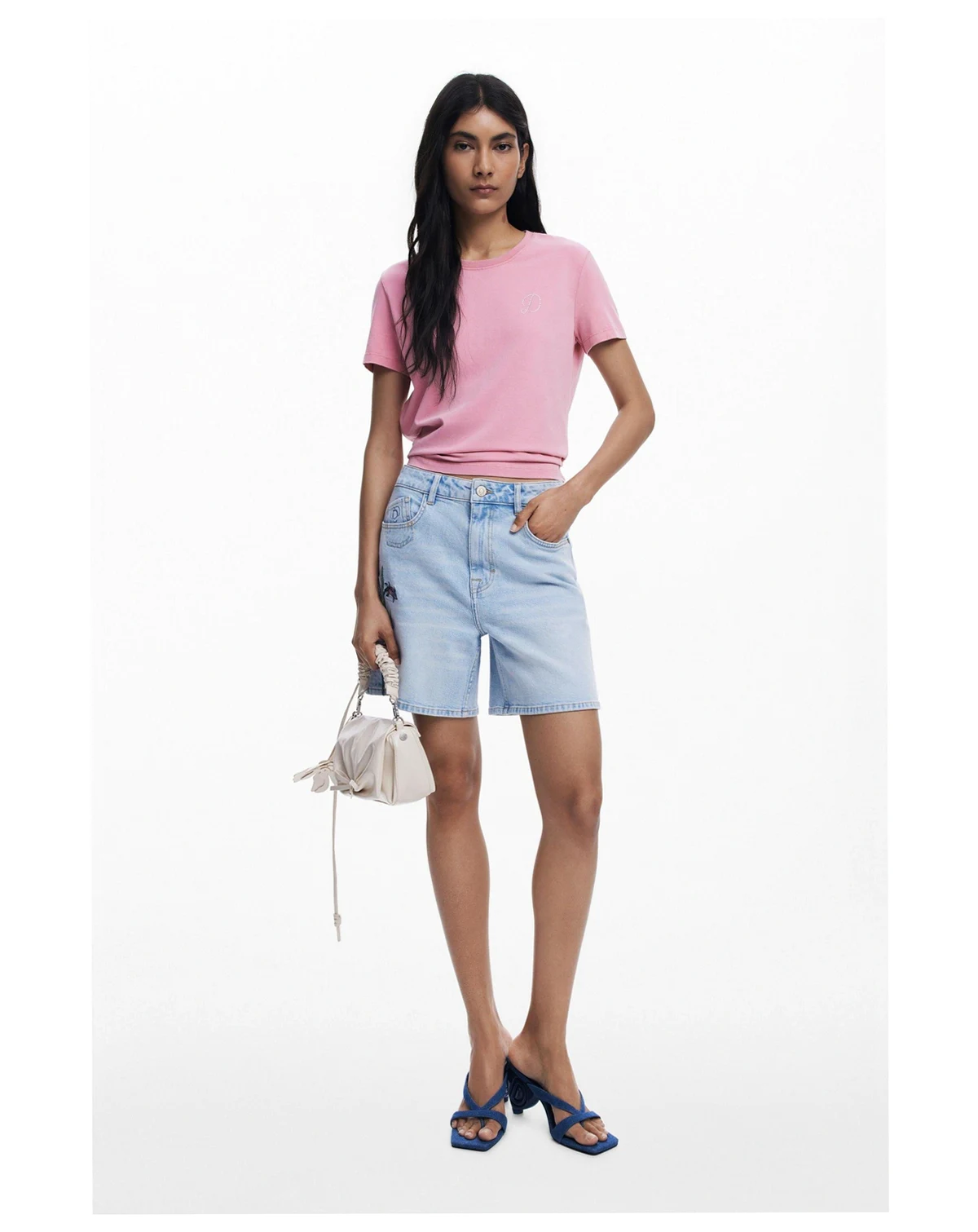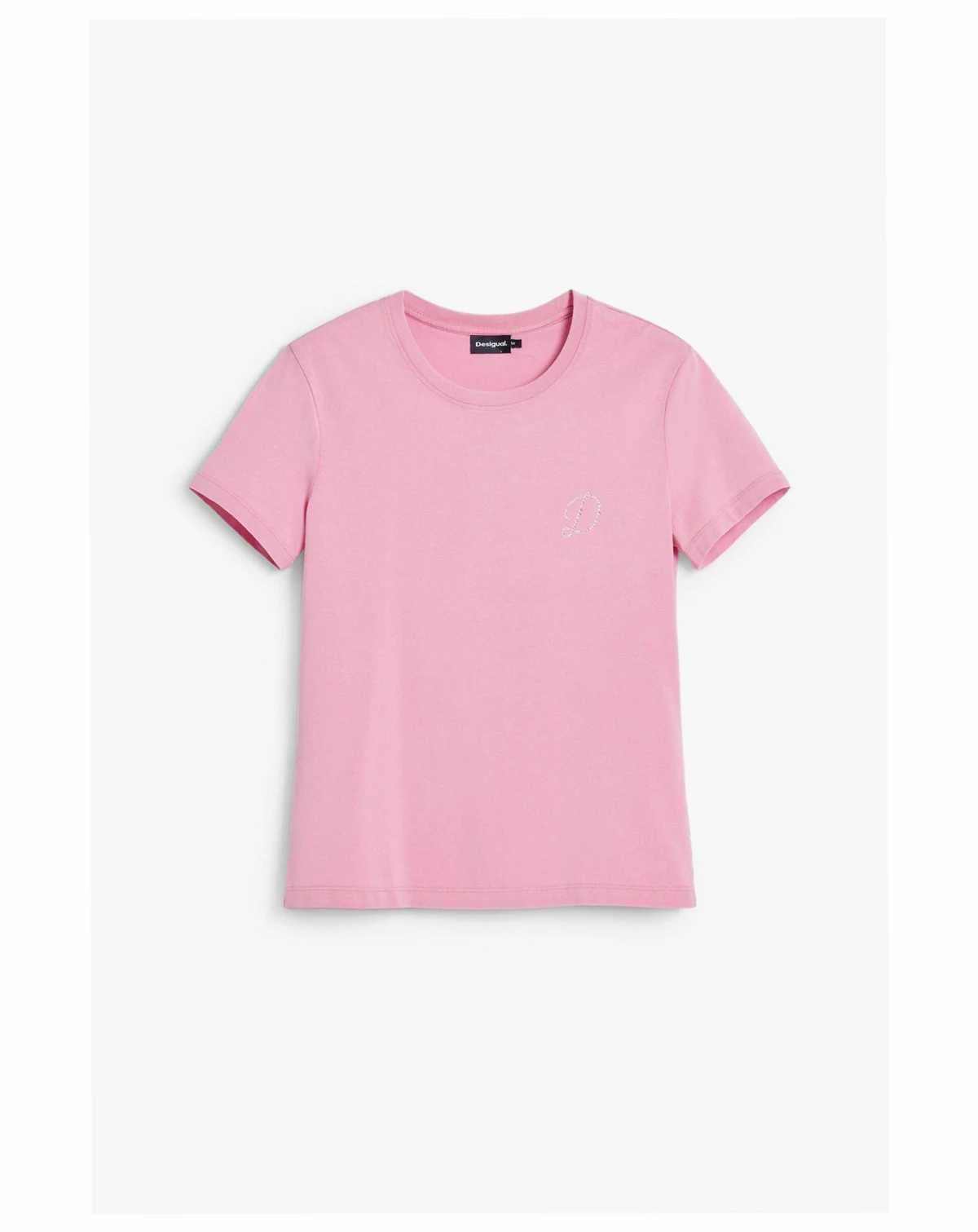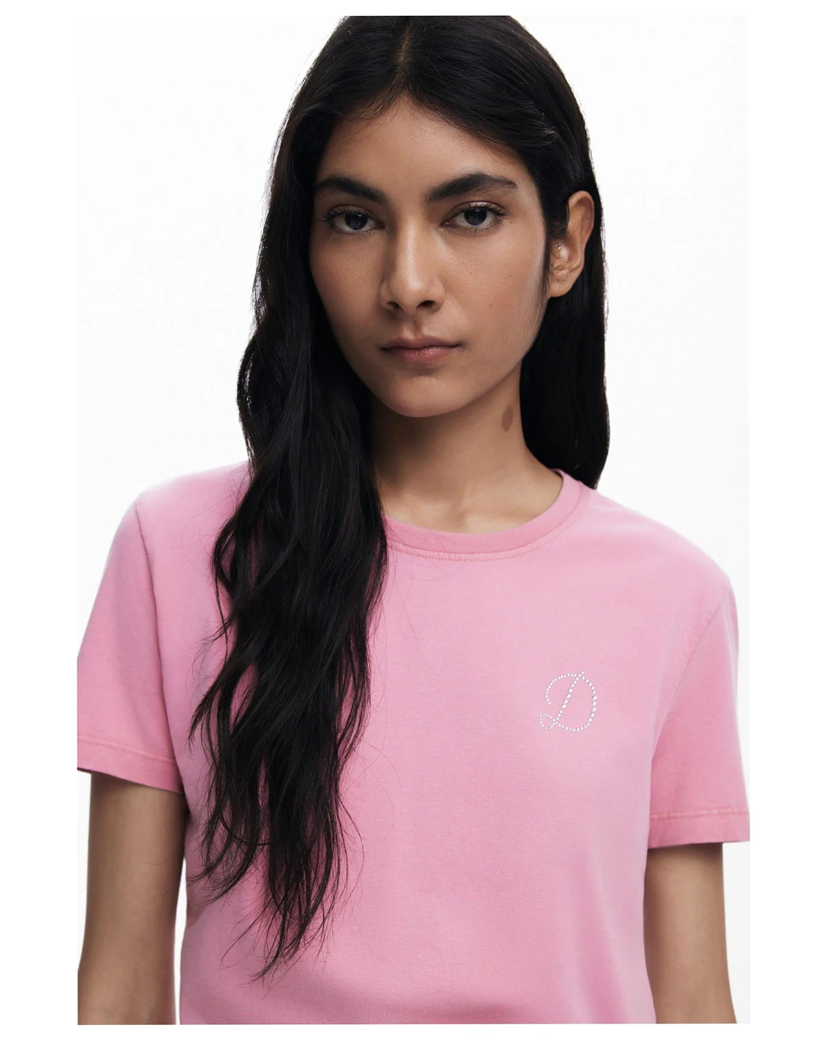 Short-sleeved T-shirt with a round neck in a solid color and with a "D" letter detail in strass at chest height.