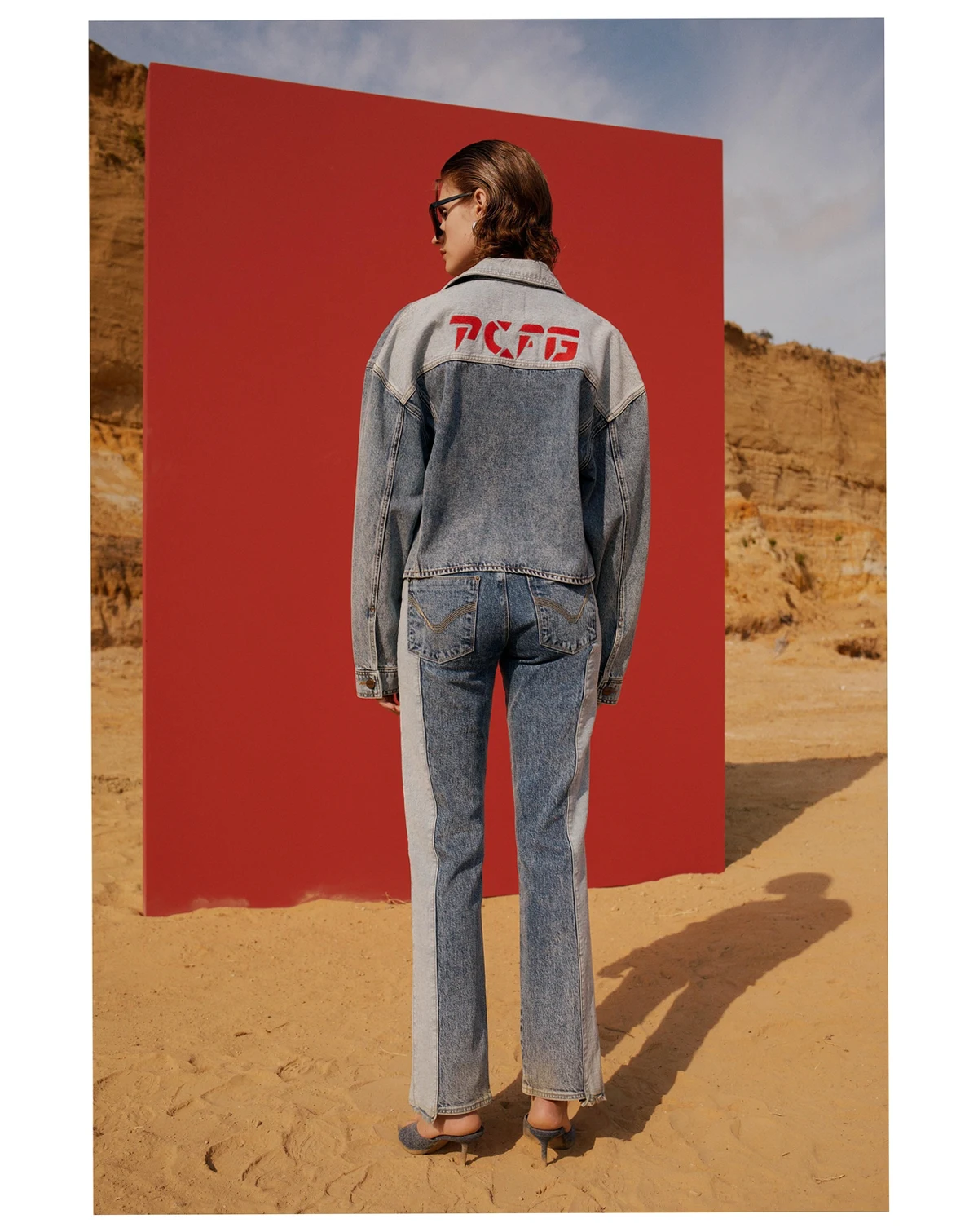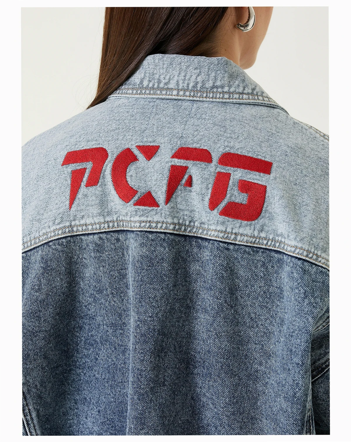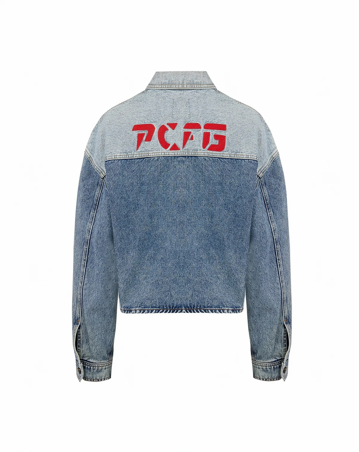 The Free Heaven Inside Out Blue Jacket is a women's denim jacket from PCFG's Free Heaven capsule collection, featuring distinctive two-tone colour-block construction where darker and lighter blue panels are flipped so the reverse side of the denim becomes a design element. The jacket showcases exposed contrast seams and raw-edge panel joins that emphasise the inside-out look, with branded PCFG logo detailing on the back yoke. Antique-silver metal buttons stamped with the PCFG mark run down the front placket and at cuffs, giving a classic trucker-jacket closure with extra shine. The boxy shoulders and dropped armholes contribute to a relaxed, slightly rebellious street-wear silhouette, while the statement colour blocking creates depth without heavy distressing for a modern look that pairs well with basics.
