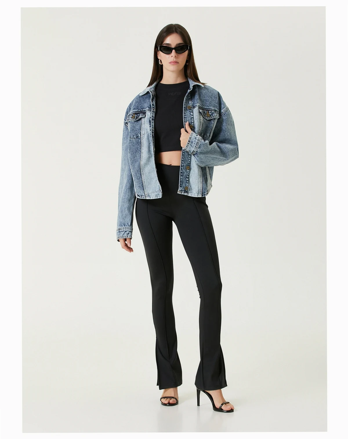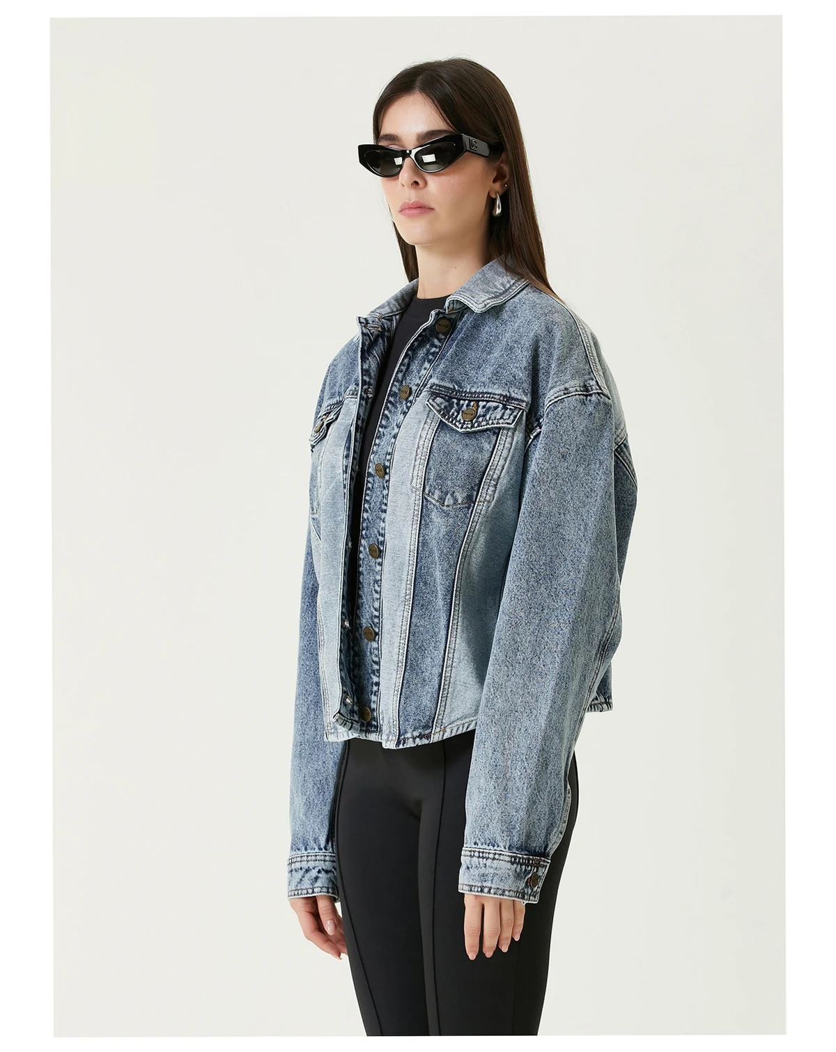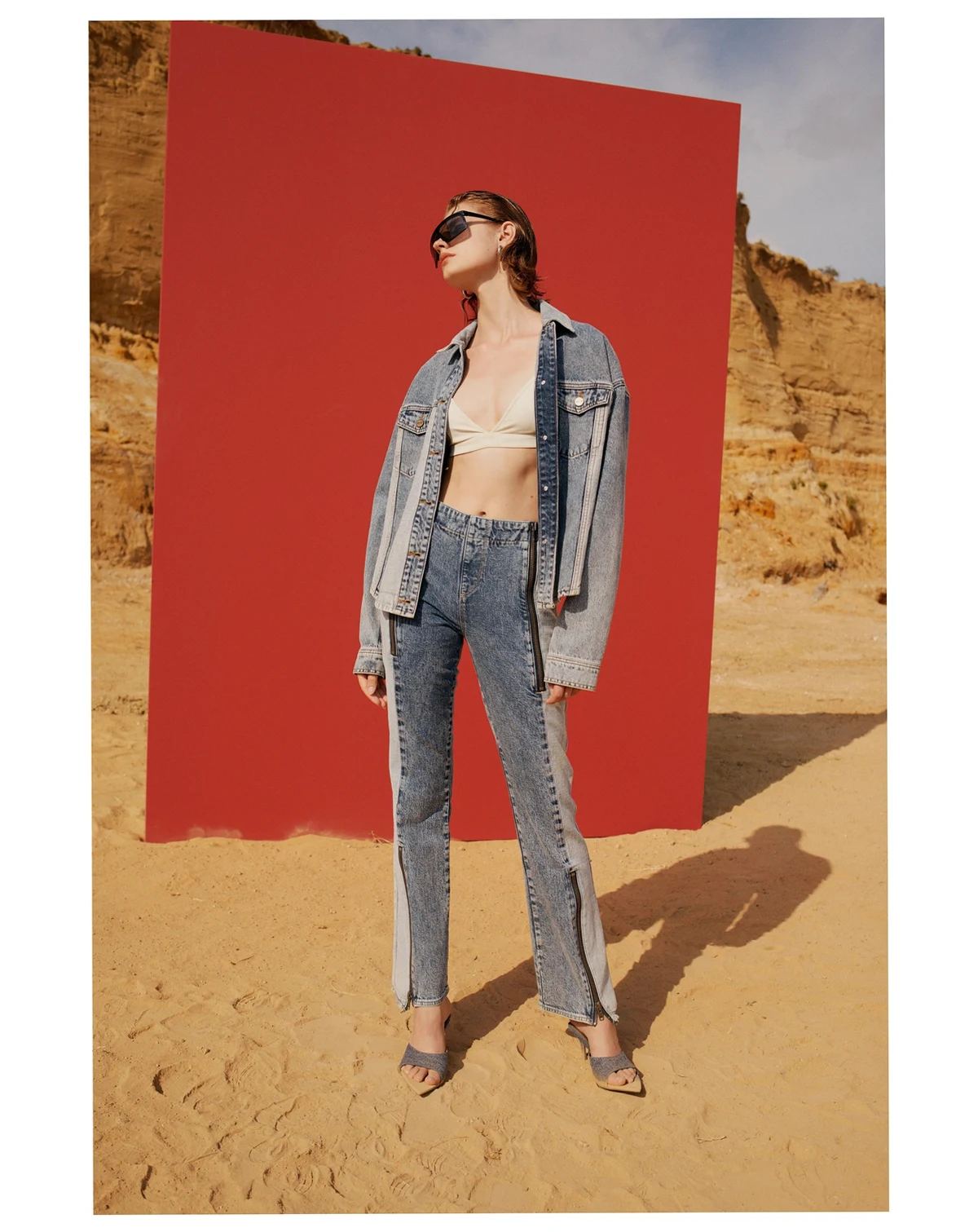 The Free Heaven Inside Out Blue Jacket is a women's denim jacket from PCFG's Free Heaven capsule collection, featuring distinctive two-tone colour-block construction where darker and lighter blue panels are flipped so the reverse side of the denim becomes a design element. The jacket showcases exposed contrast seams and raw-edge panel joins that emphasise the inside-out look, with branded PCFG logo detailing on the back yoke. Antique-silver metal buttons stamped with the PCFG mark run down the front placket and at cuffs, giving a classic trucker-jacket closure with extra shine. The boxy shoulders and dropped armholes contribute to a relaxed, slightly rebellious street-wear silhouette, while the statement colour blocking creates depth without heavy distressing for a modern look that pairs well with basics.