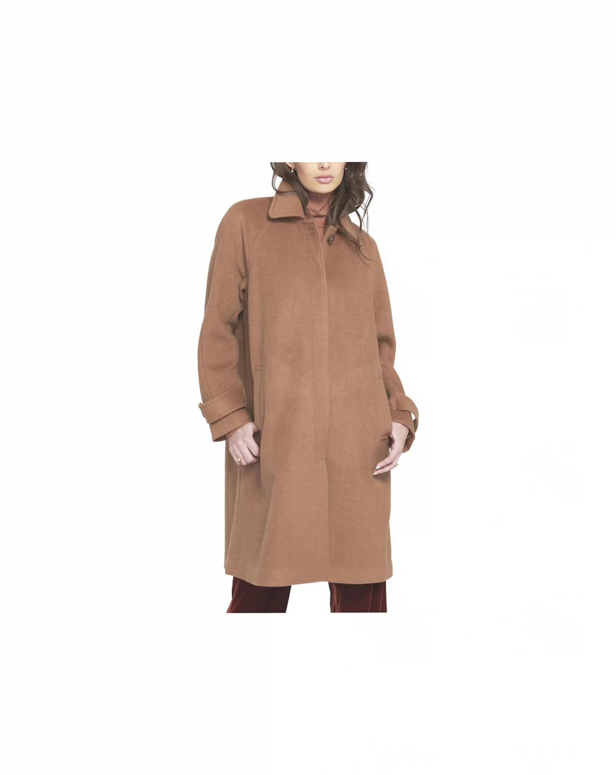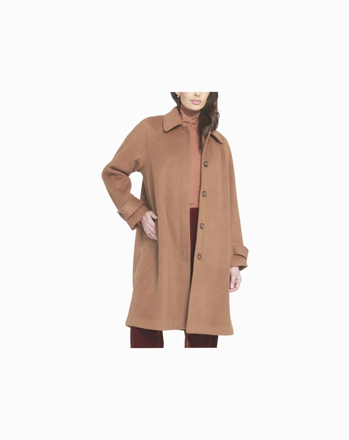 This classic A-line melton coat features a clean, structured silhouette that offers timeless appeal. Crafted from a soft-touch, wool-like polyester-viscose blend, it provides both durability and comfort without the maintenance of traditional wool. The concealed front closure with oversized buttons creates a streamlined, refined finish, while the tailored collar and cuff details add a sophisticated touch. Designed with an ideal weight and length for layering through cooler seasons, this coat is easy to care for—simply machine wash, reshape, and lay flat to dry.