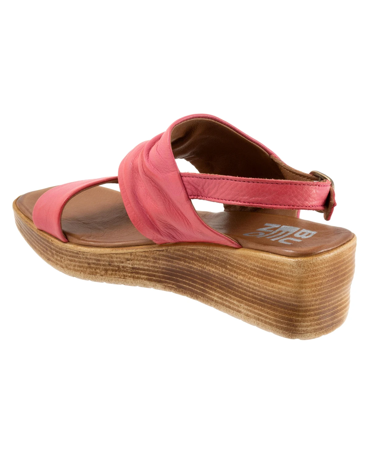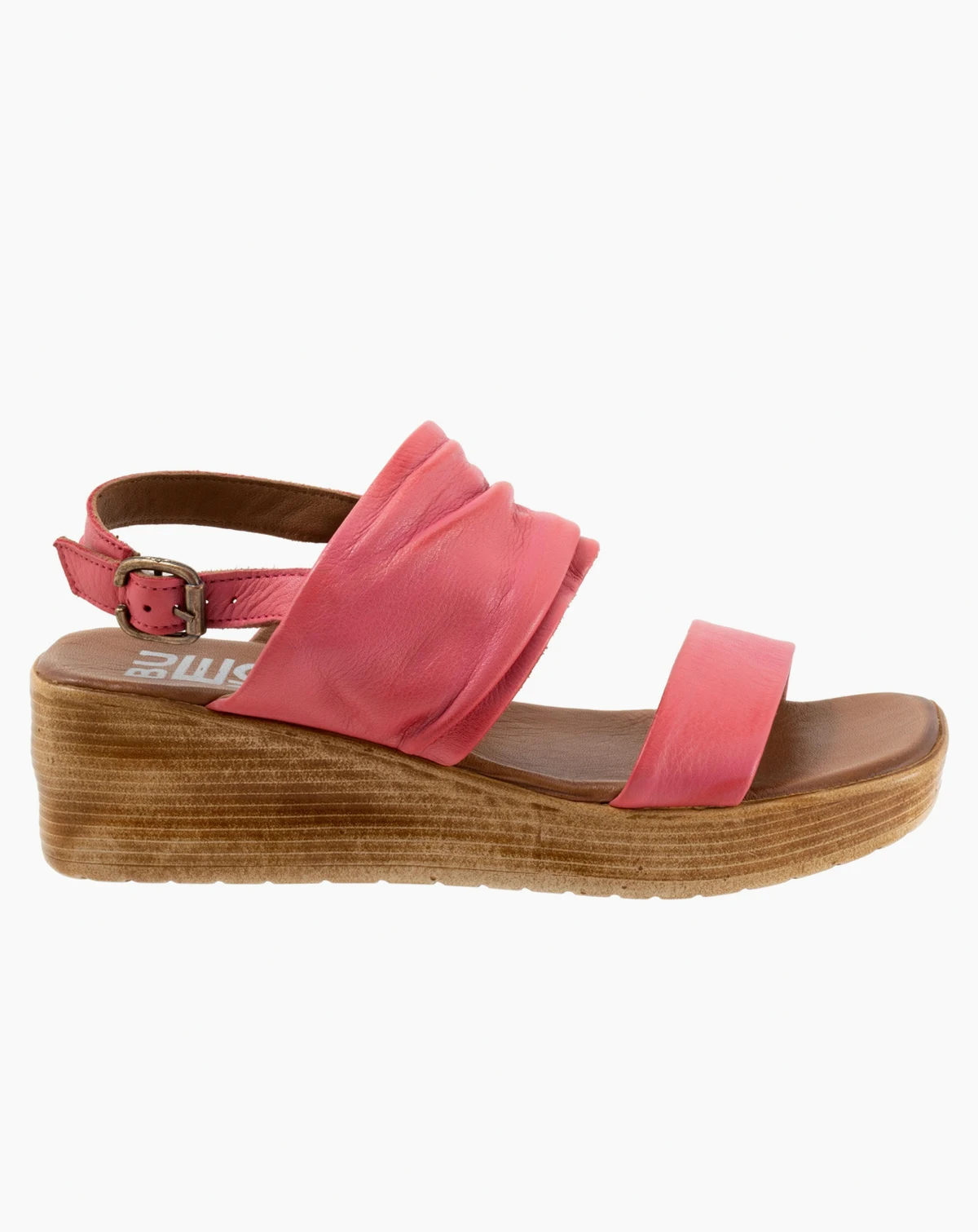 The Maya wedge platform sandal has a small toe strap and a medium sized mid strap that is ruched. A small backstrap is adjustable.