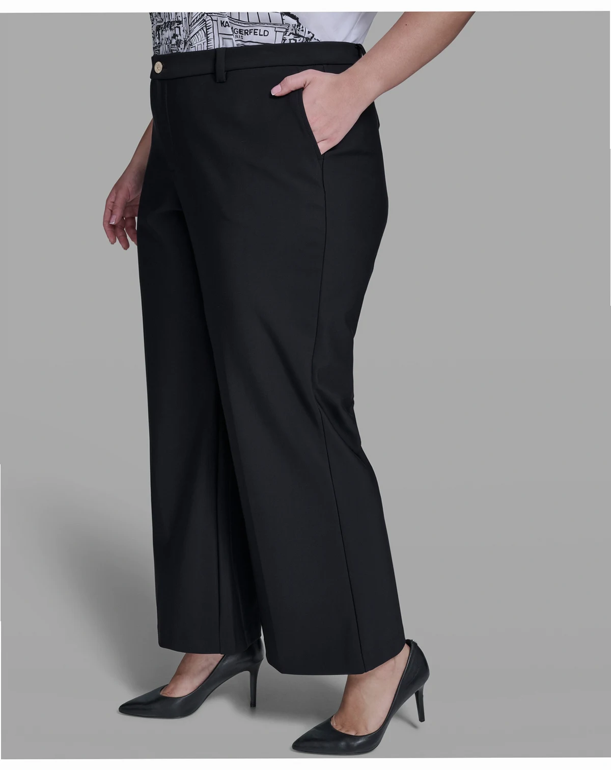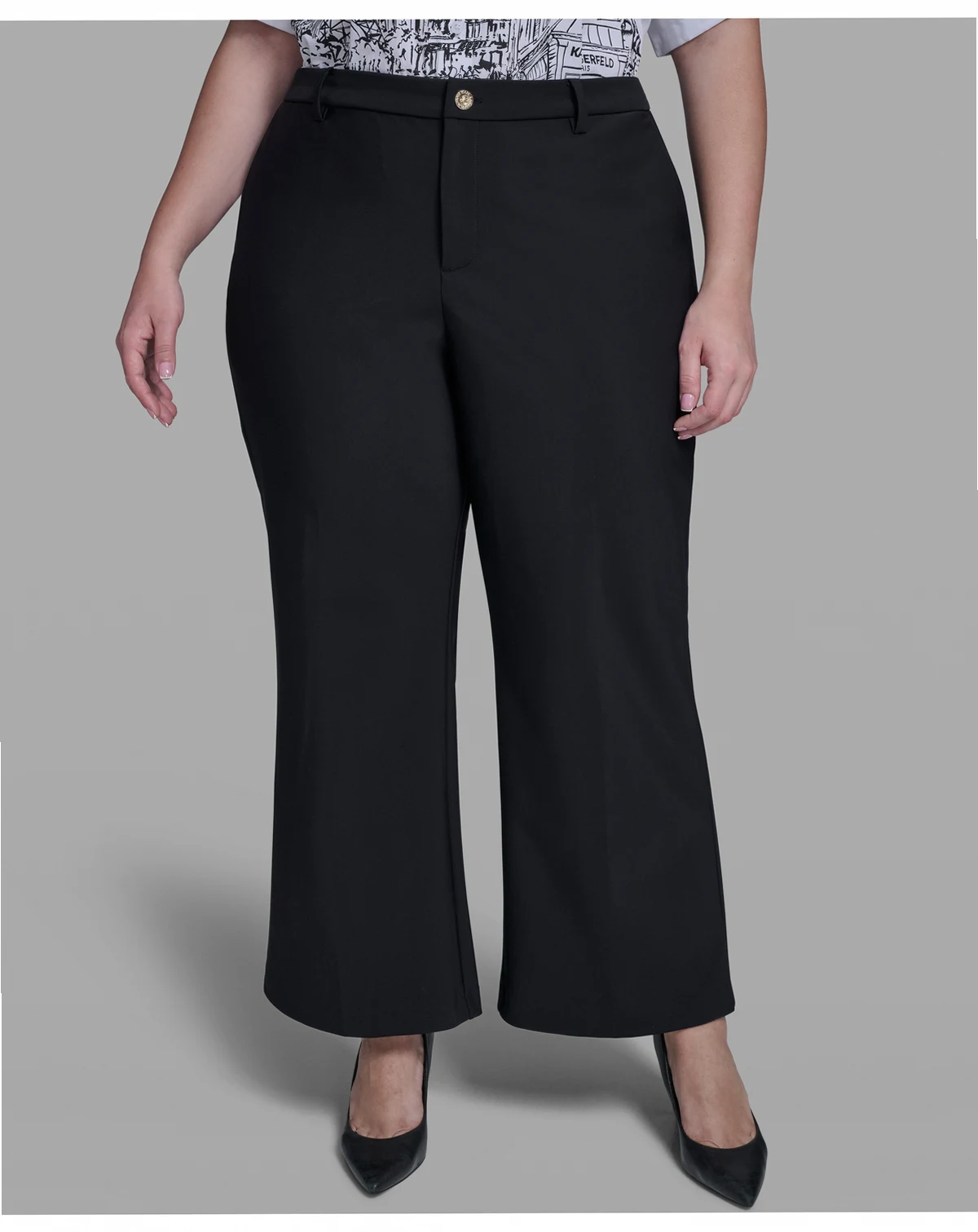 Achieve a sleek silhouette in these wide leg pants from KARL LAGERFELD PARIS, featuring a straight leg and mid-rise design. A zip fly with button closure and front slant pockets provide a polished, comfortable fit.