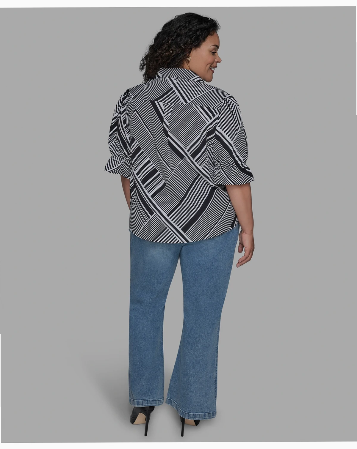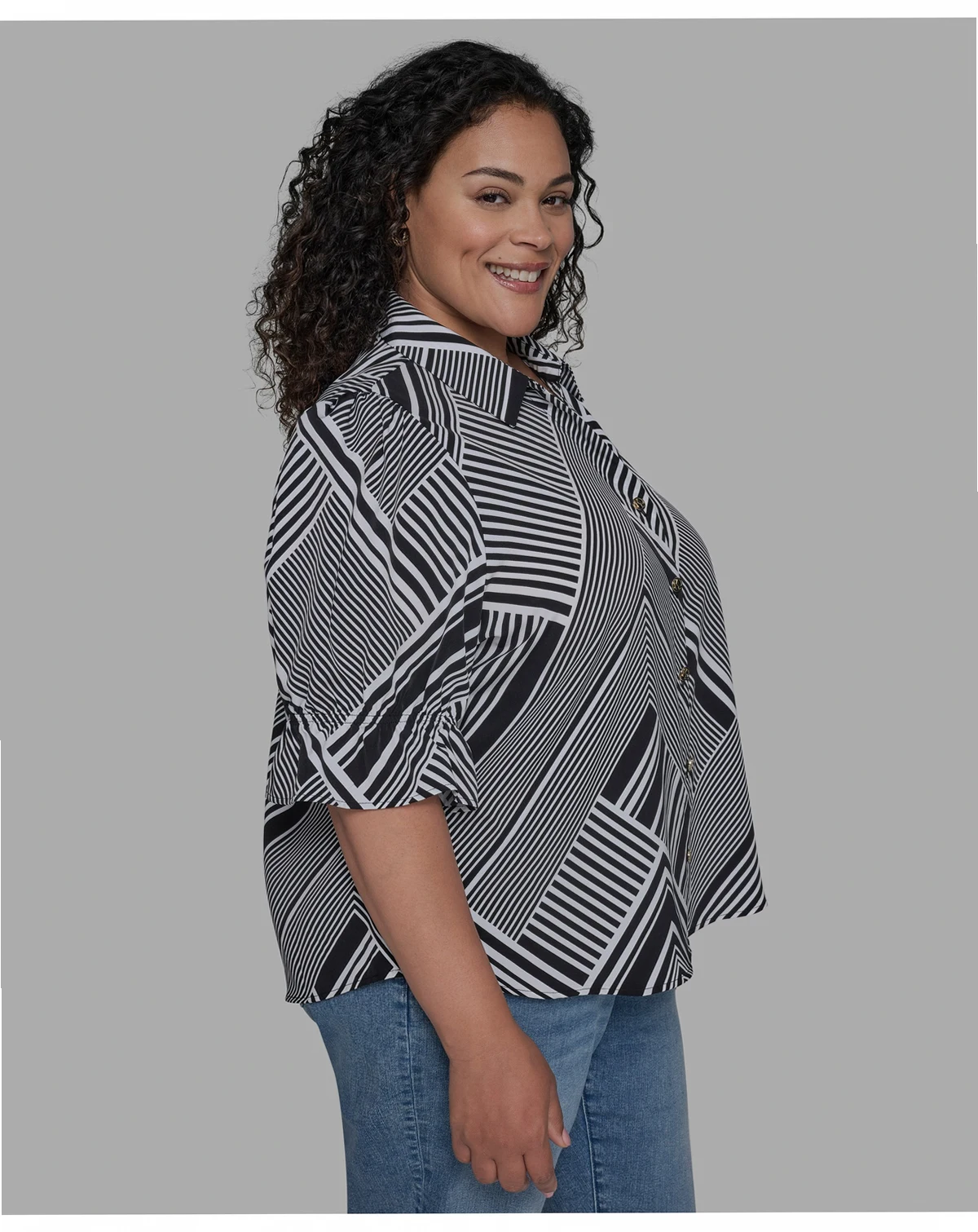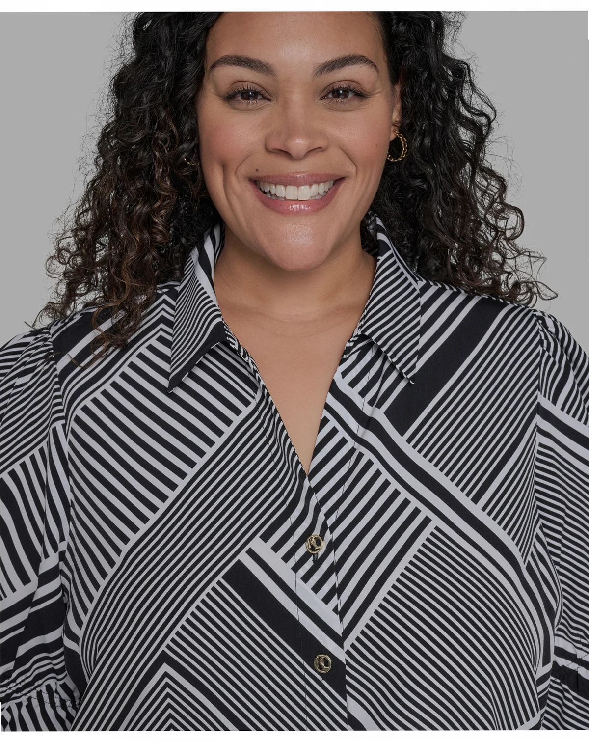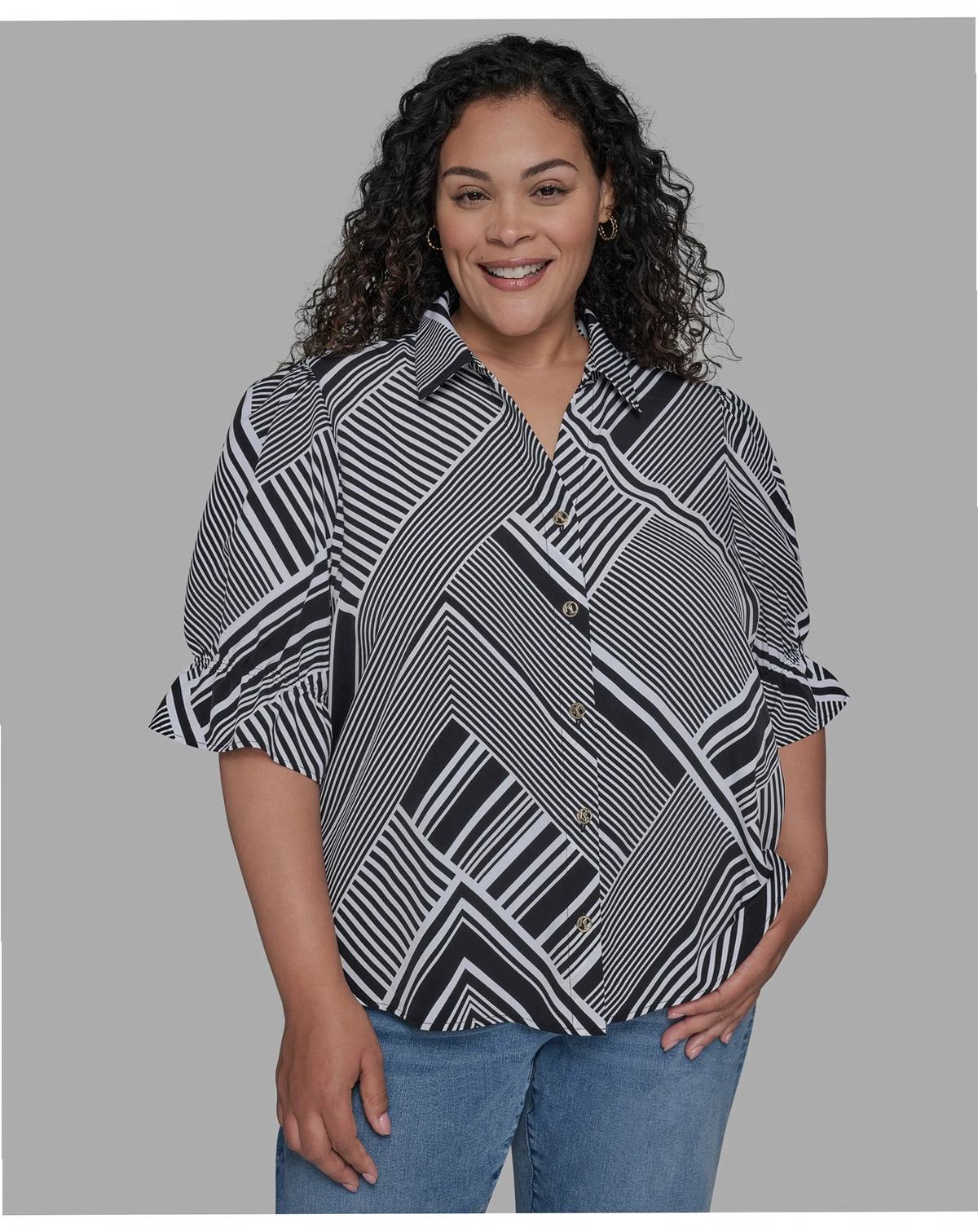A geometric print contrasts nicely with the puff-shoulder sleeves on this plus size shirt from KARL LAGERFELD PARIS.