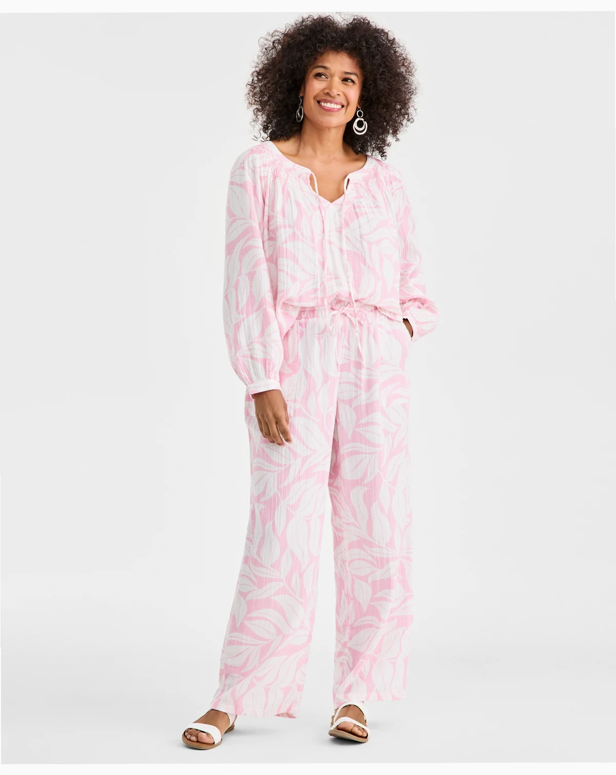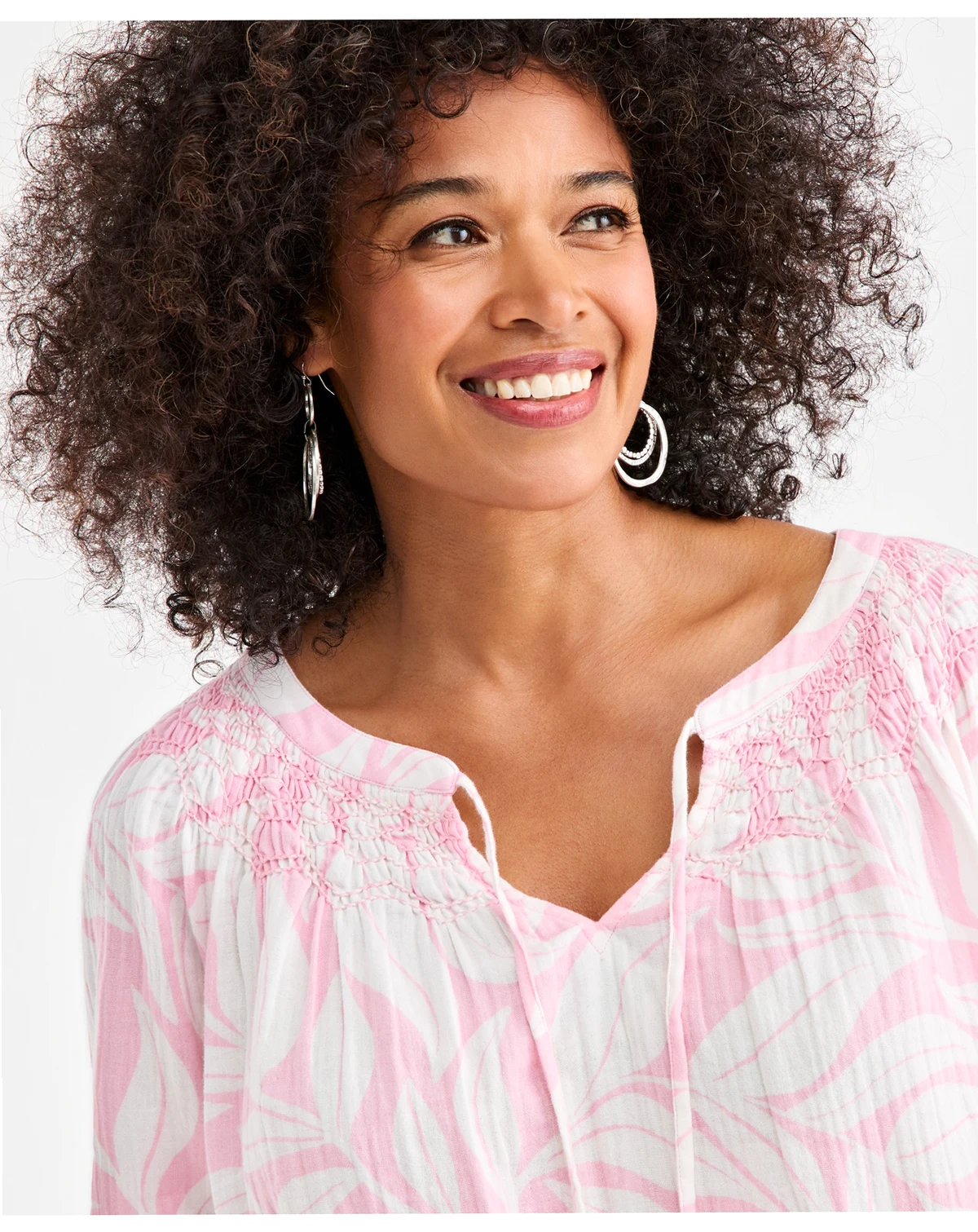 Incorporating a self-tie closure at a V-slit neckline, this printed smock blouse from Style & Co allows for an adjustable and graceful drape. Raglan long sleeves offer a relaxed and comfortable fit.