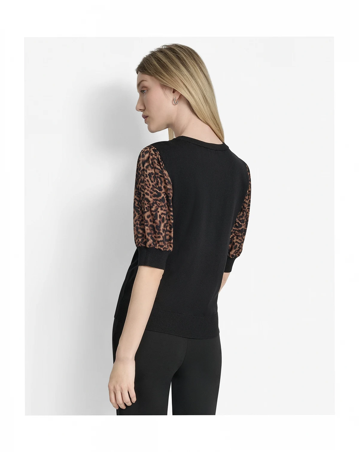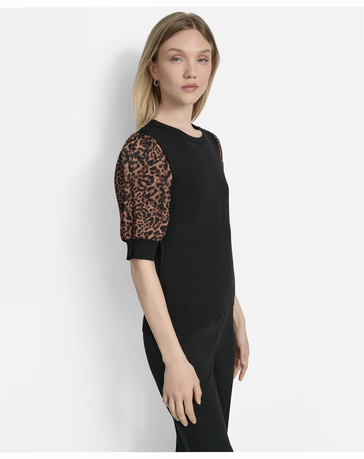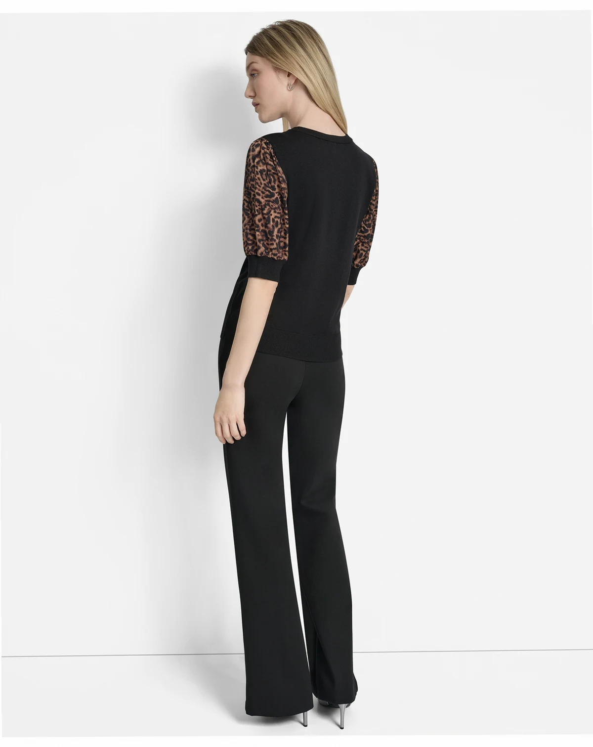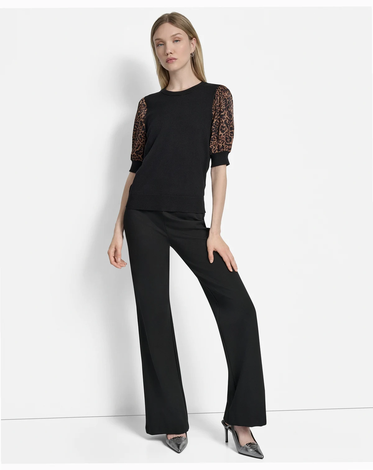 A printed sleeve perfectly frames this sleek, mixed media top by DKNY, lending a bold yet polished finish to a chic career style.