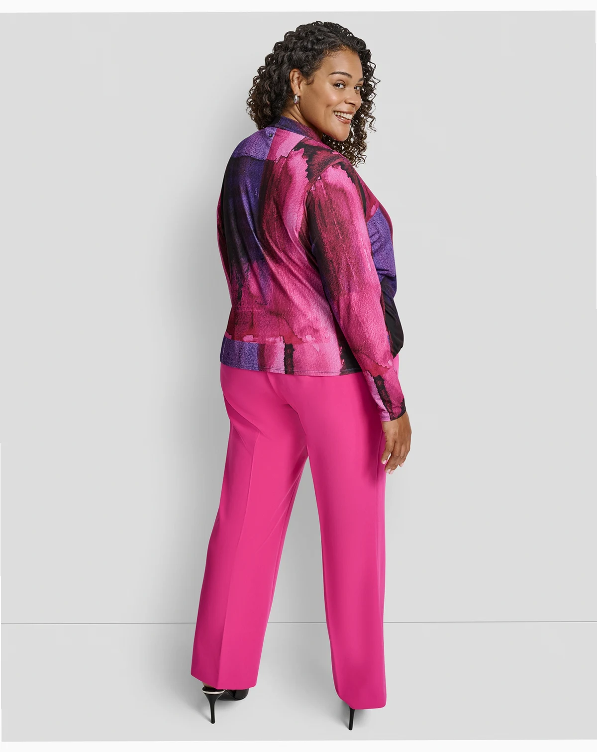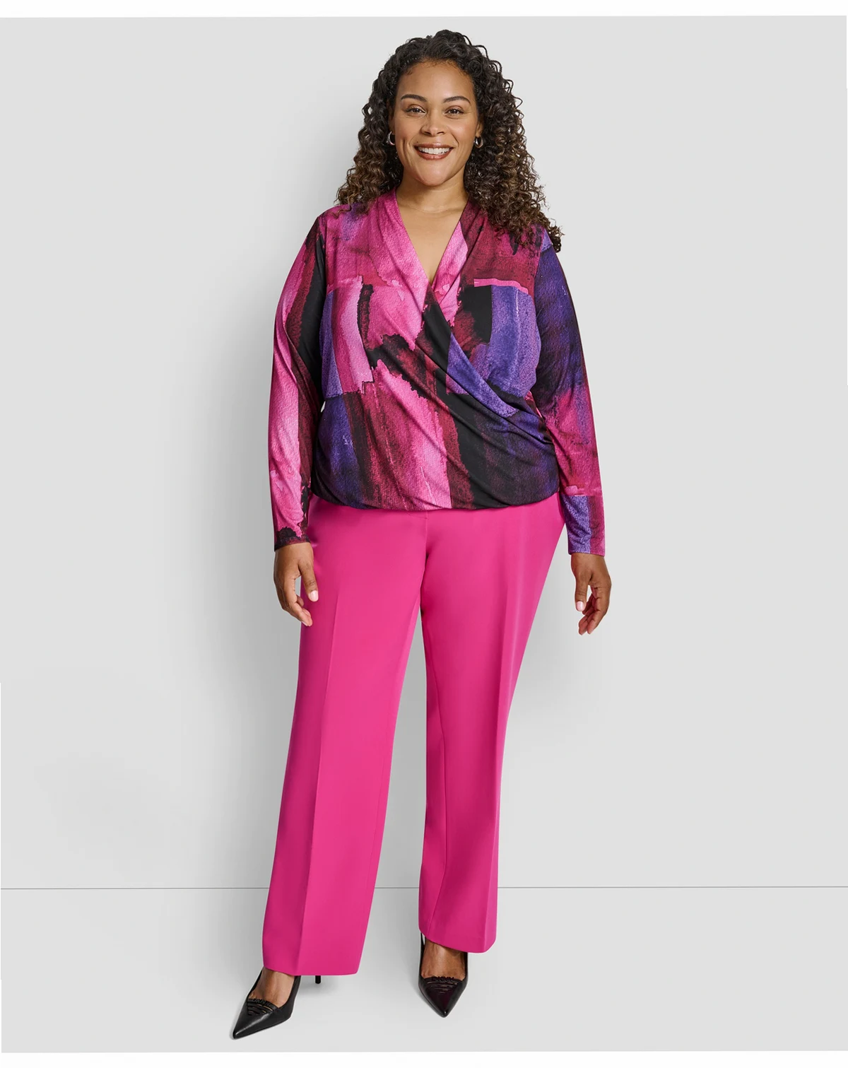 A flattering wrap top design gives this DKNY top a versatile and chic look. It is styled with a V-neck and long sleeves, and an unlined feel for comfortable wear.