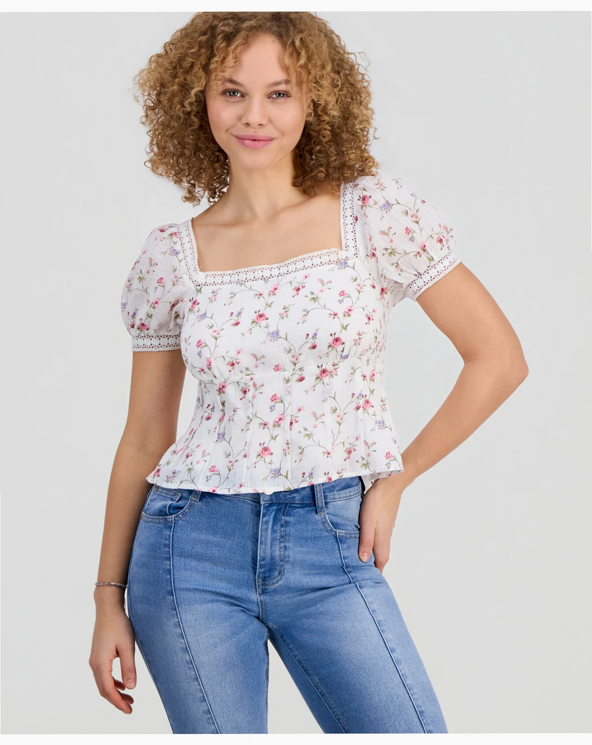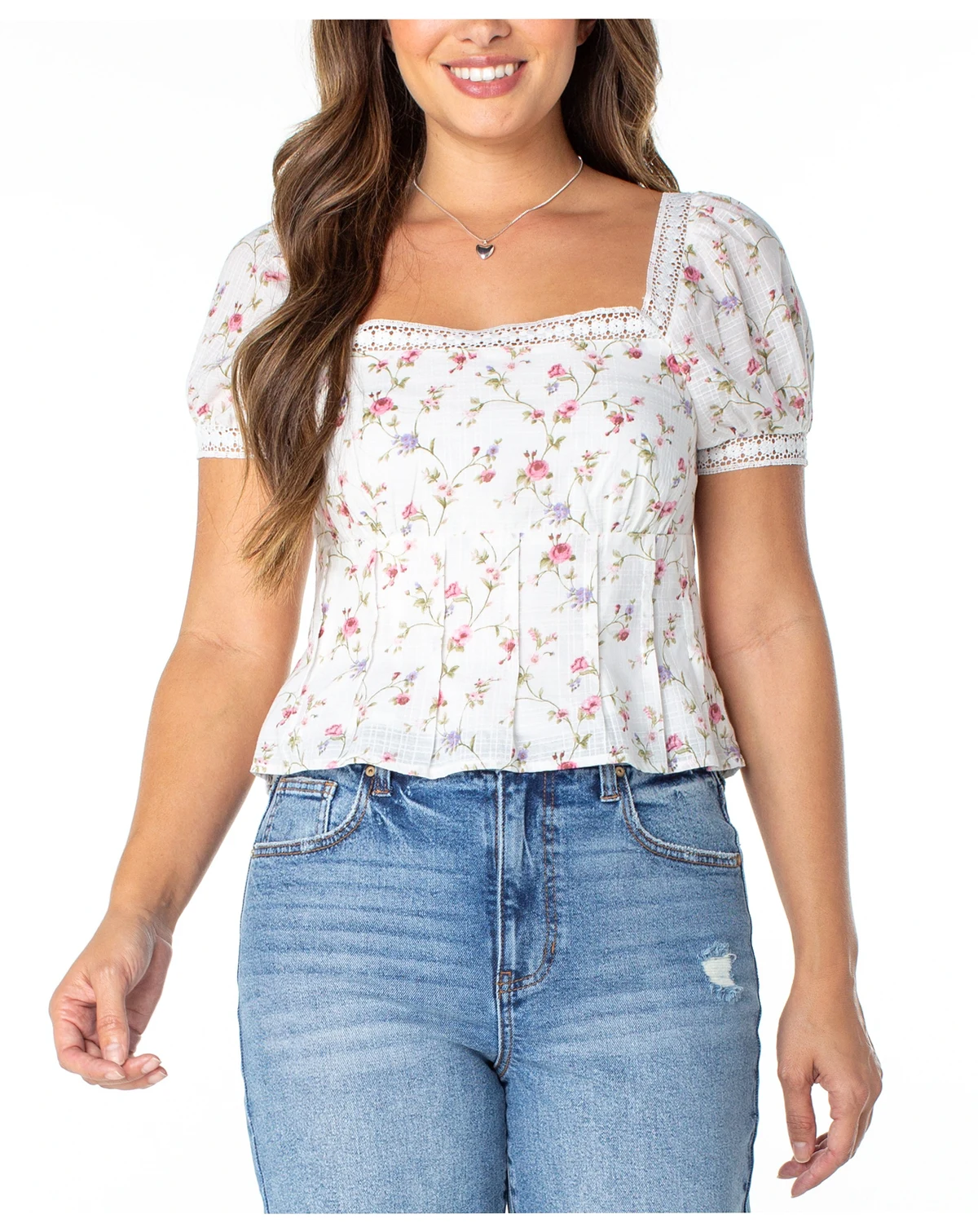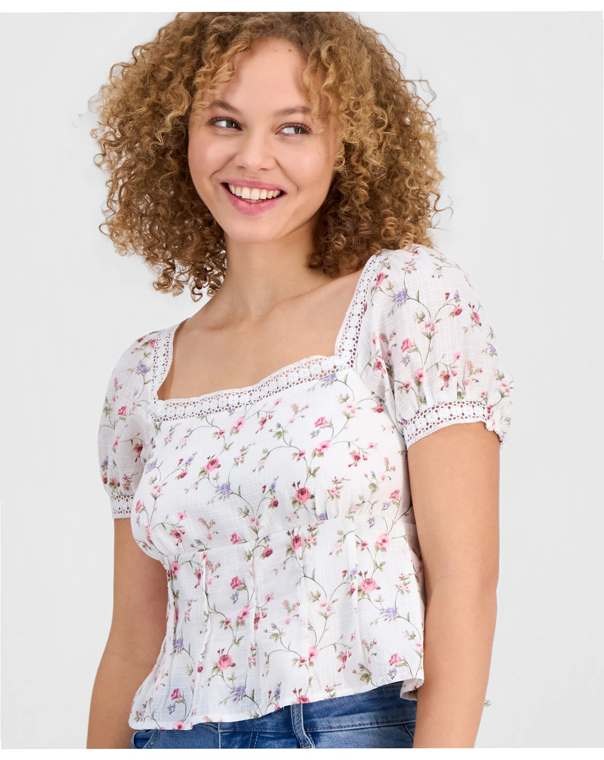 It's all about the pretty details with this Celebrity Pink top featuring a sweet print, pleats, and lace trim.