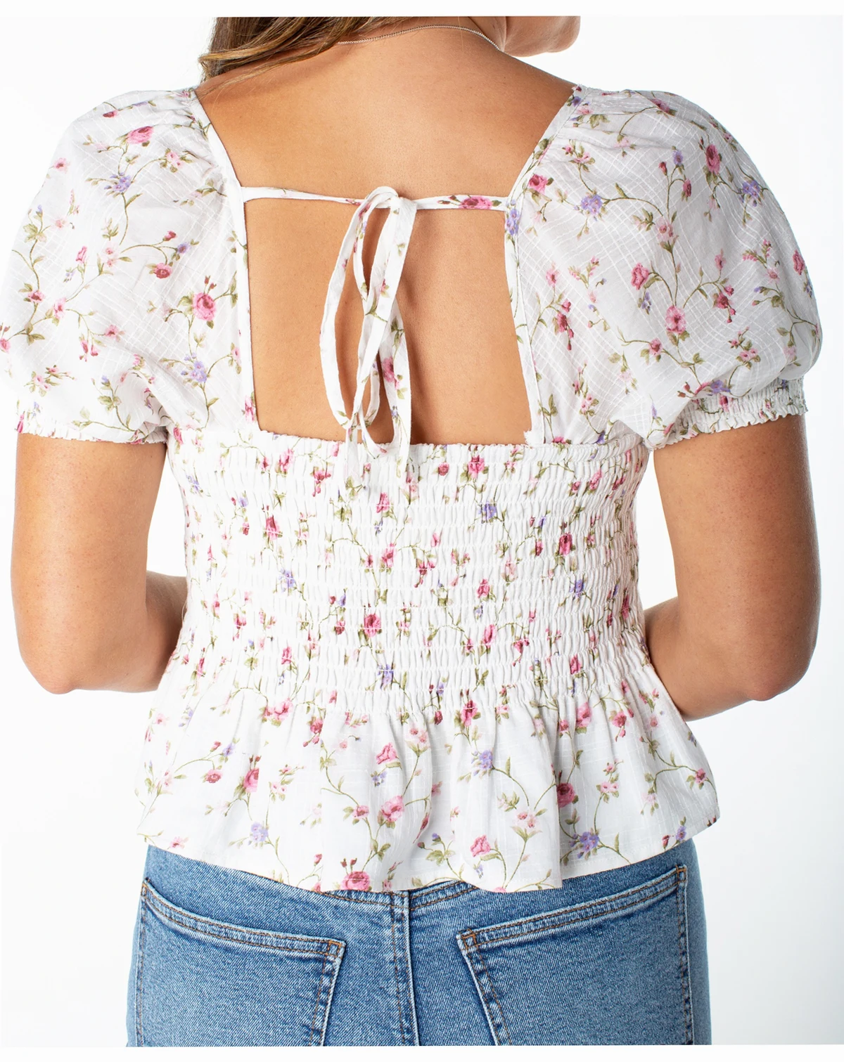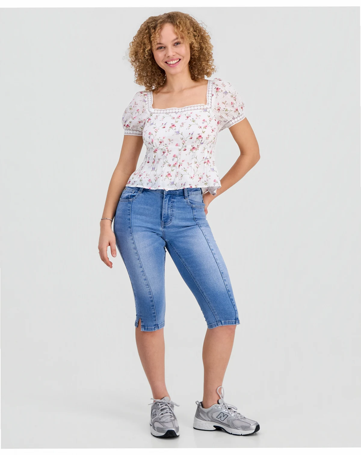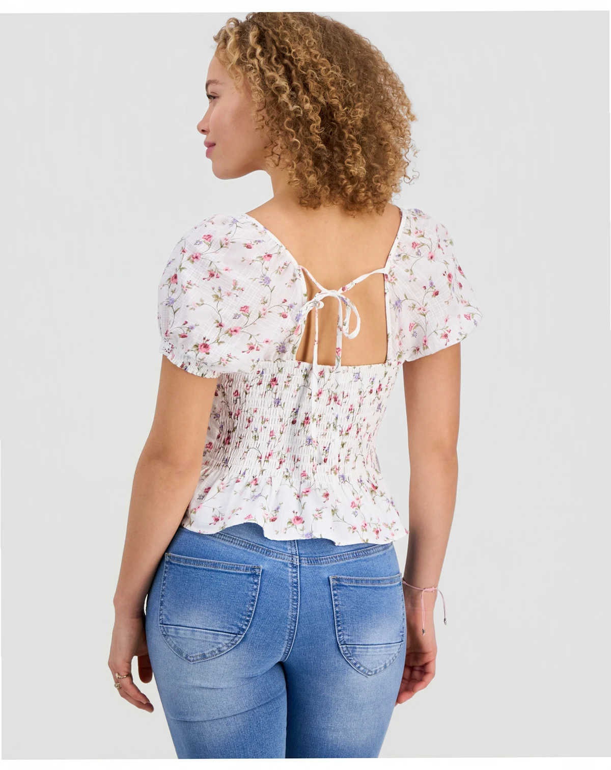 It's all about the pretty details with this Celebrity Pink top featuring a sweet print, pleats, and lace trim.