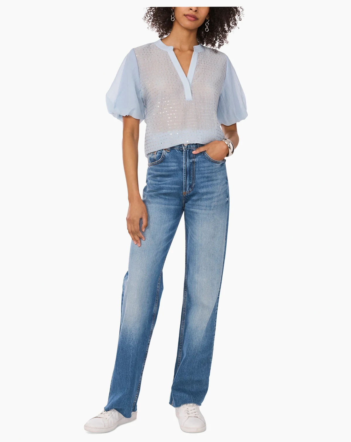 Bring a little bit of that glam vibe into your days with this puffed-sleeve top from Vince Camuto, finished with sparkling sequins. ABOUT THE BRAND: Vince Camuto is a globally renowned brand that embodies European styling. Detailed craftsmanship across the line embraces current trends while maintaining a classic aesthetic.