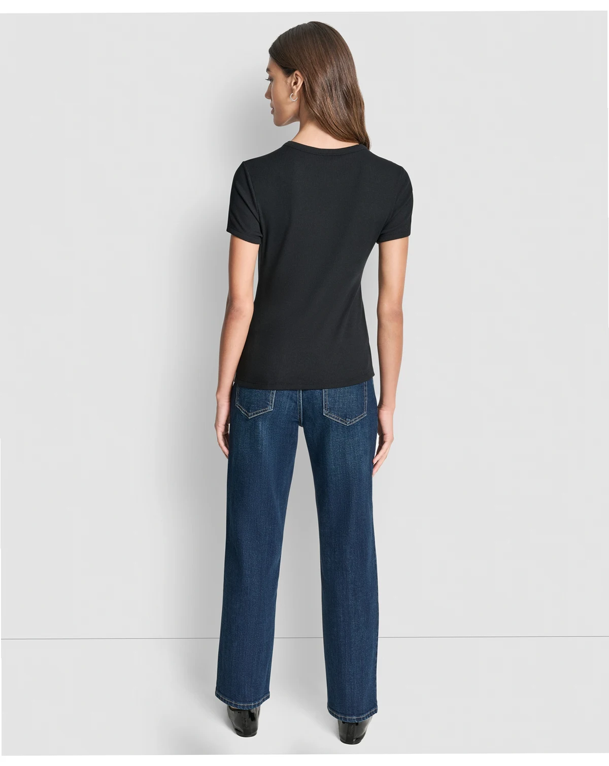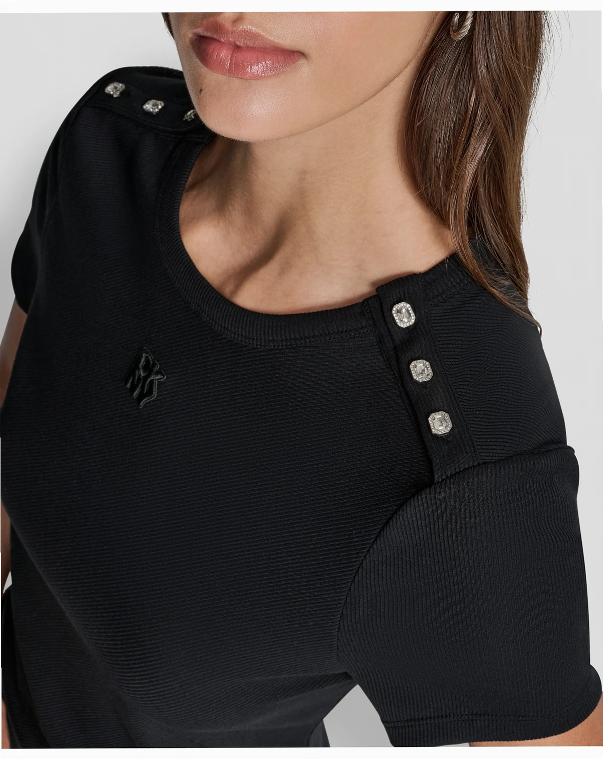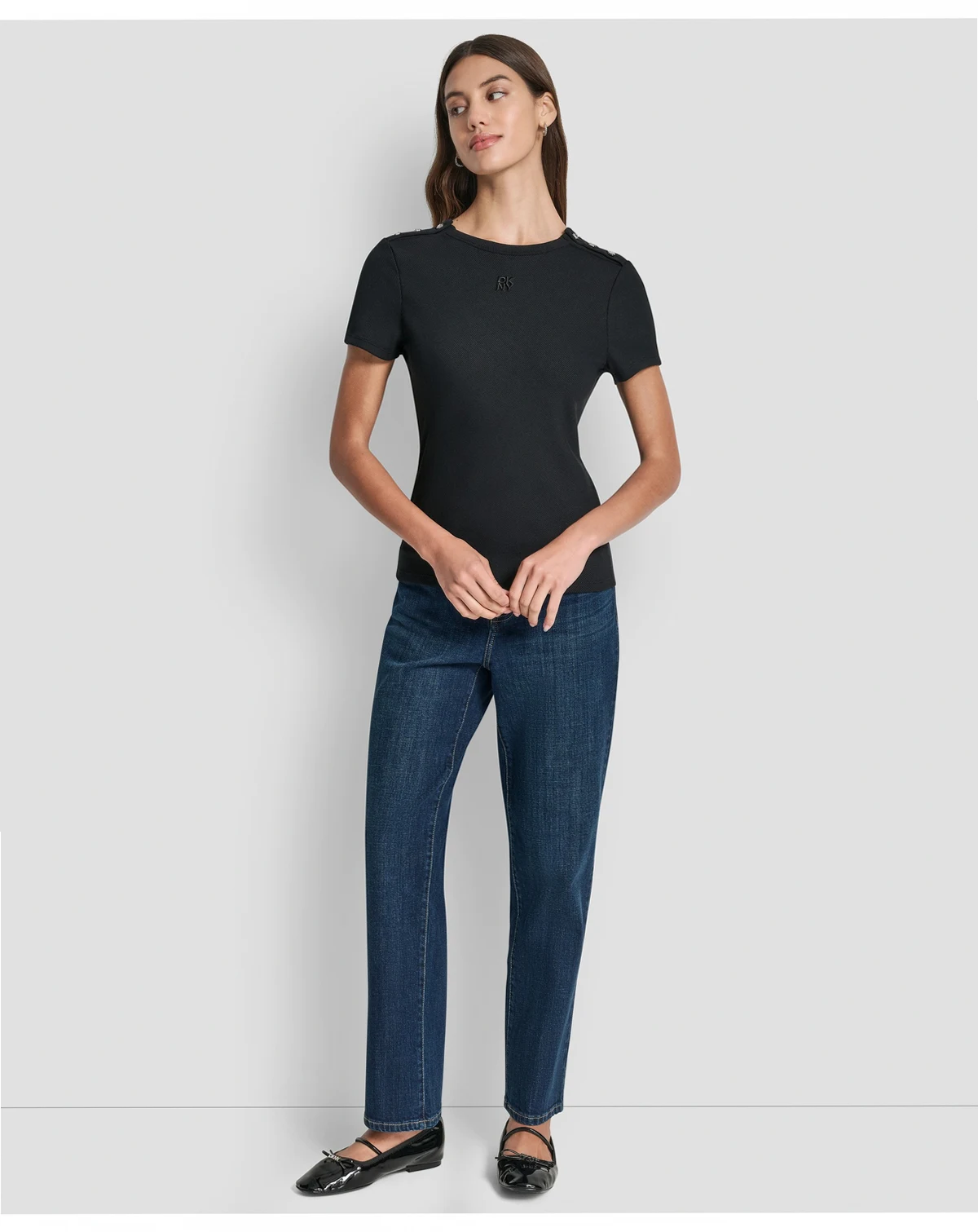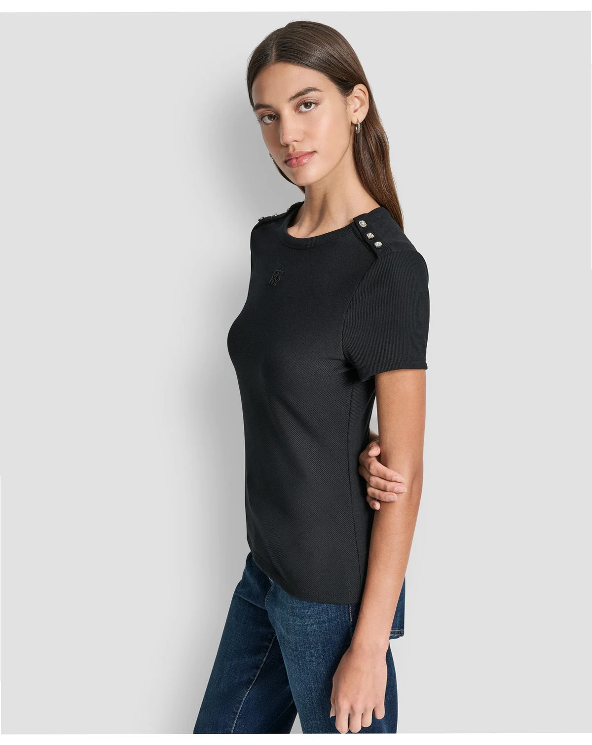 Elevate a basic tee with this DKNY Jeans T-shirt, featuring jewel button details on the shoulders and a classic crew neck. Short sleeves and a regular fit provide a simple yet sophisticated look.