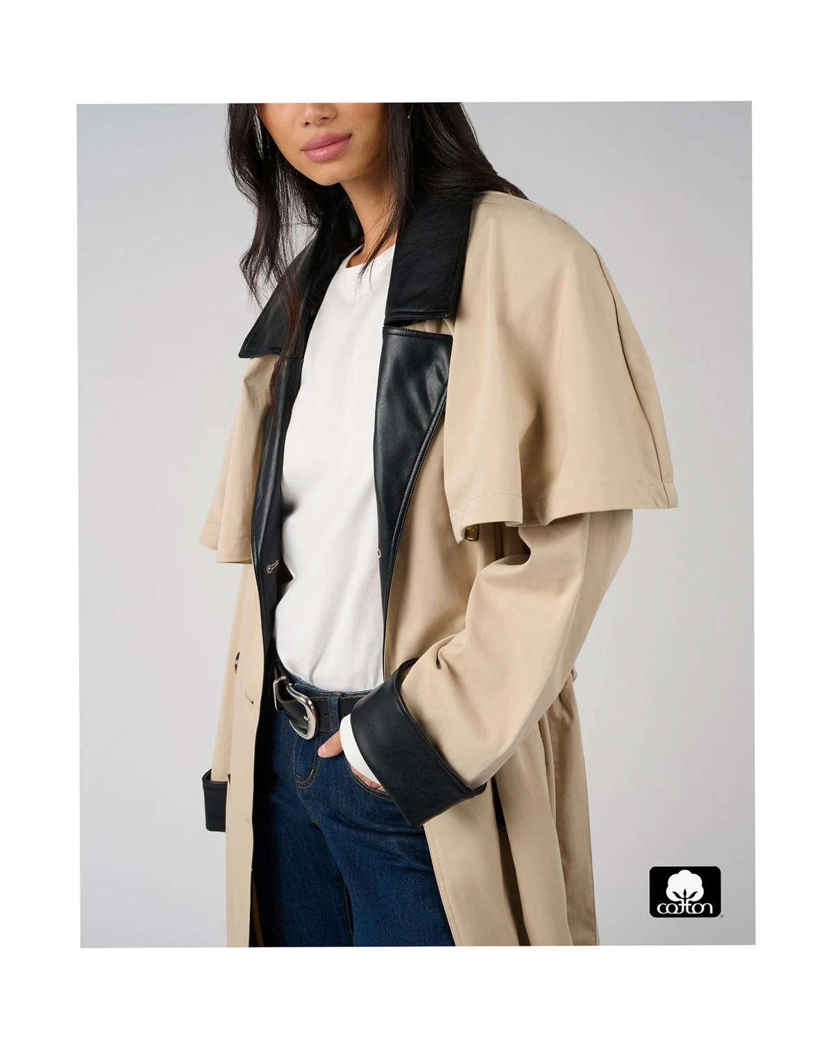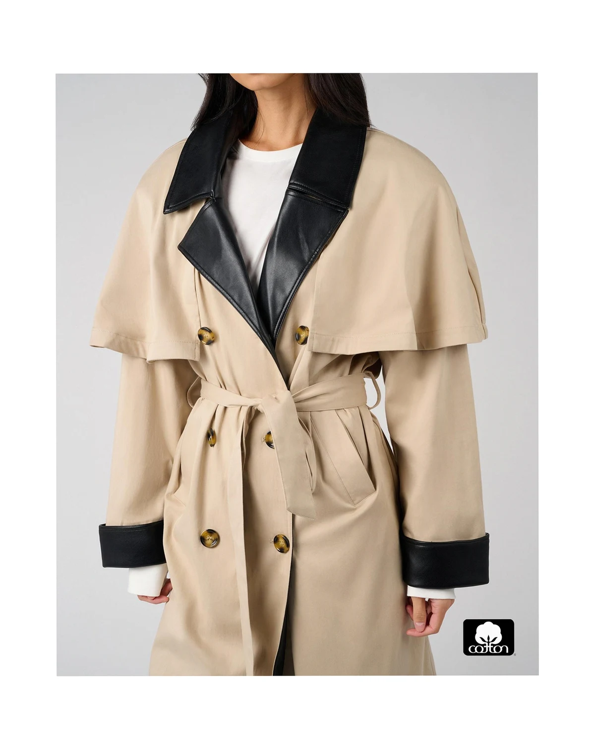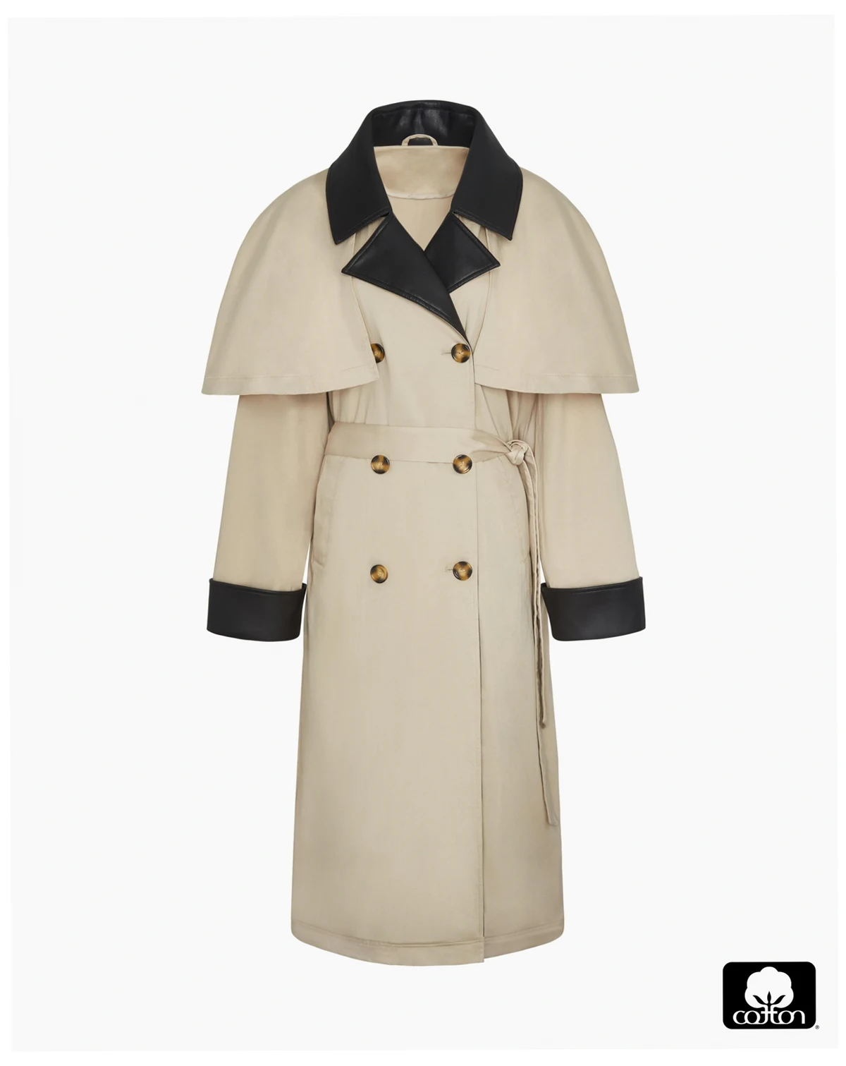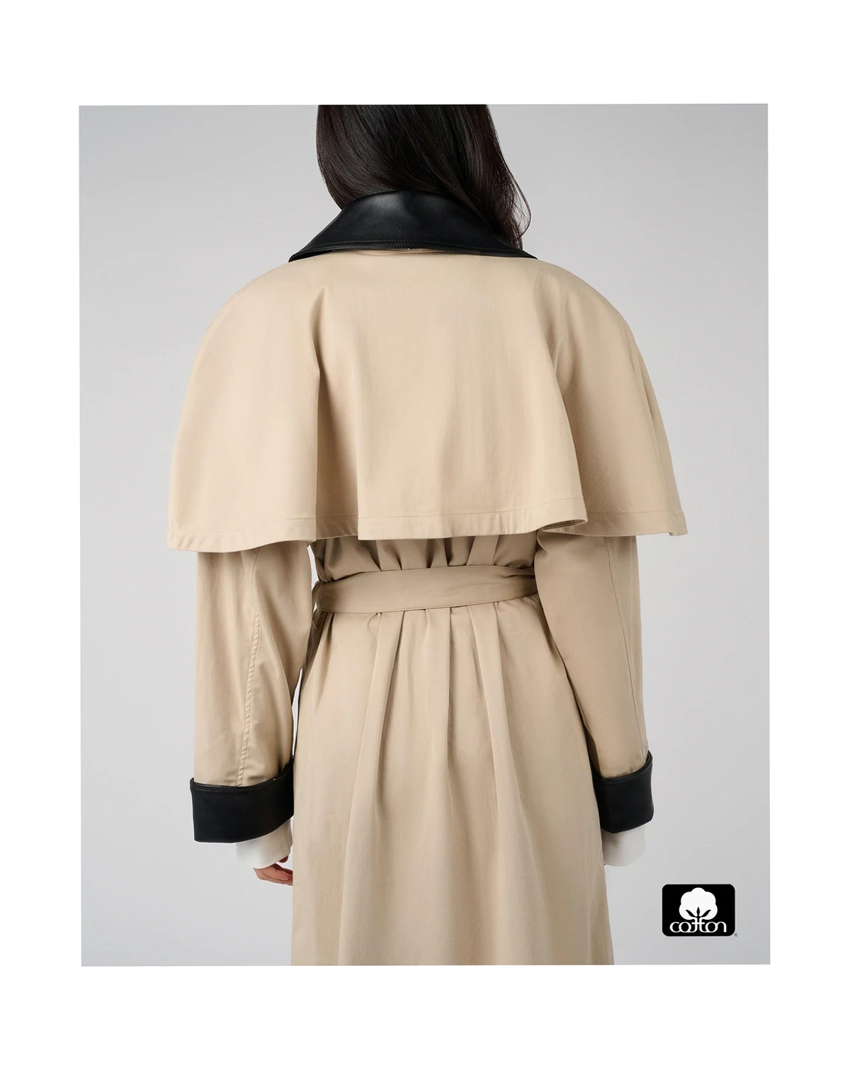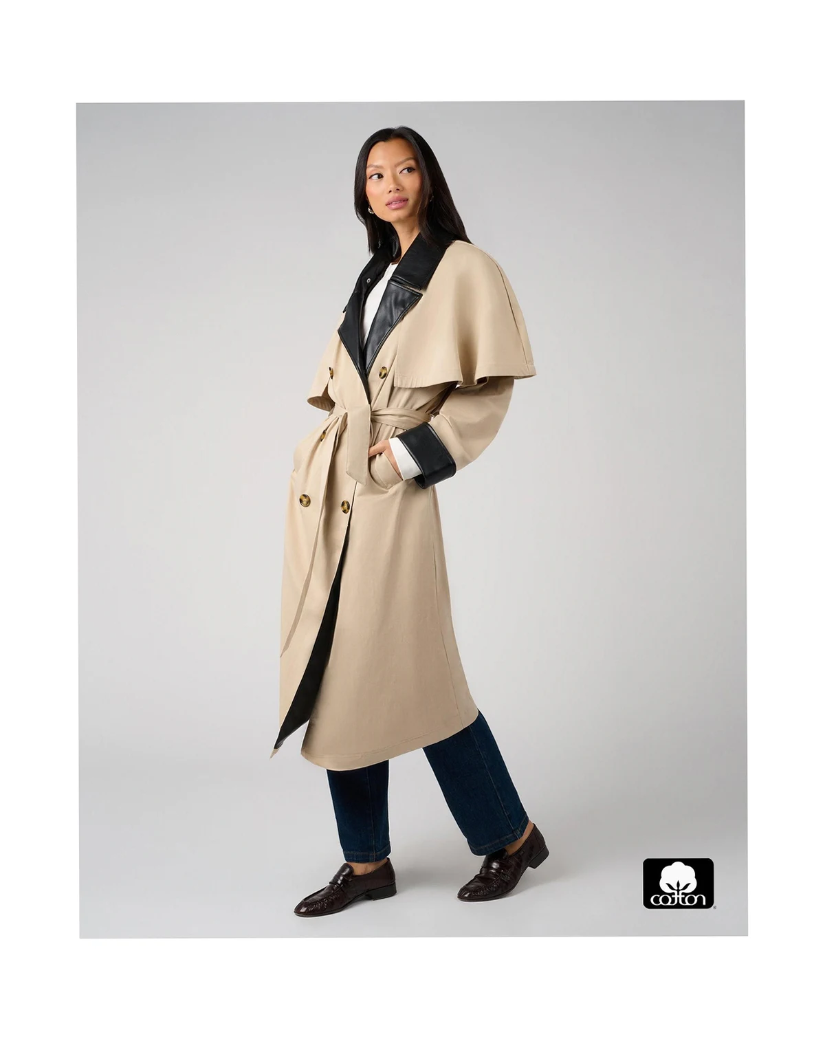 This double-breasted twill trench coat is tailored with faux leather trim for contrast. It has welt pockets, a removable cape, drop shoulders with shoulder pads and wide, cuffed sleeves.