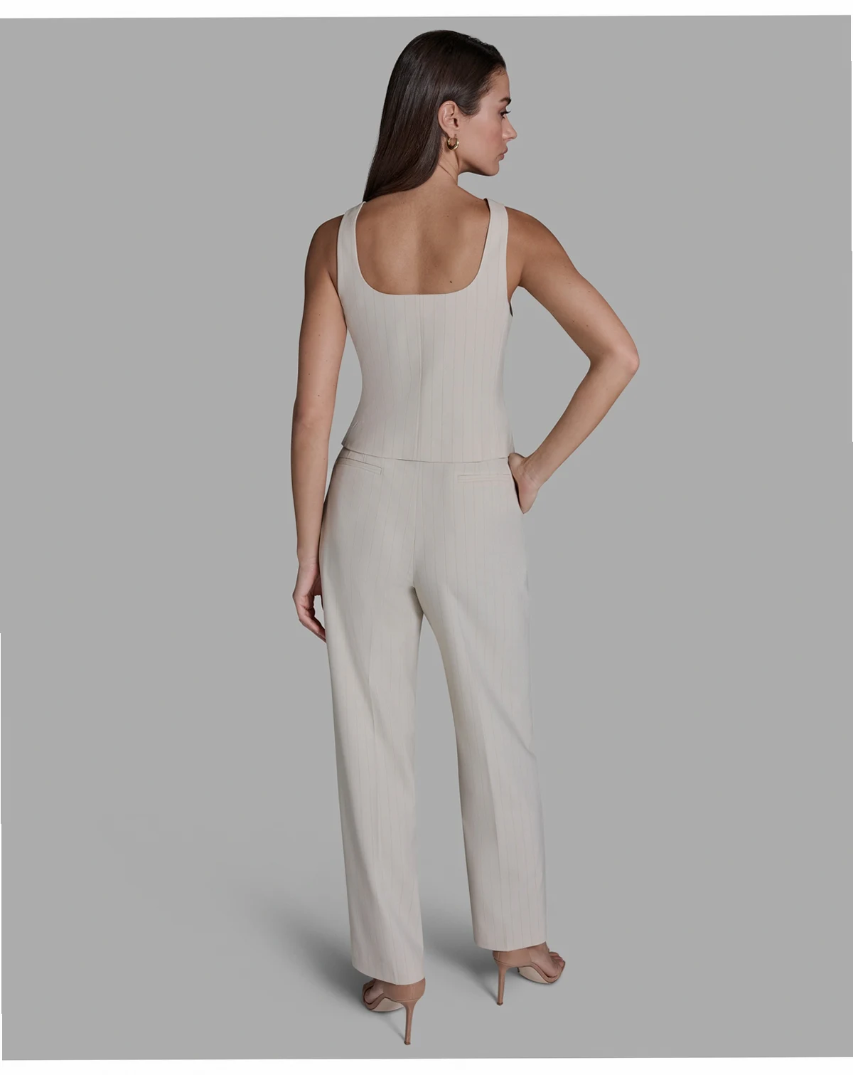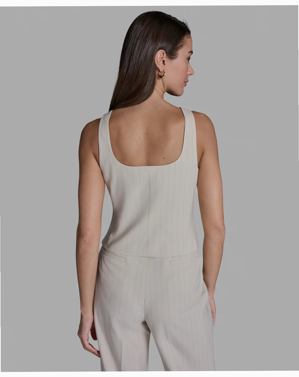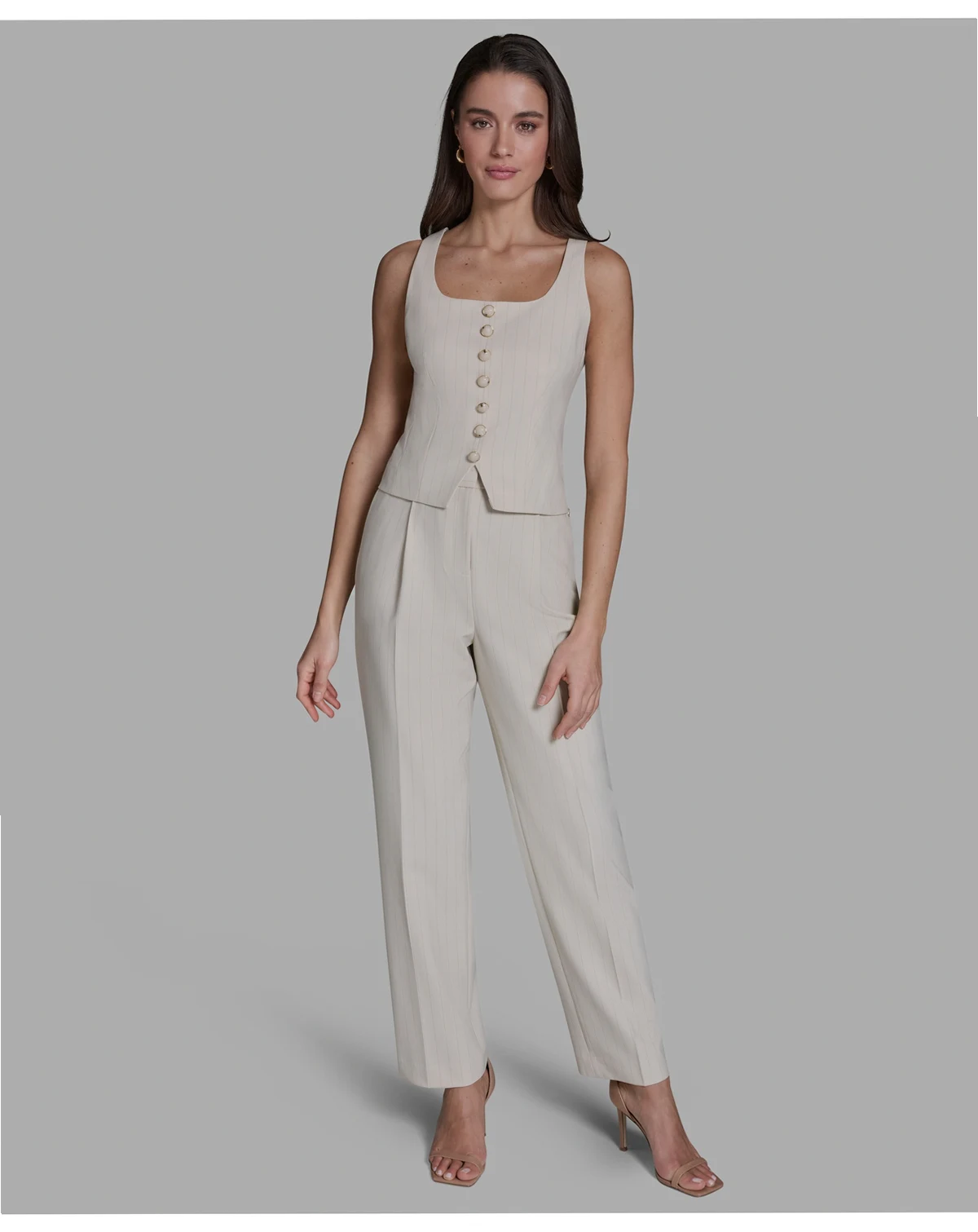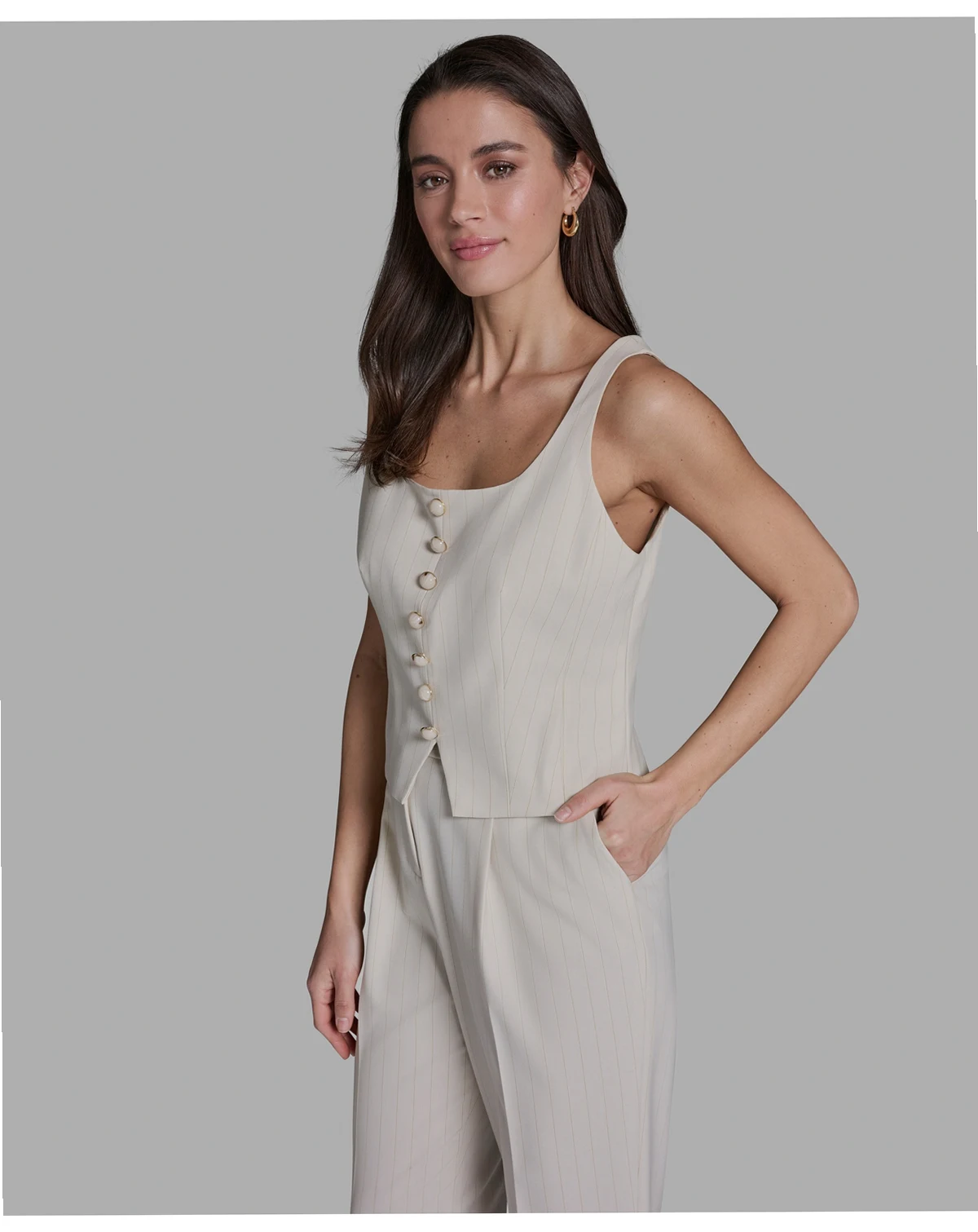 Presenting a pinstripe pattern, this button-front vest from BCBG offers a sleek, tailored layer. The sleeveless design works beautifully over blouses or tops for a sophisticated outfit.