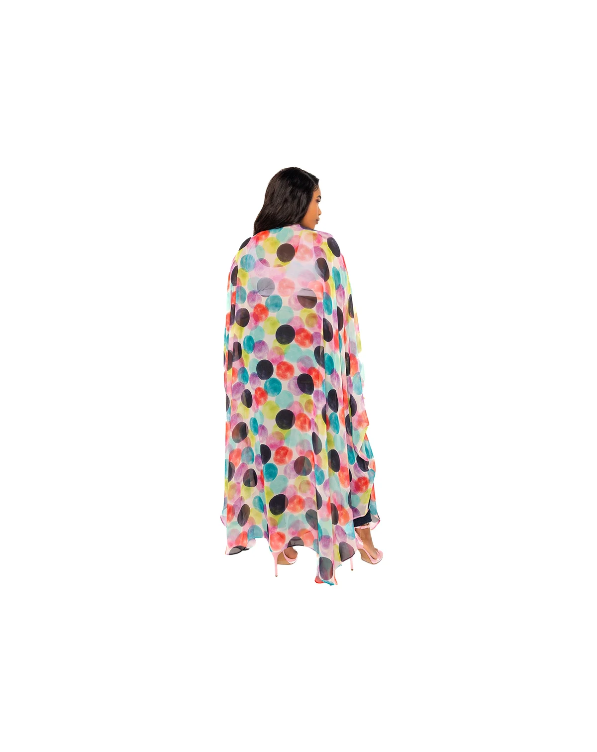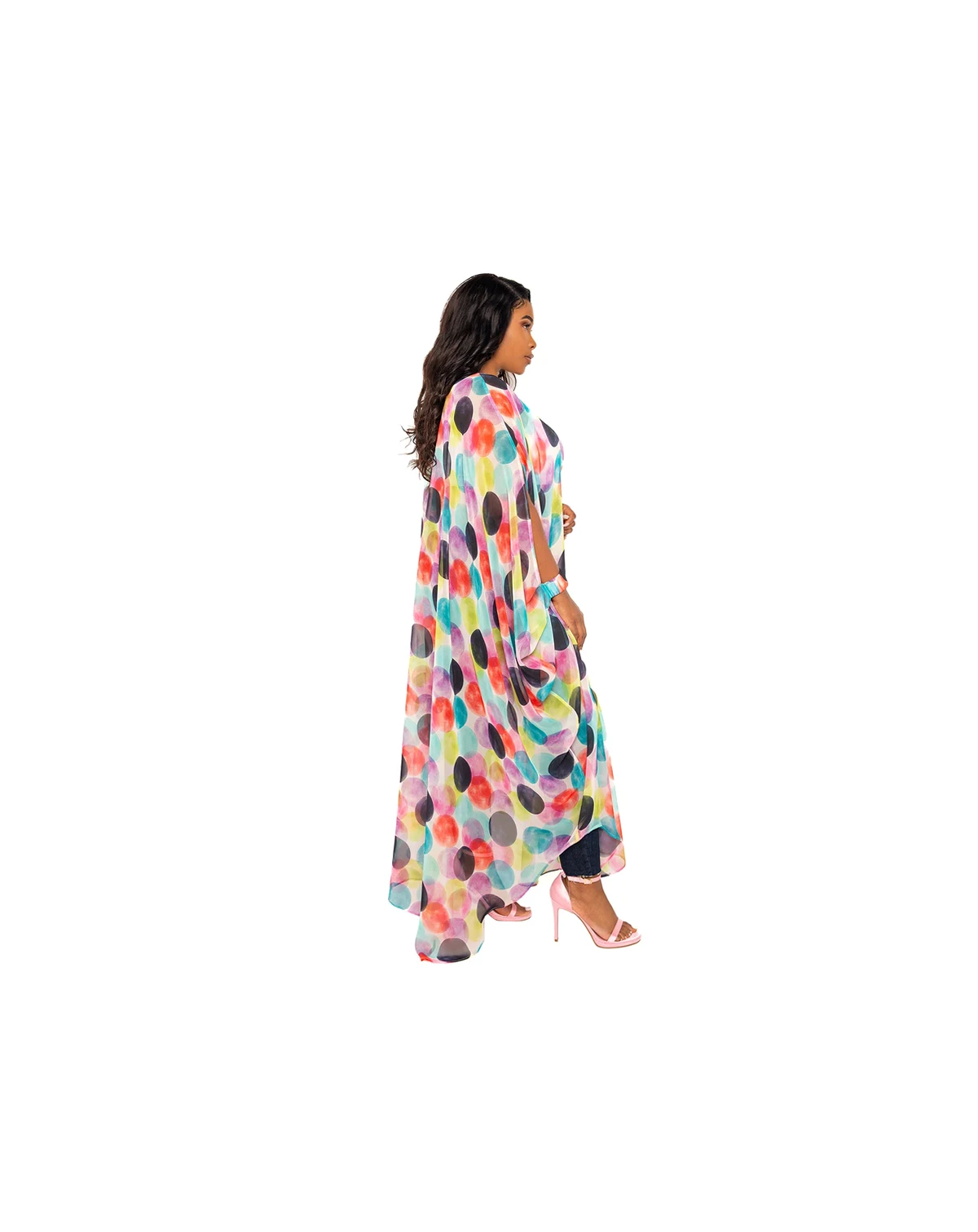 Pastel polka-dot kimono robe with wrist bands crafted from lightweight and flowy fabric. Its relaxed fit and open front design makes it perfect for layering.