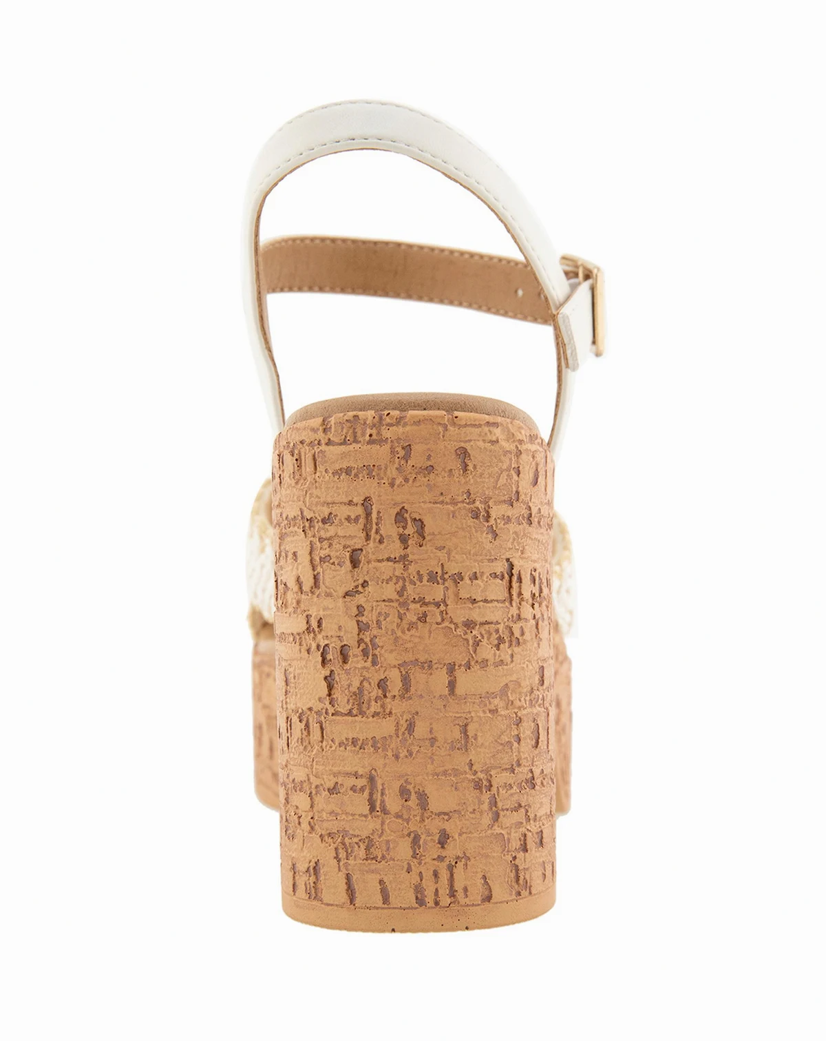The Sanya is a statement platform sandal featuring stitched criss cross straps and an adjustable ankle closure, blending bold height with refined, everyday wearability.