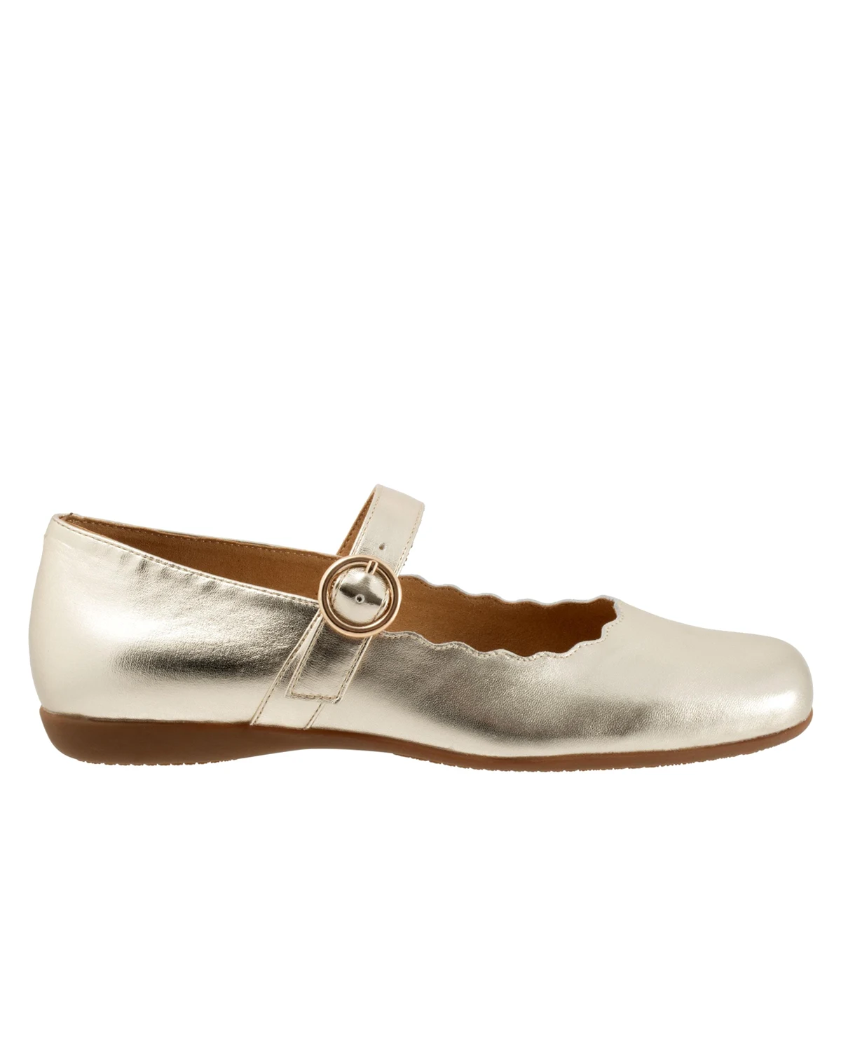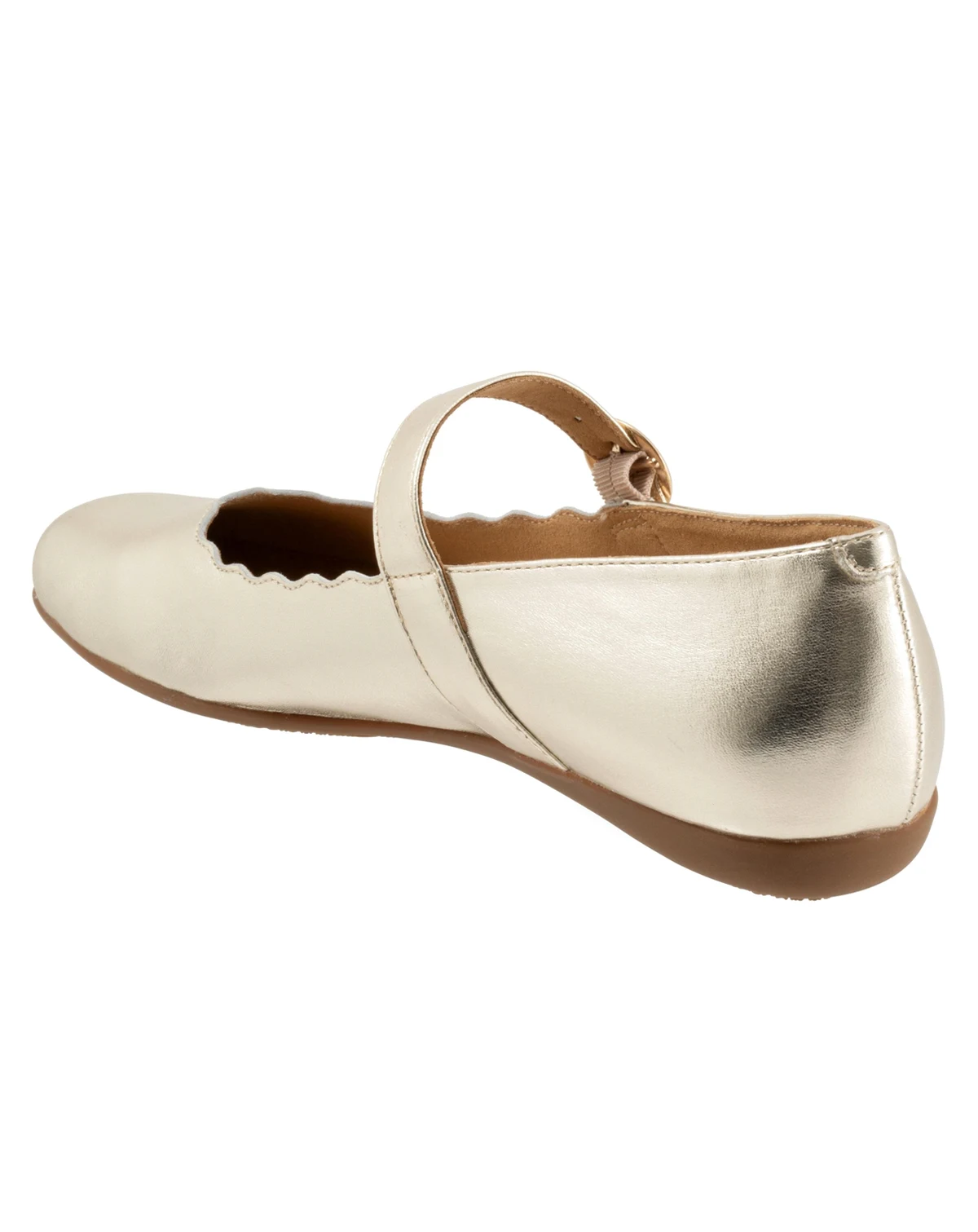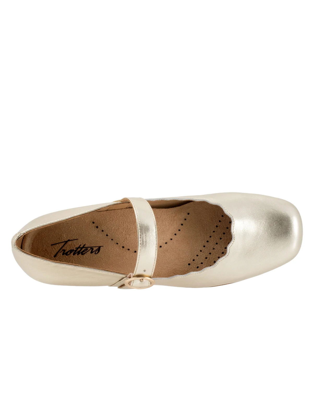The Sugar flat sure is sweet with its stylish scalloped topline. The sure fit Mary Jane makes it the perfect flat for walking. The removable footbed is cushioned and has arch support. The long-wearing sole is a Trotters best seller.