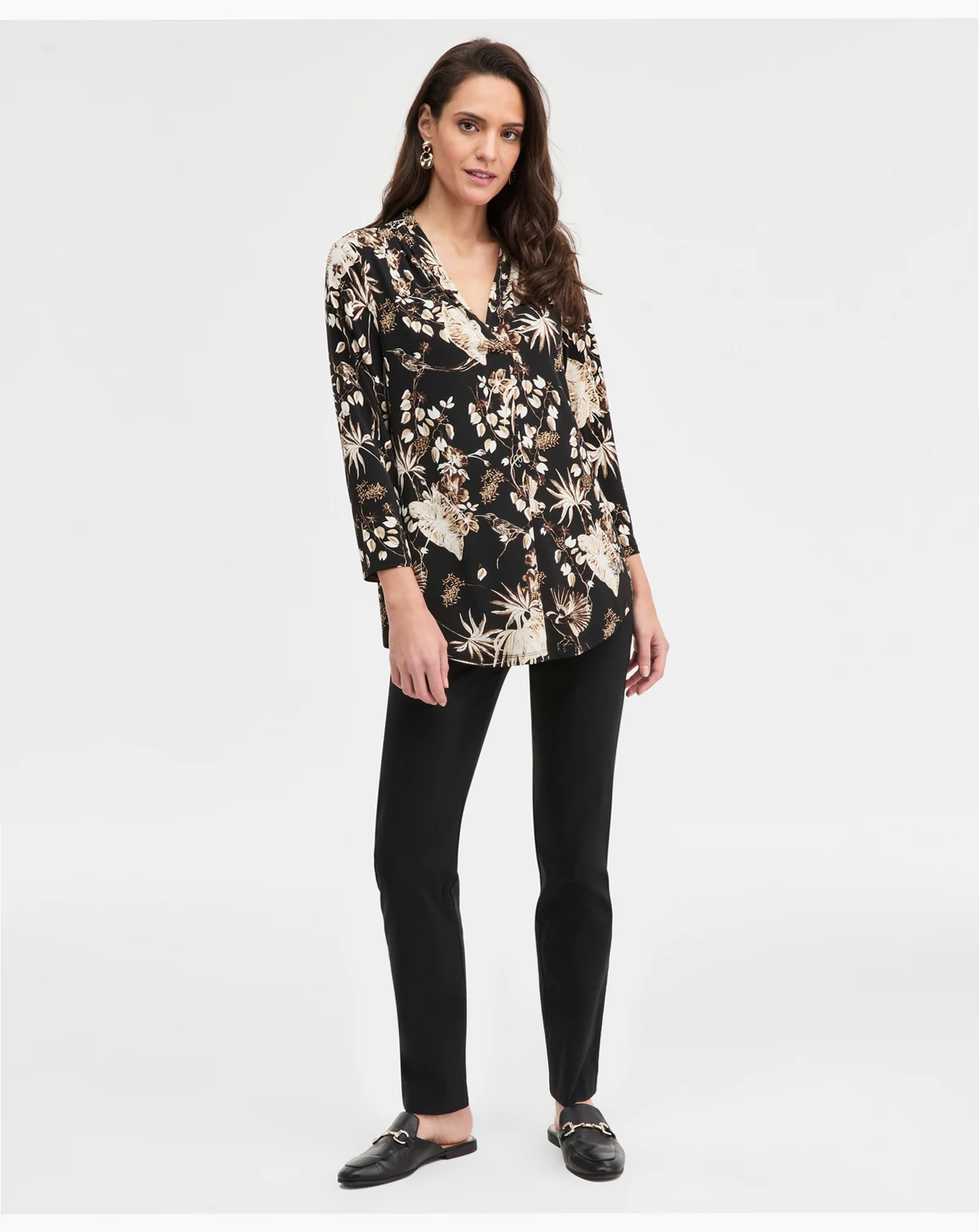 Crafted from a soft and fluid fabric, this JM Collection top presents a relaxed v-neck and 3/4-sleeve silhouette. The easy pull-on design ensures comfortable and versatile wear for various occasions.