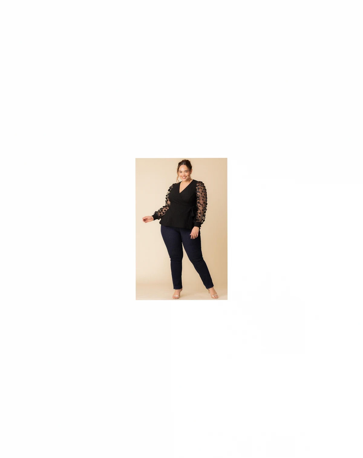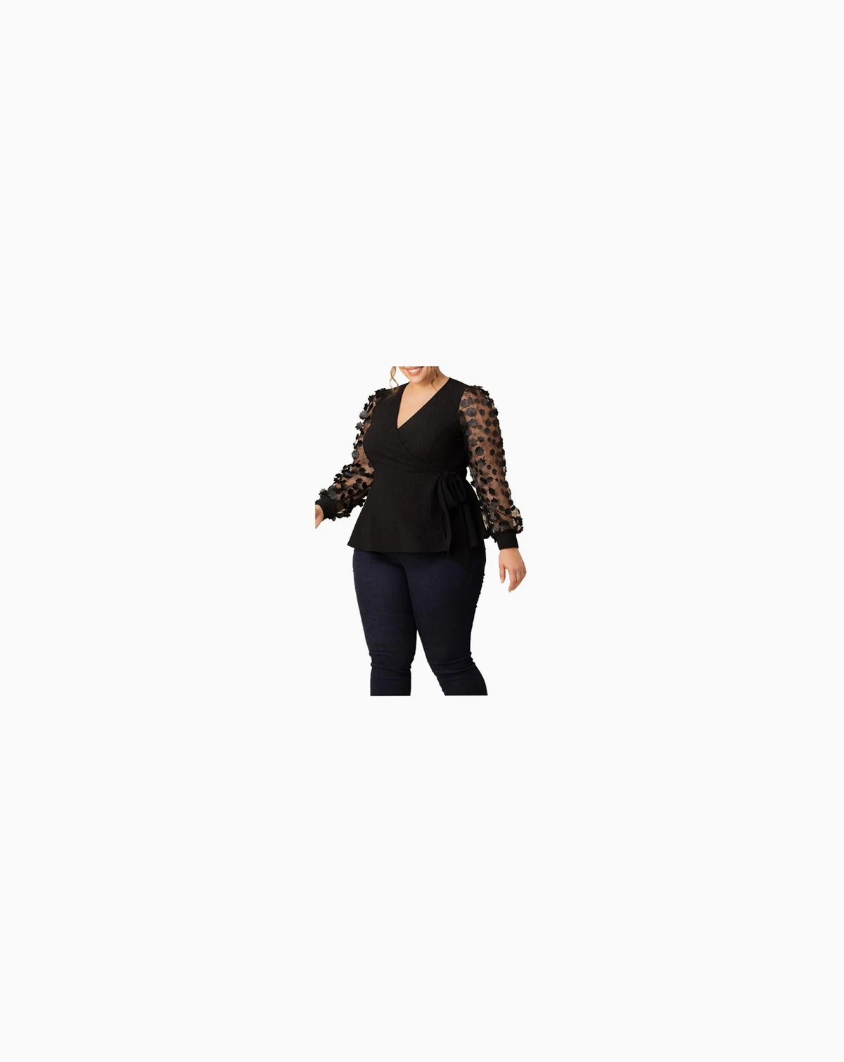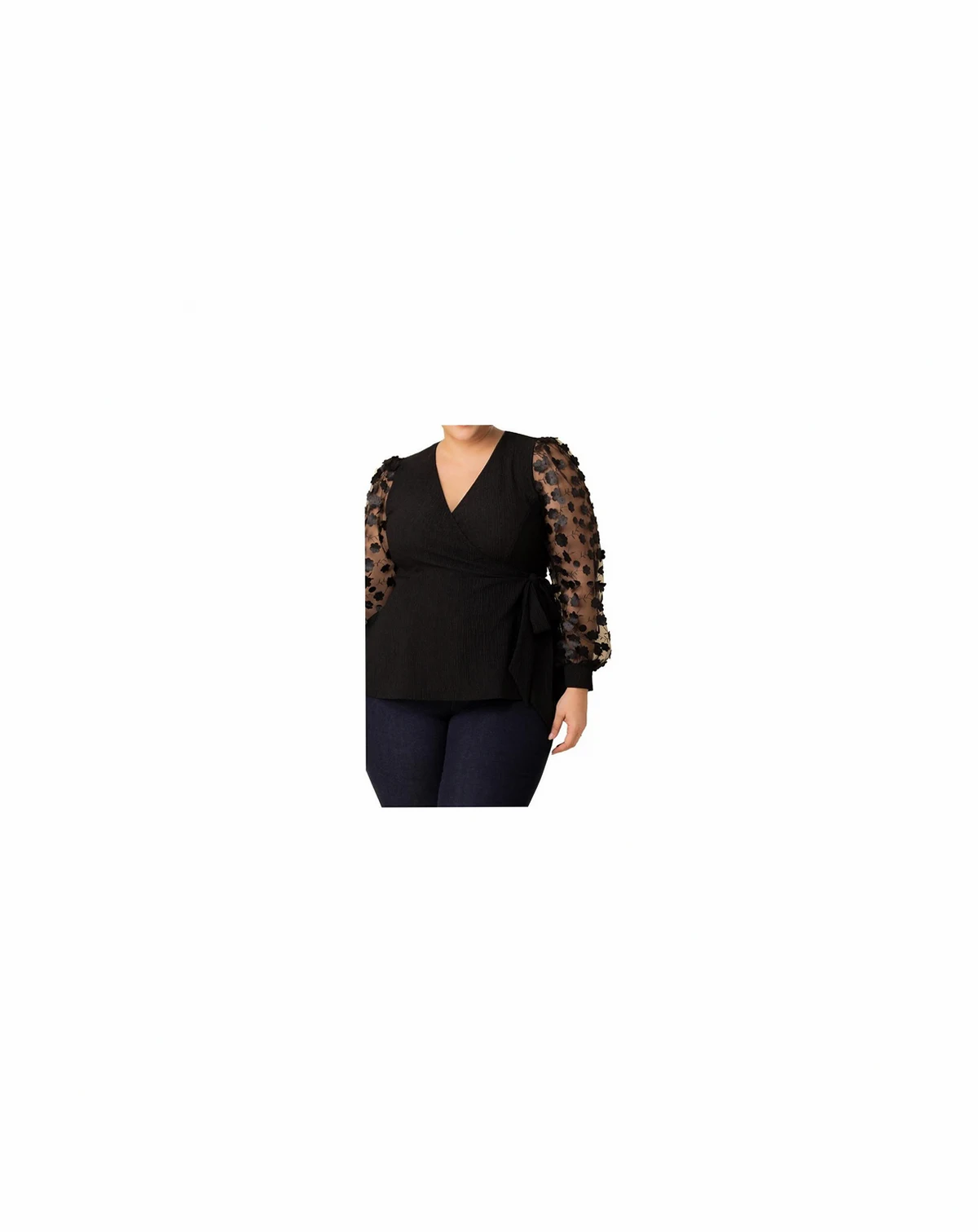 Wrap yourself in elegance with the Plus Size Scattered Petals Long Sleeve Wrap Top. This plus size blouse features a true wrap design that flatters your curves, while sheer mesh long blouson sleeves adorned with delicate 3-D flowers add a romantic touch. A crossover V-neckline and flowy peplum create an effortlessly feminine silhouette, finished with cuffed sleeves for a polished look.