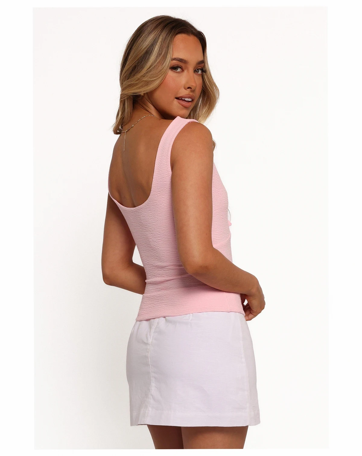 This V-neck tank top is designed for those who value both comfort and style. The bust bow tie feature adds a touch of elegance, making it perfect for everything from casual brunches to evening outings.