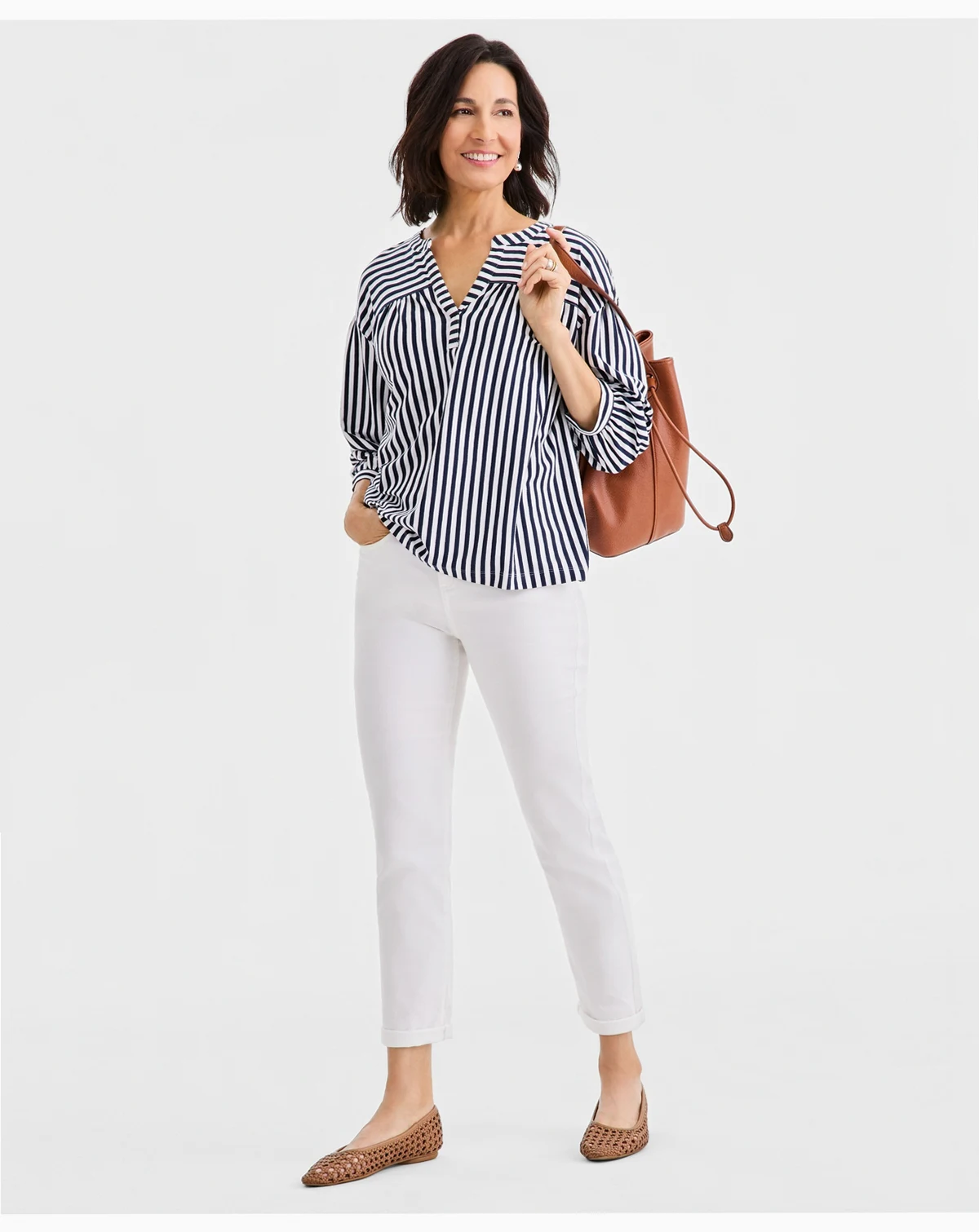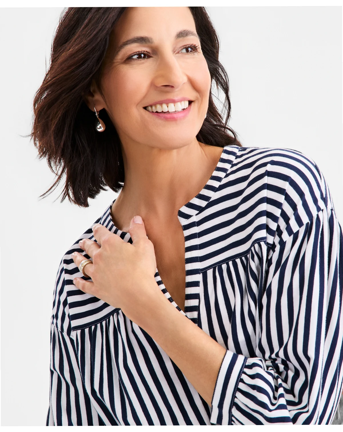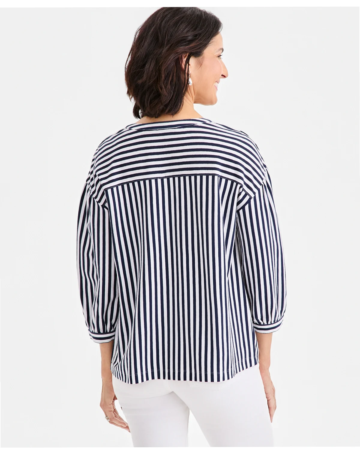 Start something stylish in this petite knit top from Style & Co designed with bold stripes and puff sleeves.