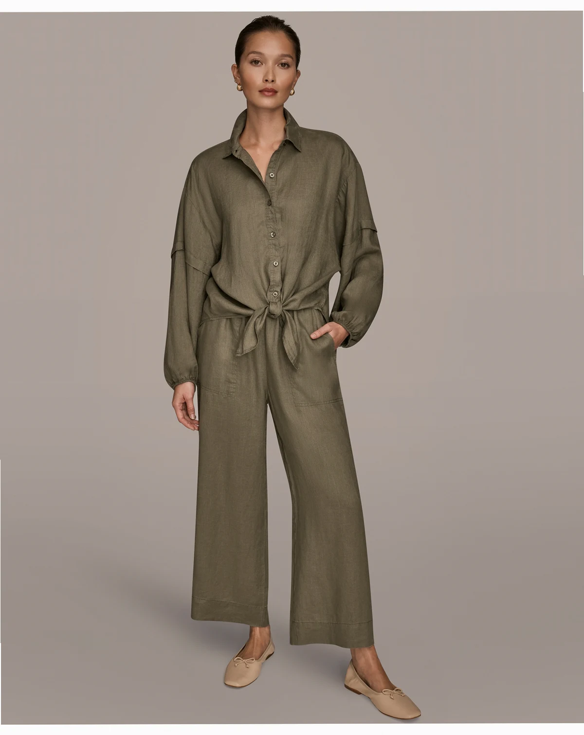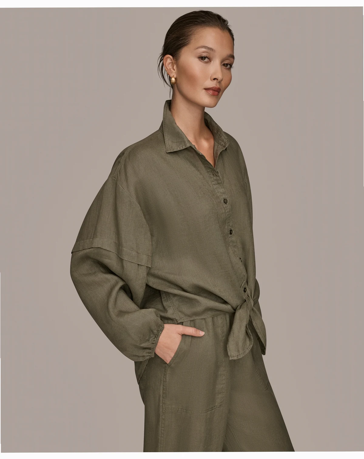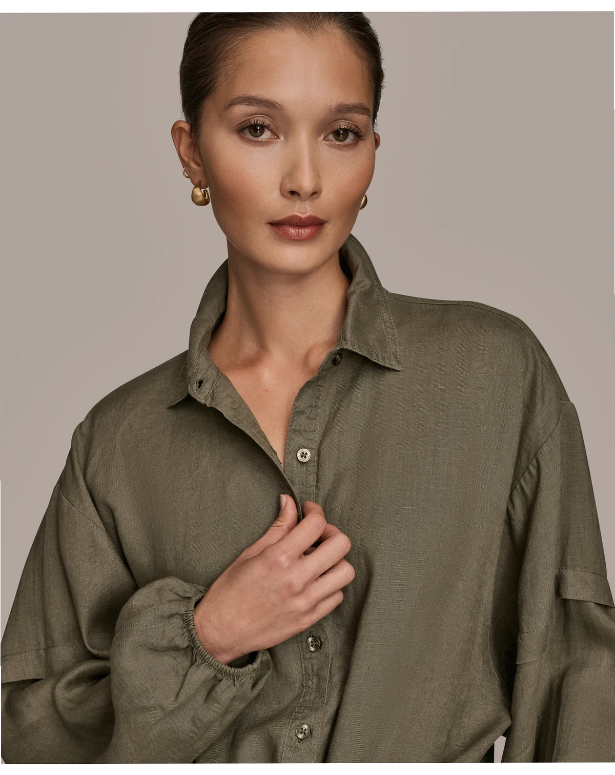 Effortless elegance defines the Donna Karan New York Women's Linen Long Blouson Sleeve Button Adjustable Tie Shirt, crafted from lightweight linen with blouson sleeves and an adjustable tie waist. Perfect for summer holidays, casual workdays, or resort evenings.