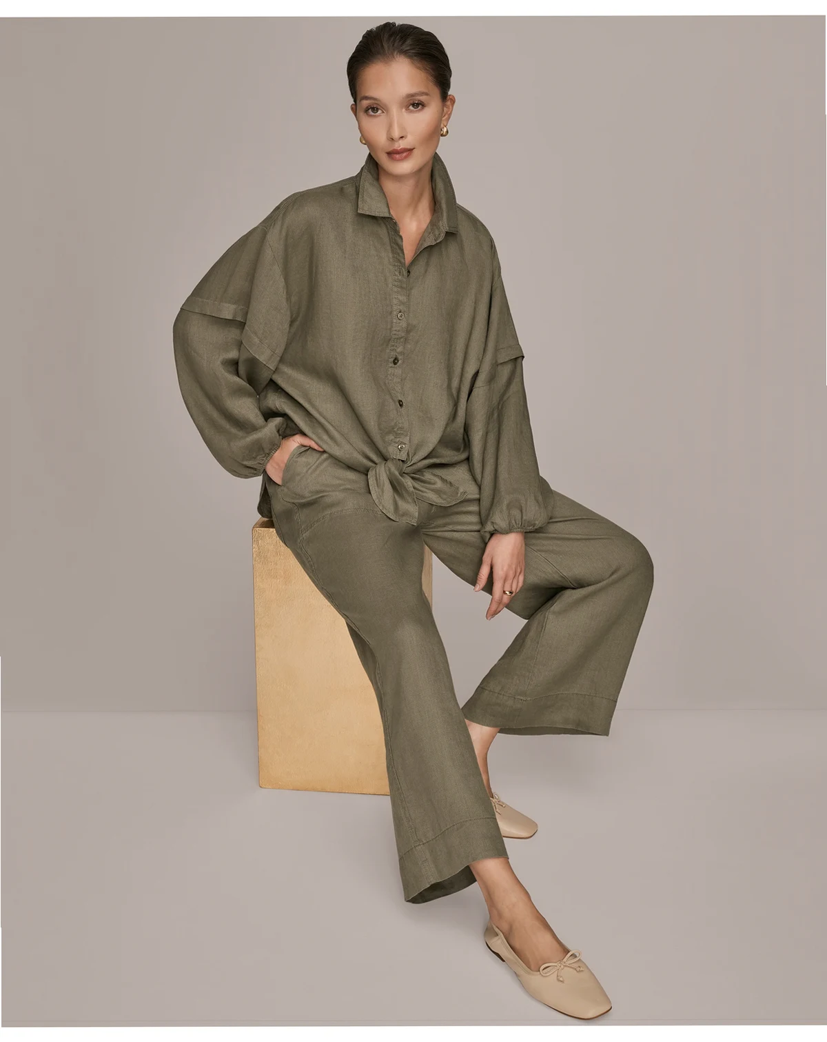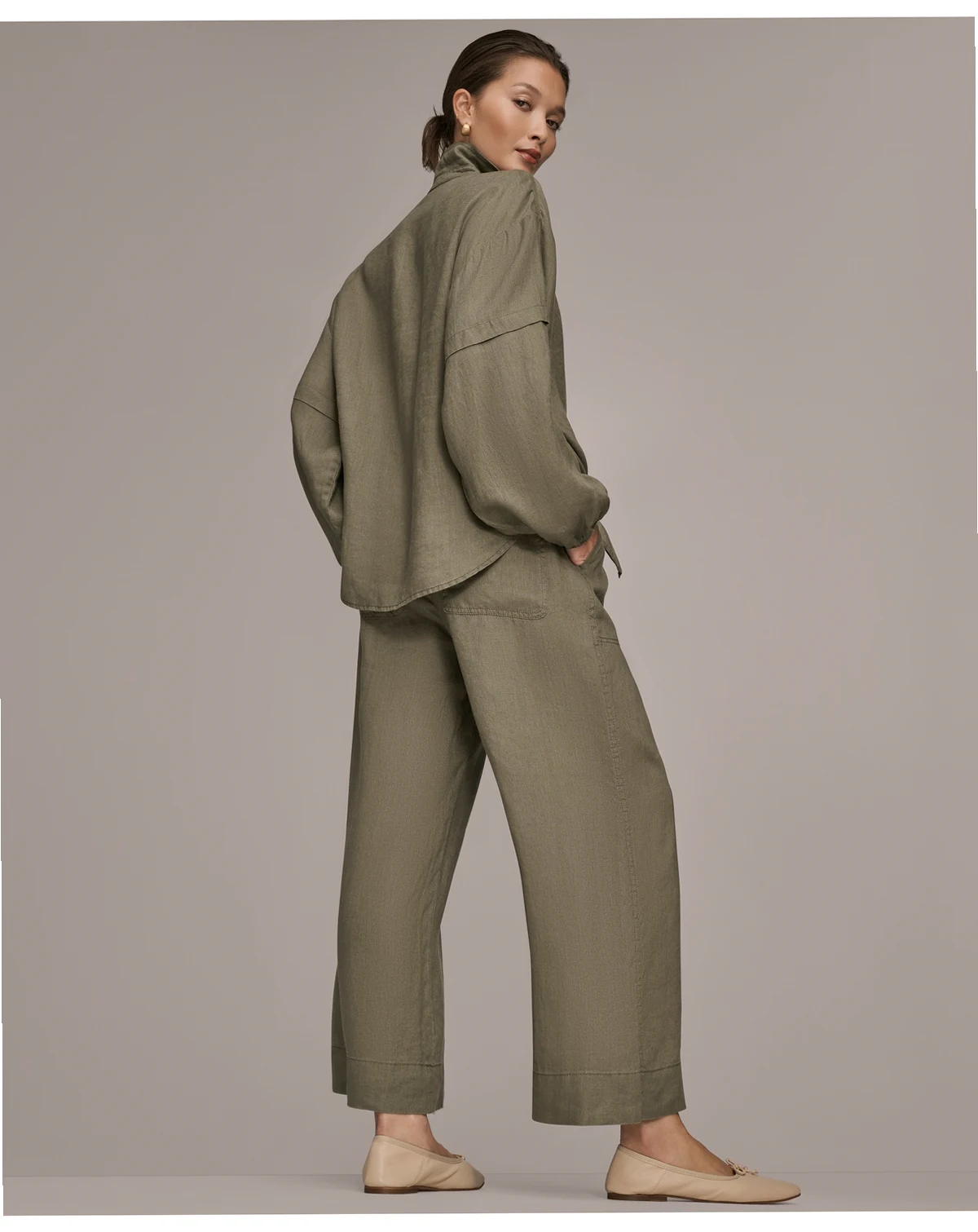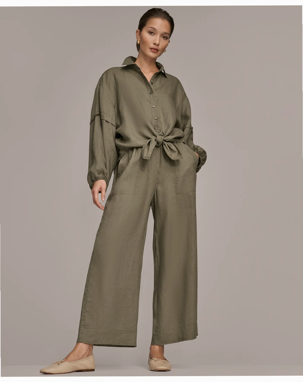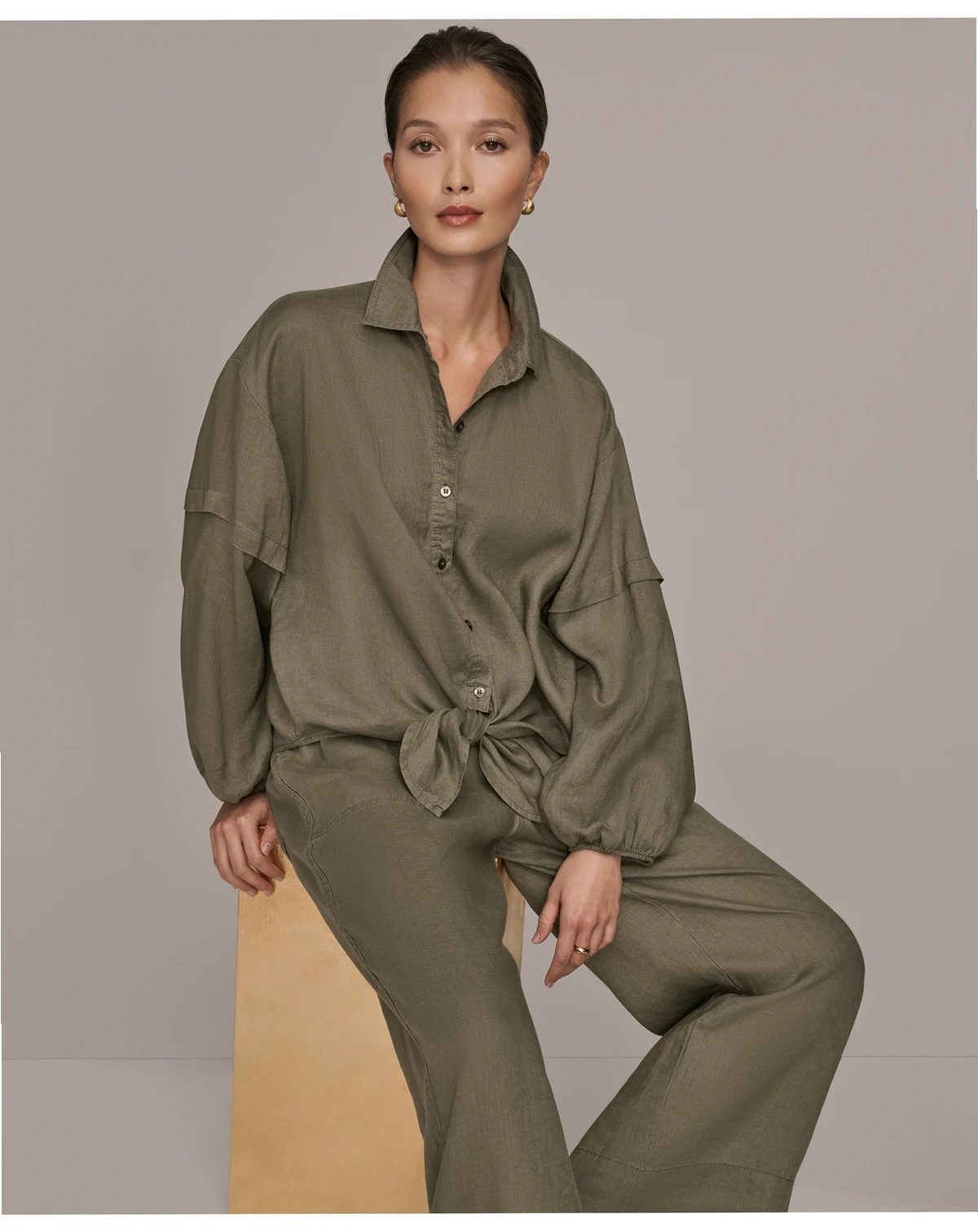 Effortless elegance defines the Donna Karan New York Women's Linen Long Blouson Sleeve Button Adjustable Tie Shirt, crafted from lightweight linen with blouson sleeves and an adjustable tie waist. Perfect for summer holidays, casual workdays, or resort evenings.