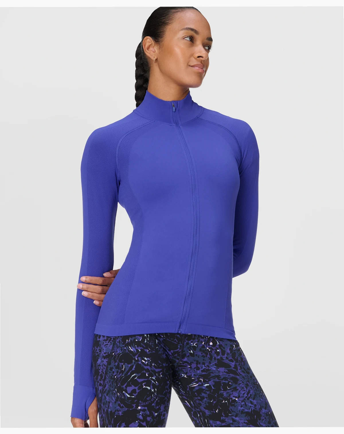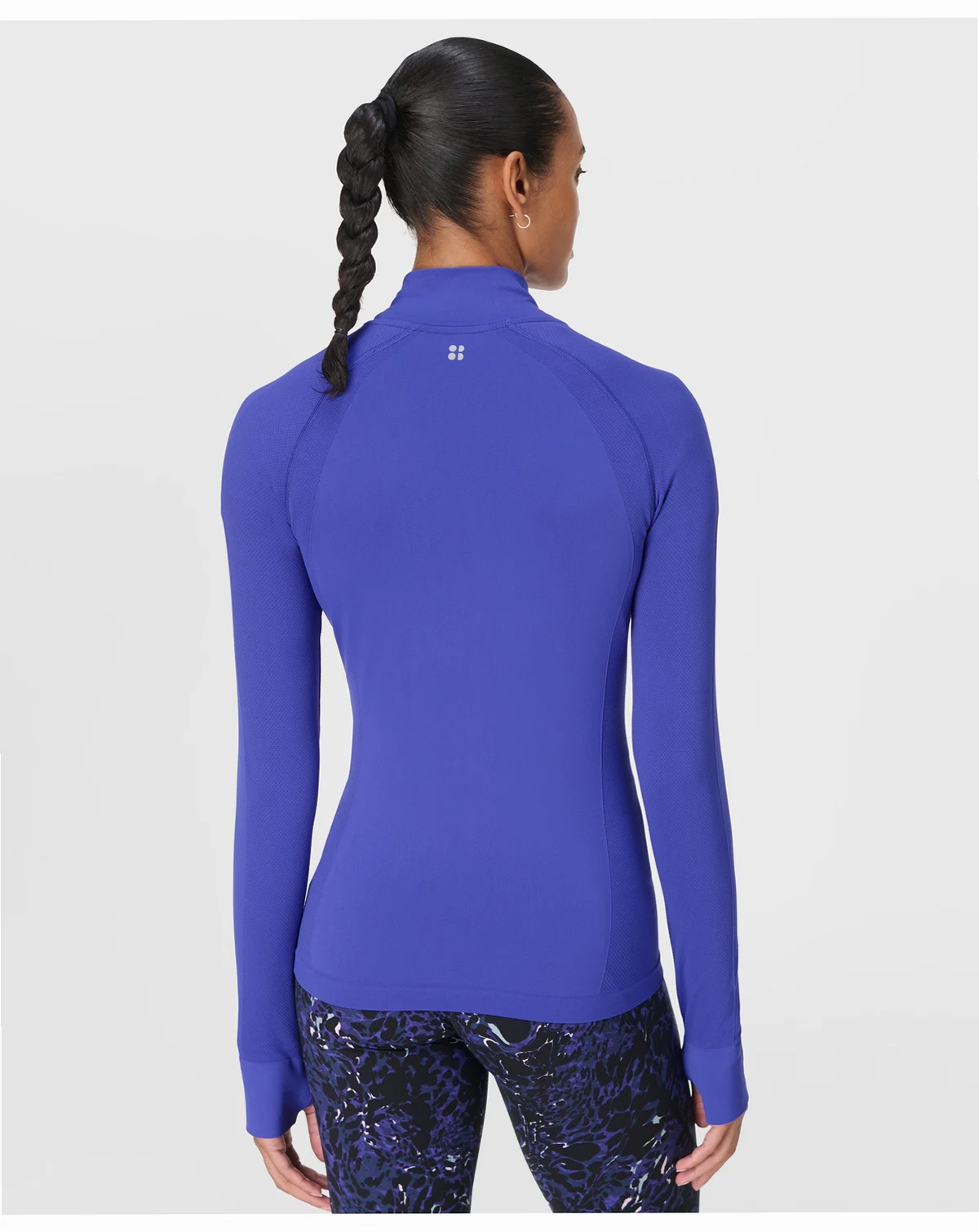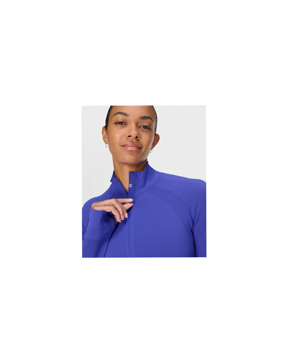 Stay supported through every move in this Sweaty Betty athlete seamless workout zip up. Designed with a collared front, long sleeves with thumbholes, and a seamless construction, it keeps comfort in focus during training and everyday wear. Sweat-wicking fabric and four-way stretch provide mobility, while branded internal placket detail adds a subtle finish.