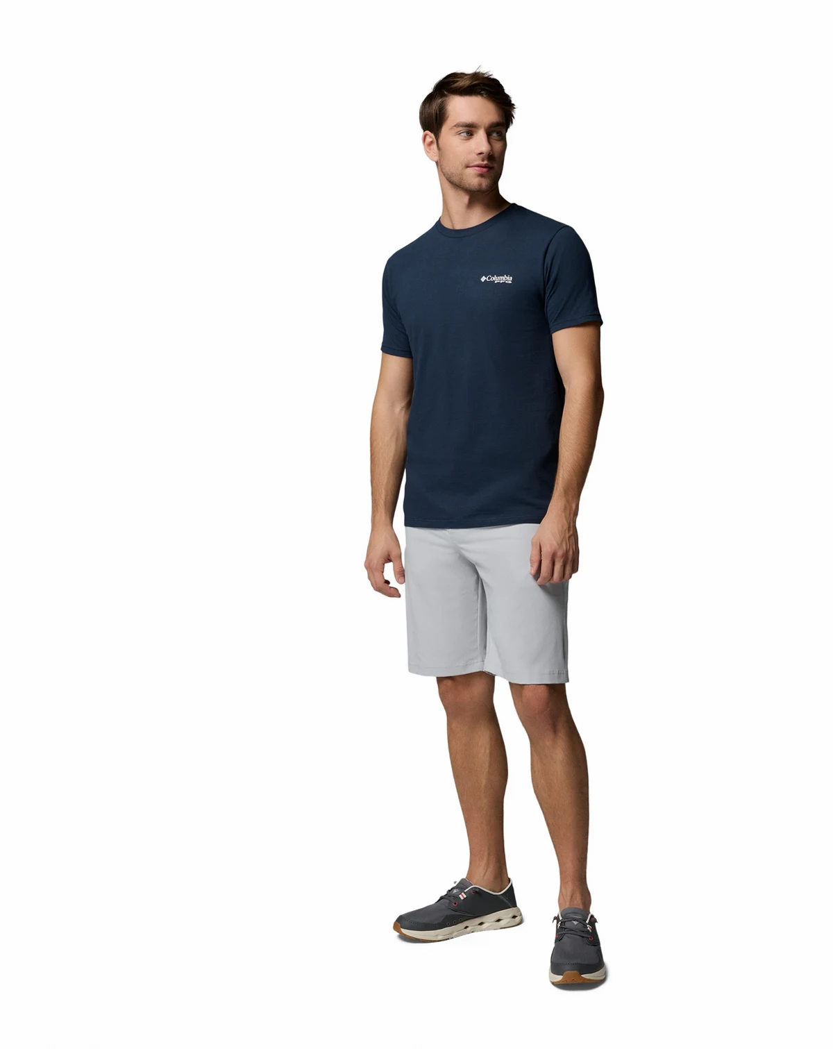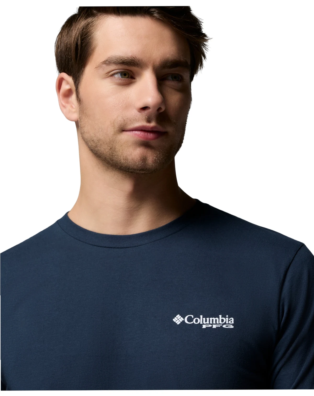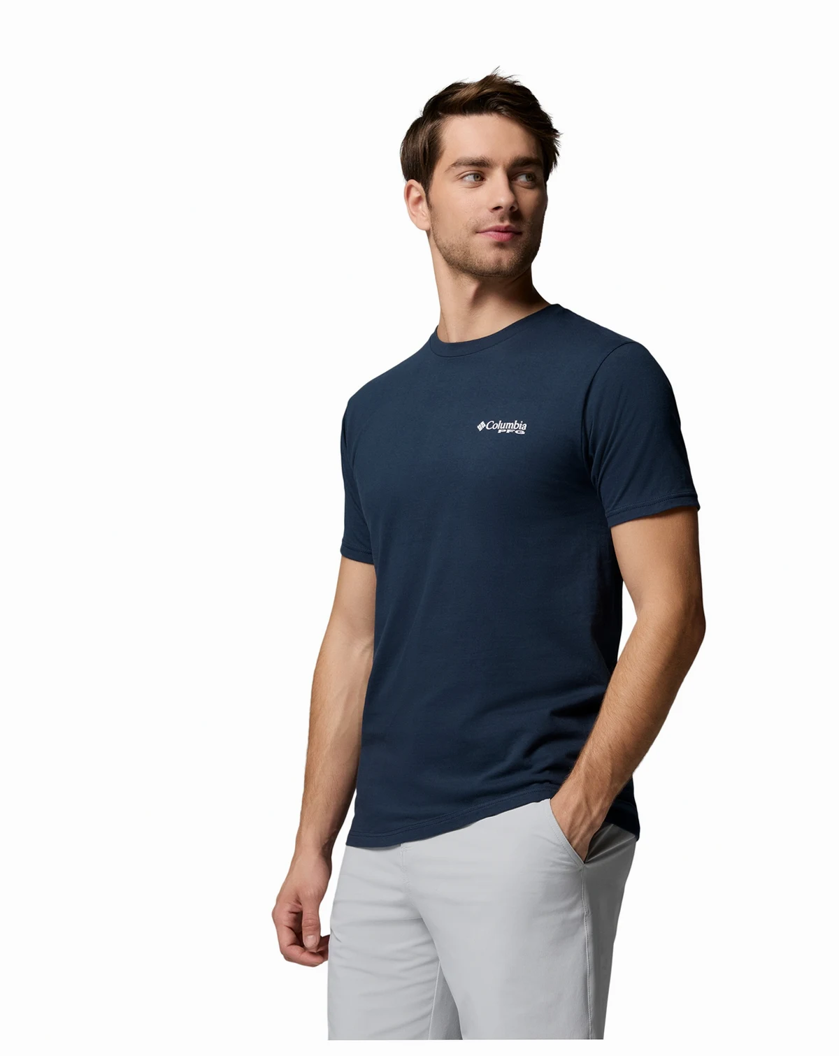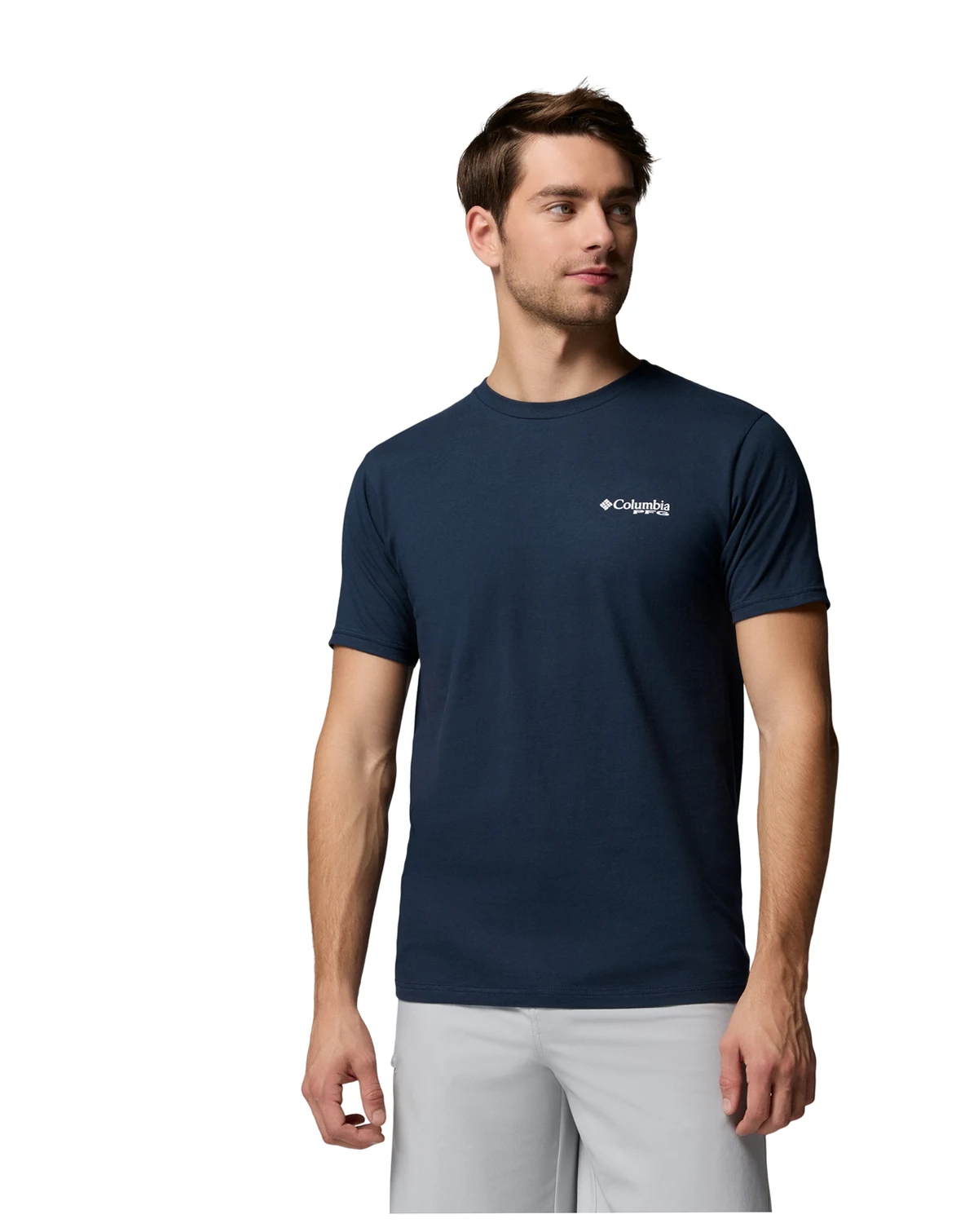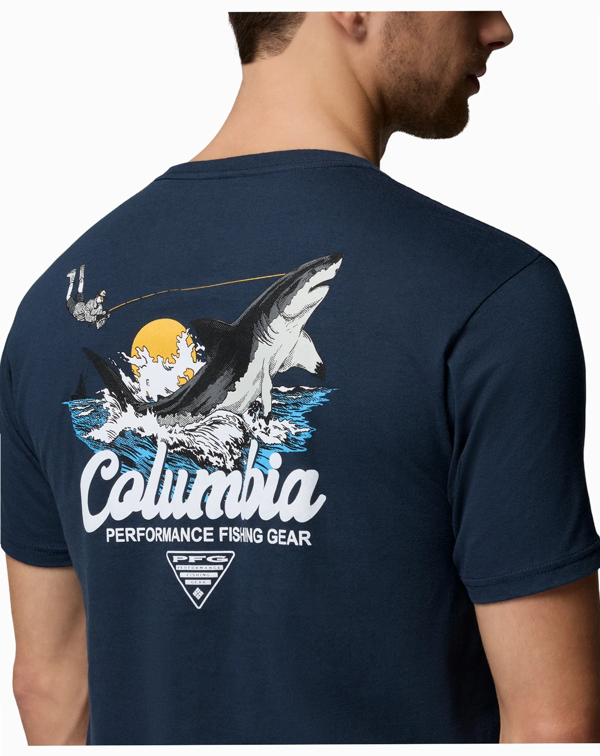 Take your performance fishing game to the next level with this cotton T-shirt from Columbia, complete with their signature logo and a great white shark across the back.