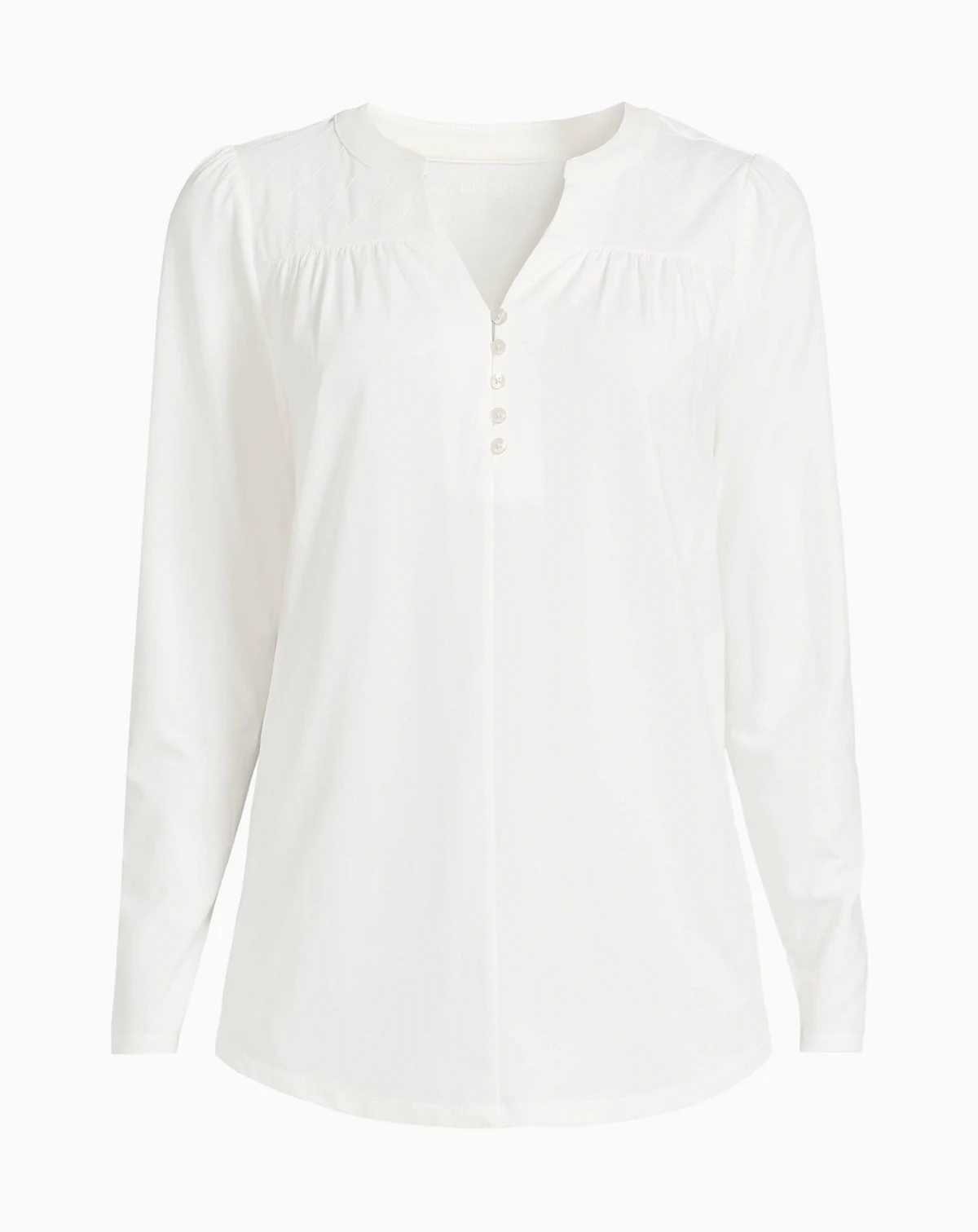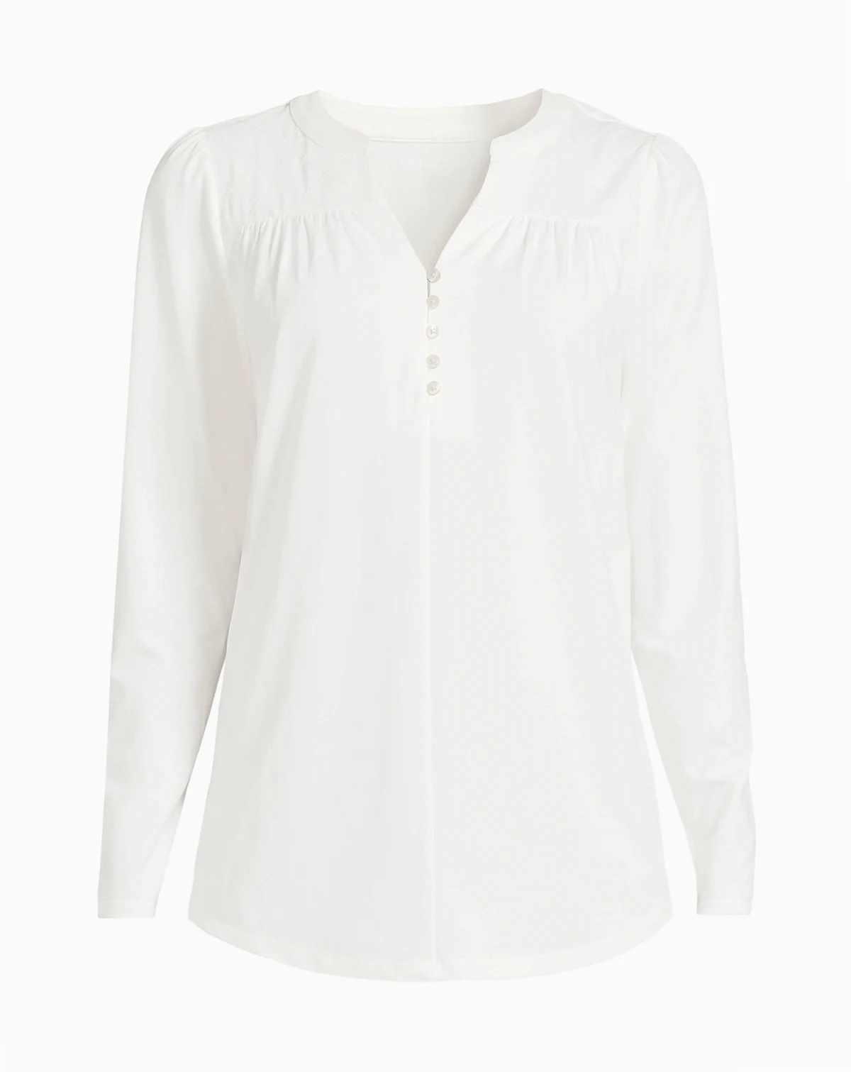 This lightweight top offers a relaxed fit that drapes effortlessly for all-day comfort. A notch neck neckline with elastic loop decorative buttons adds a refined feminine touch, while the shirring at the yoke creates flattering dimension. This top is the perfect piece to pair with your go-to skinny jeans - whether you're dressing it up or keeping it casual..