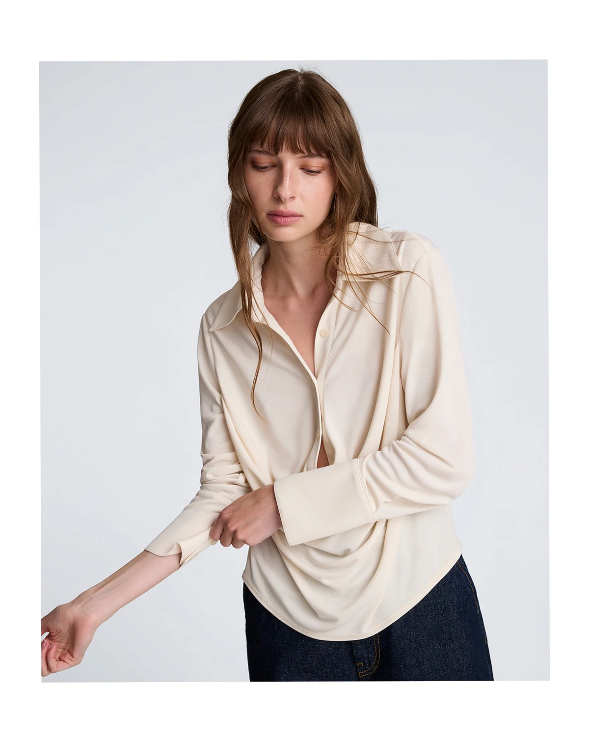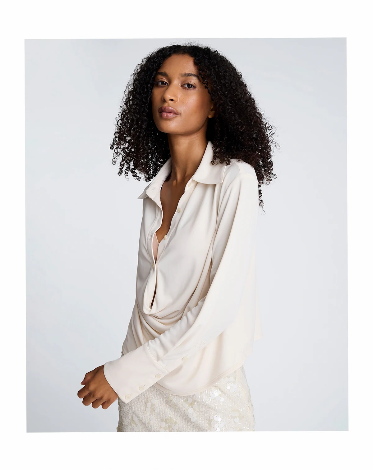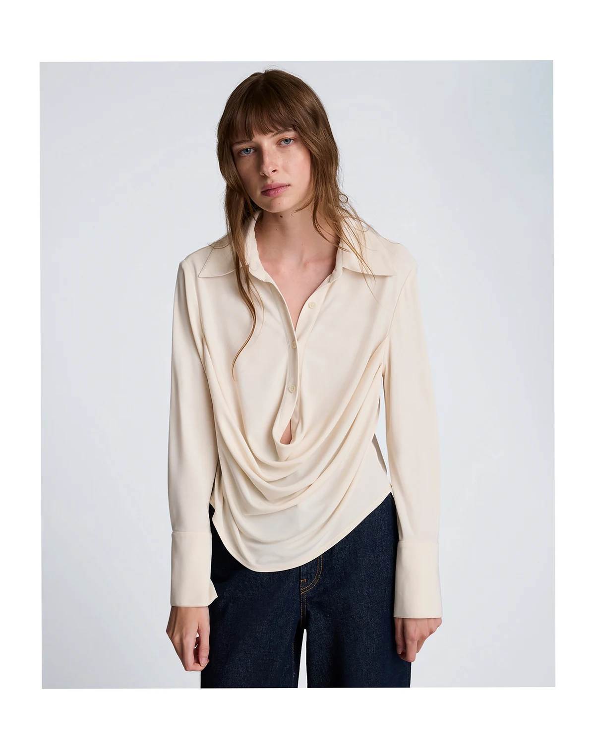 Embracing an effortlessly chic silhouette, this Kenneth Cole shirt presents a relaxed fit with a soft, flowing drape at the front. Its collared neckline and long sleeves create a sophisticated, laid-back look perfect for layering.