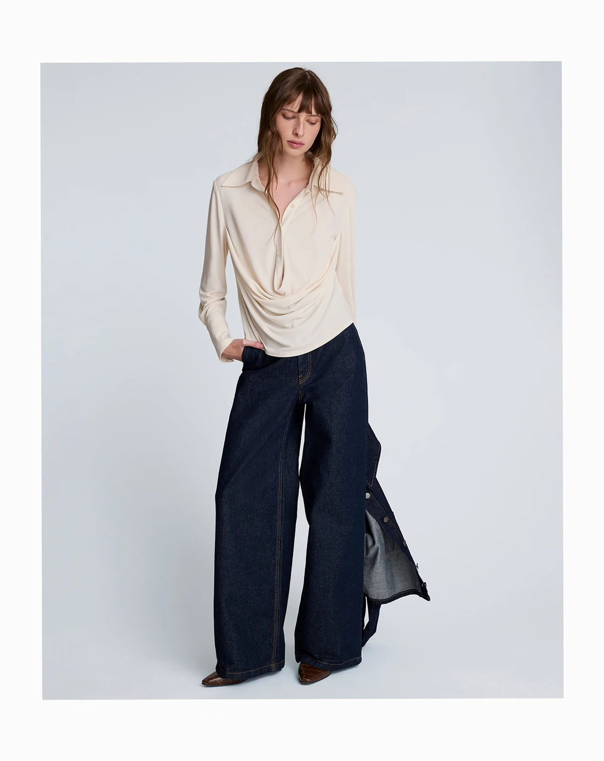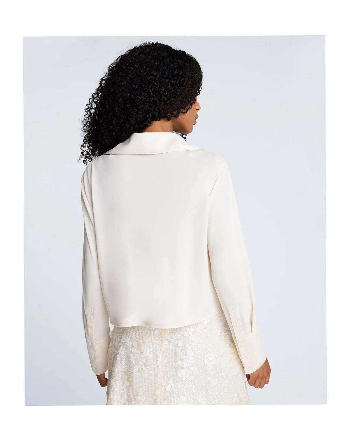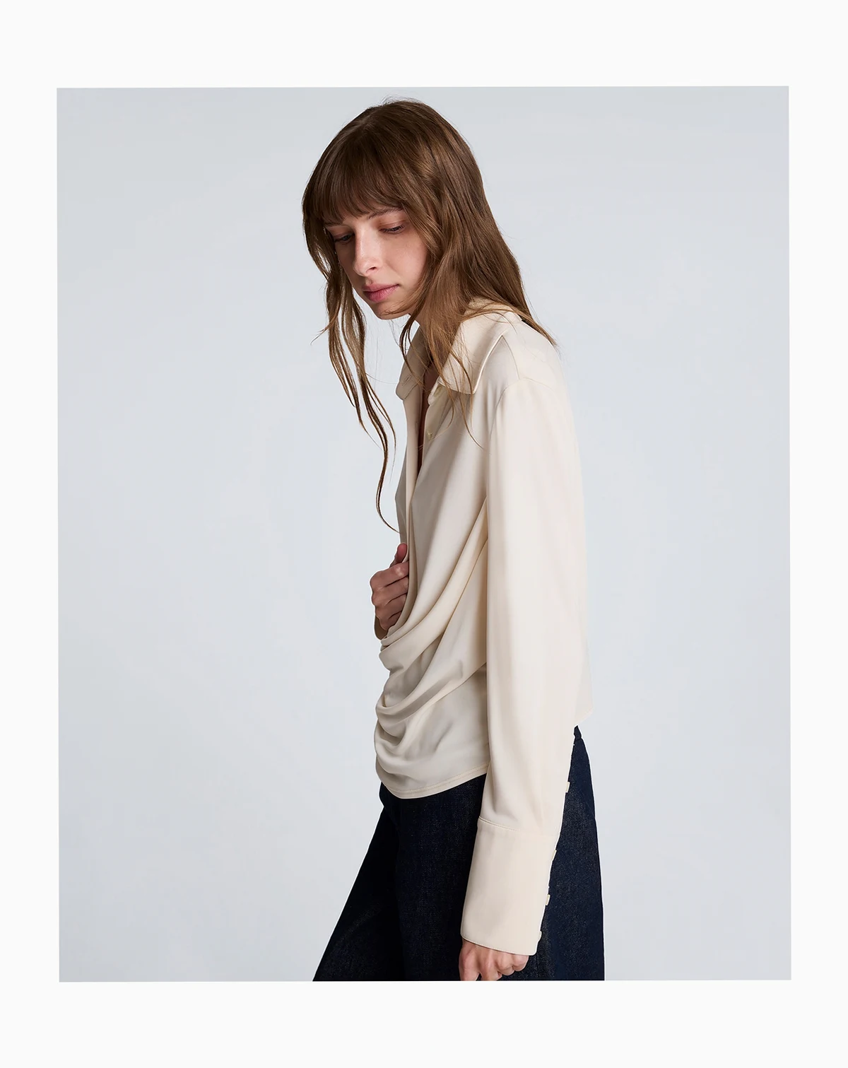 Embracing an effortlessly chic silhouette, this Kenneth Cole shirt presents a relaxed fit with a soft, flowing drape at the front. Its collared neckline and long sleeves create a sophisticated, laid-back look perfect for layering.