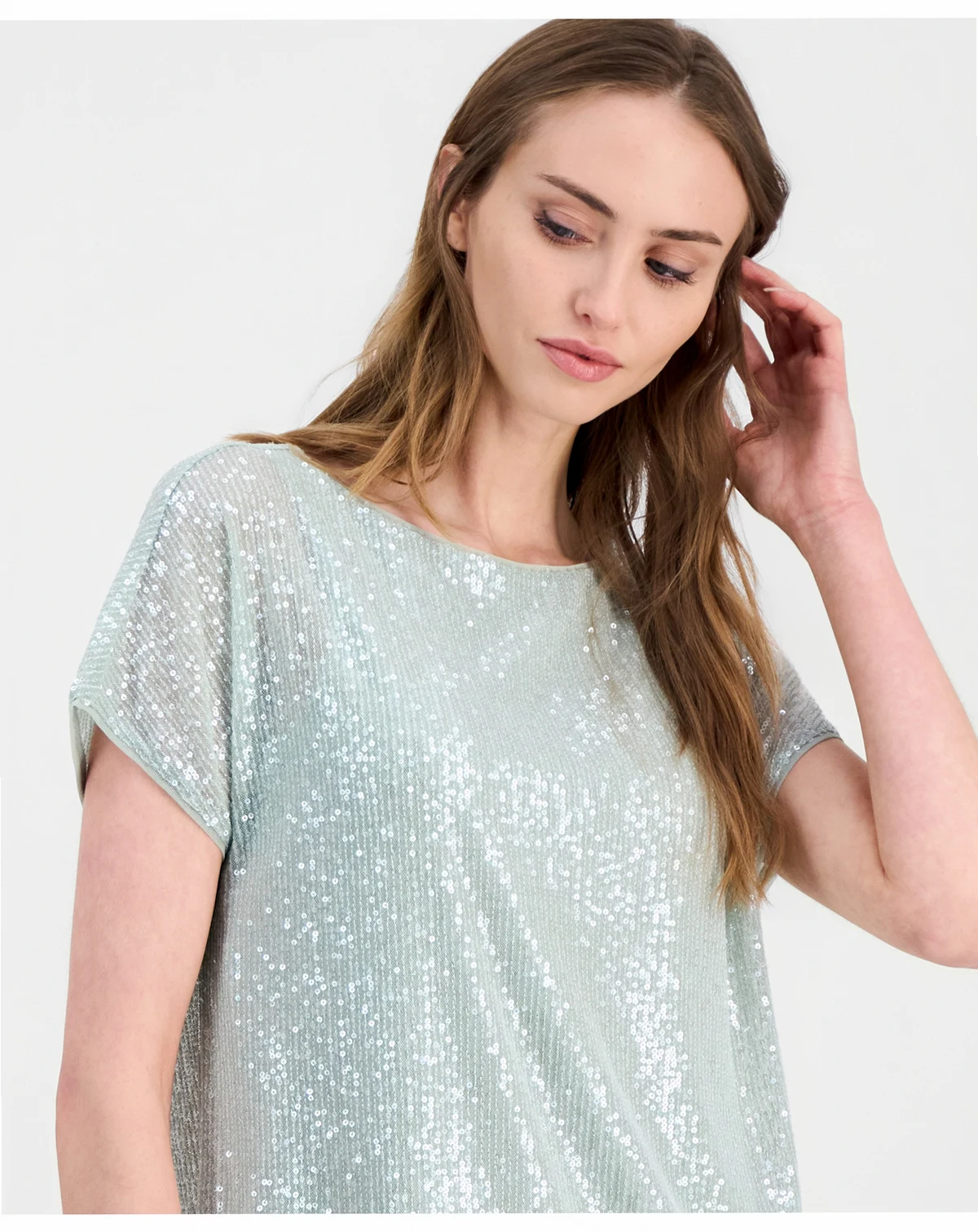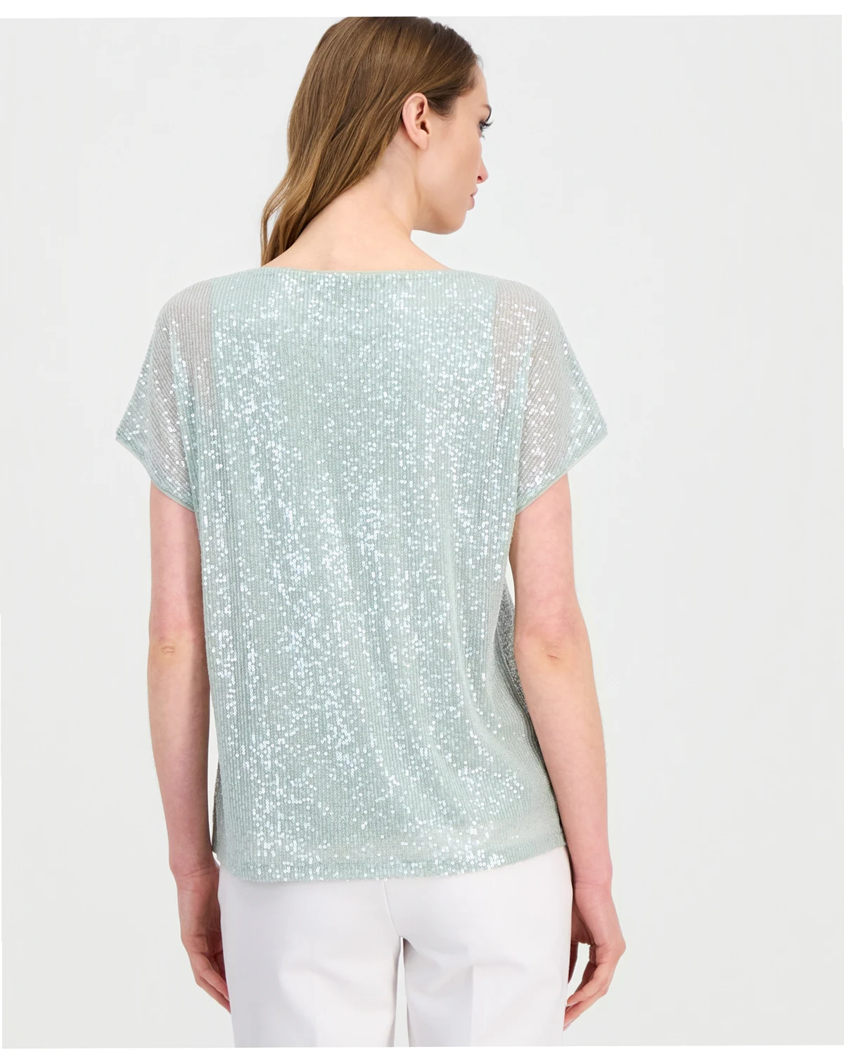 Anne Klein brings a little shimmer to your rotation with this short-sleeve top designed with sequins that sparkle throughout every inch.