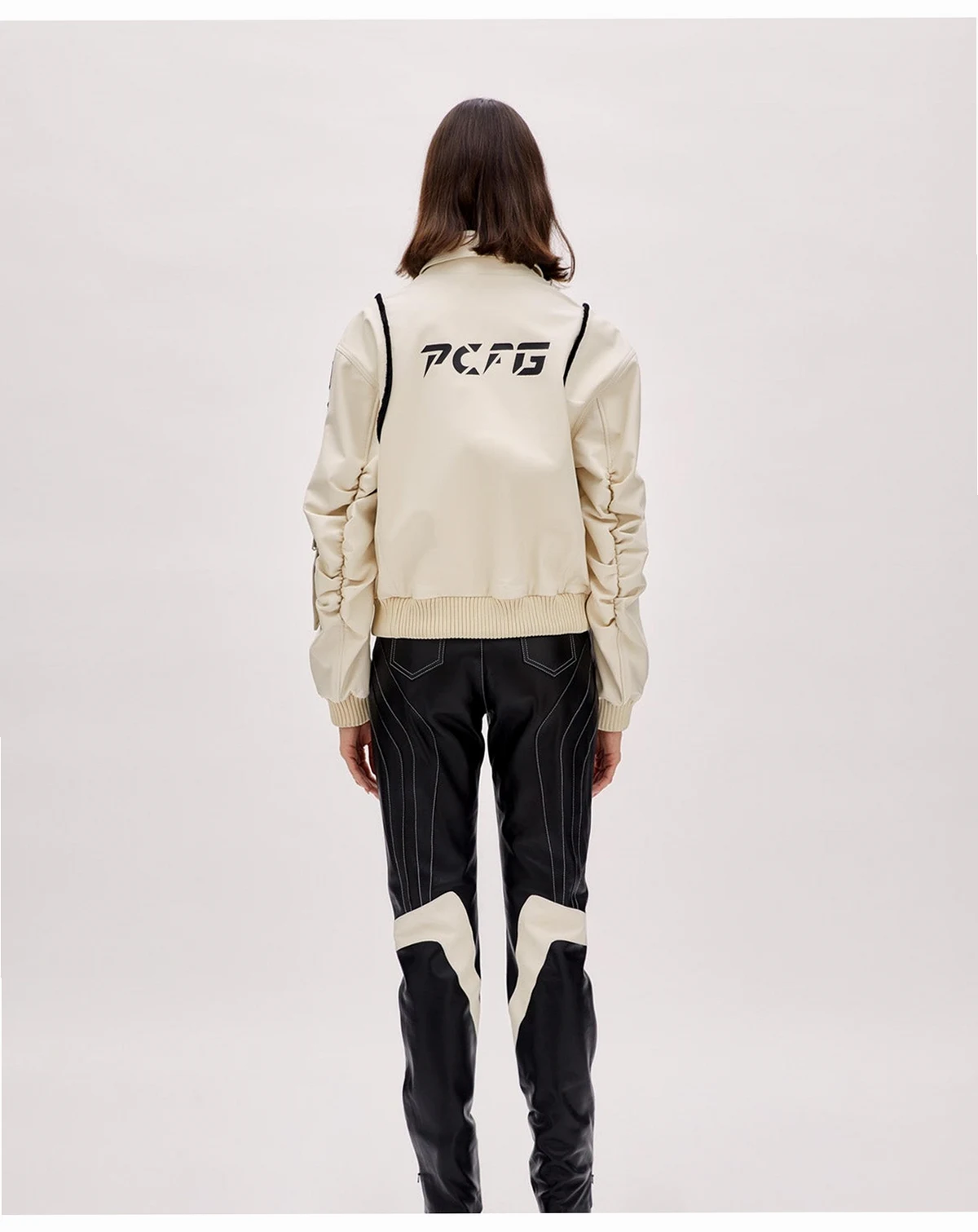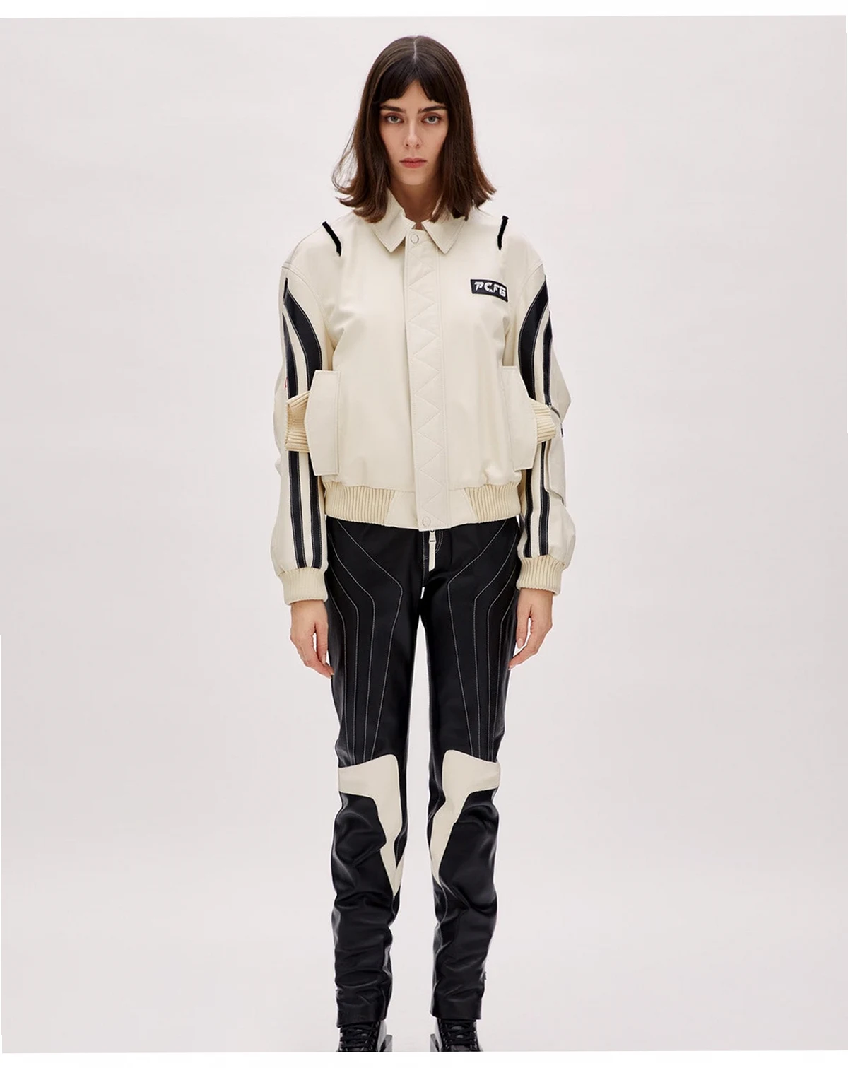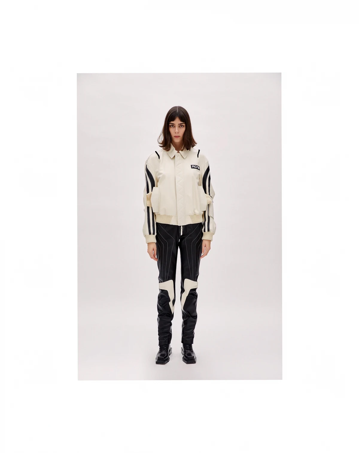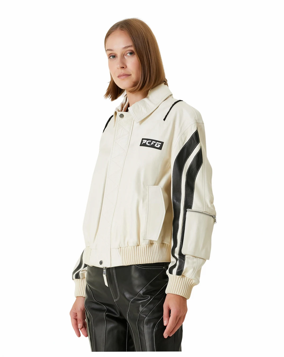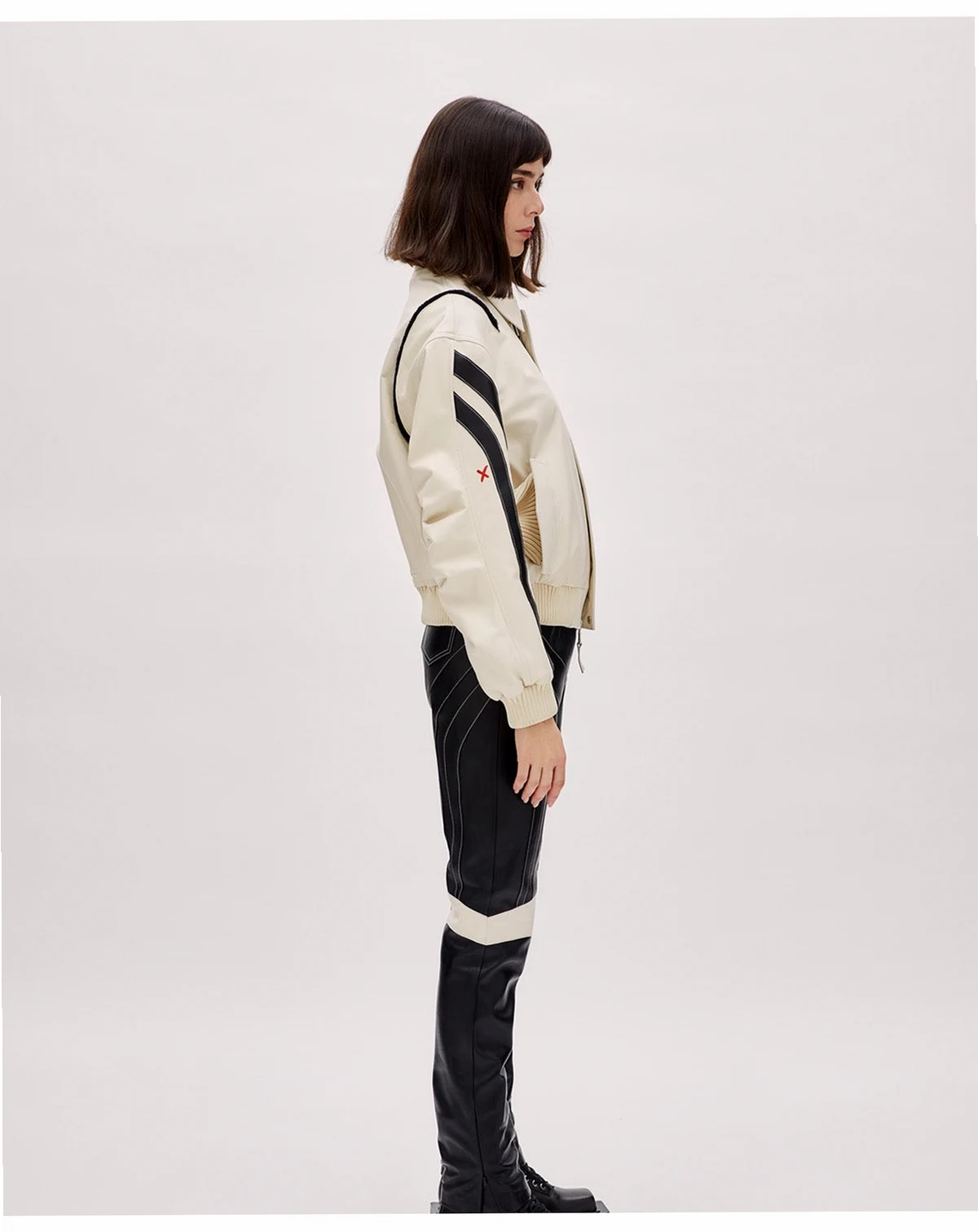 A statement biker jacket cut from premium, full-grain leather that has a supple hand-feel and long-term durability. Classic moto silhouette features wide notched lapels, an off-centre asymmetrical front zip, zippered cuffs and waist-belt channel unmistakable "perfecto" attitude. Distinctive boomerang-shaped leather panels across the shoulders and back give the piece its name and set it apart from standard biker jackets. Metal hardware throughout adds rugged edge with polished silver-tone zips, snaps and belt buckle. Designed to layer easily over everything from denim and tees to dresses, delivering an instant rock-and-roll finish.