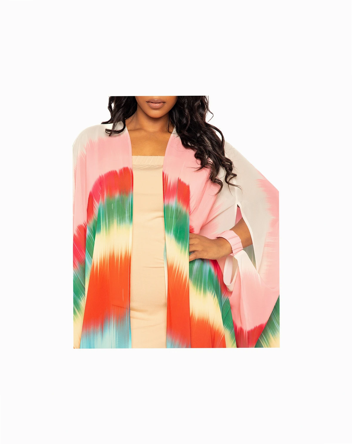 Vibrant multi-color kimono robe with wrist bands crafted from lightweight and flowy fabric. Its relaxed fit and open front design makes it perfect for layering.