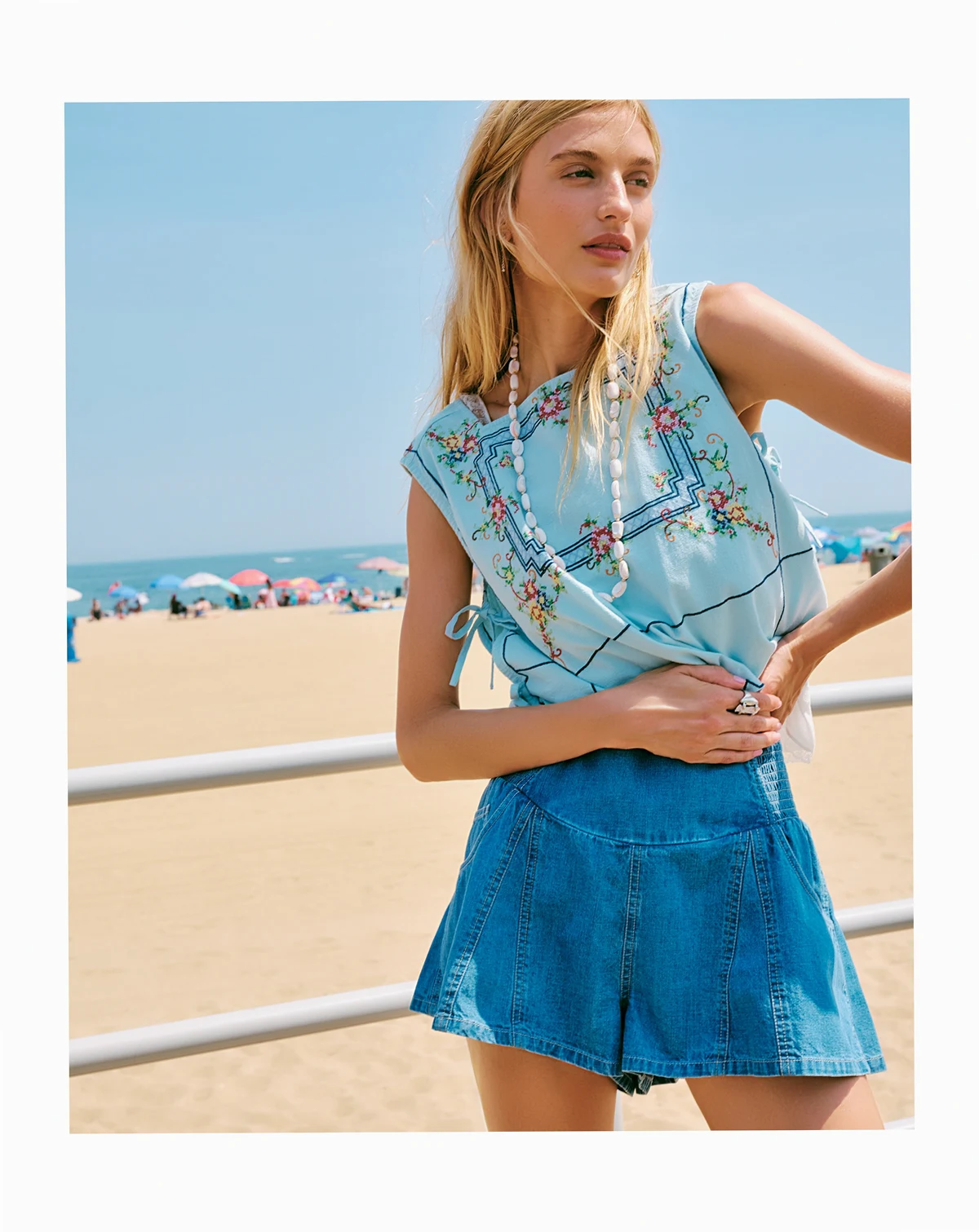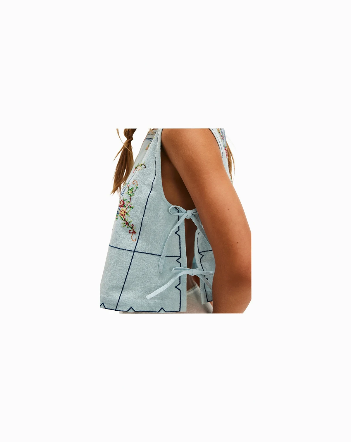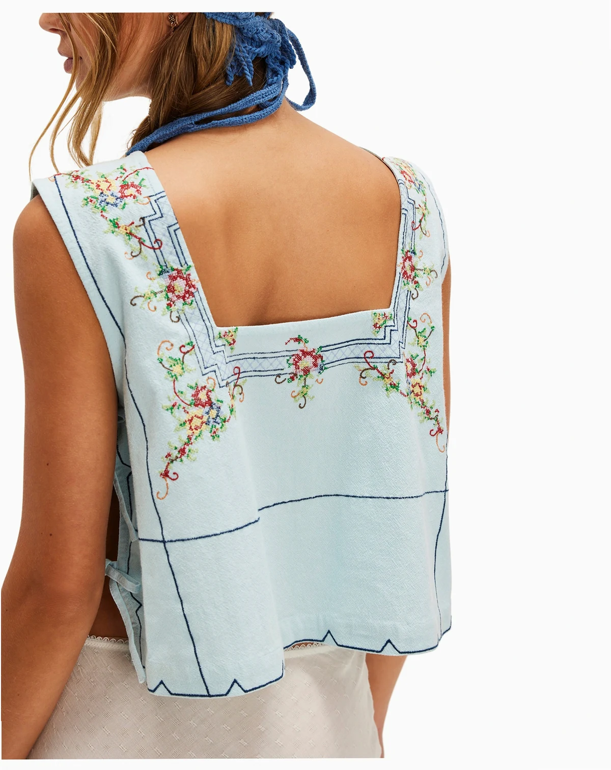 Approx. 19" long; Side tie closures; cropped, boxy fit; cross-stitch embroidery