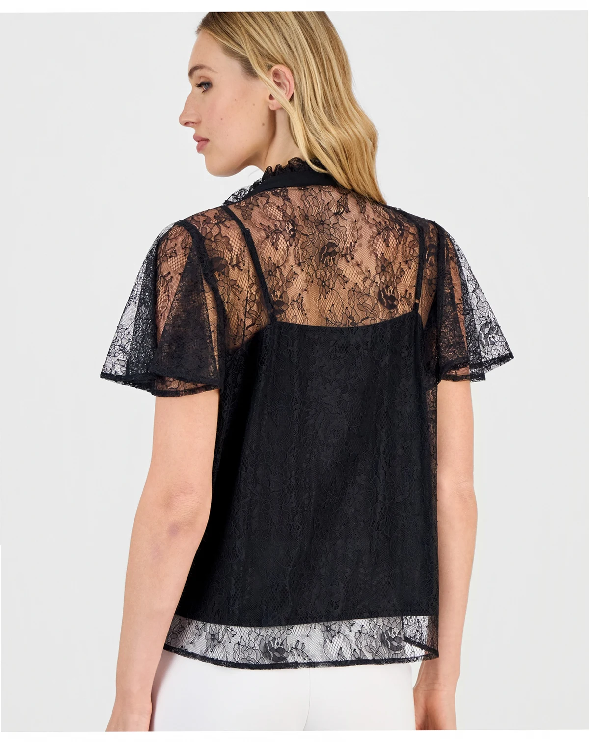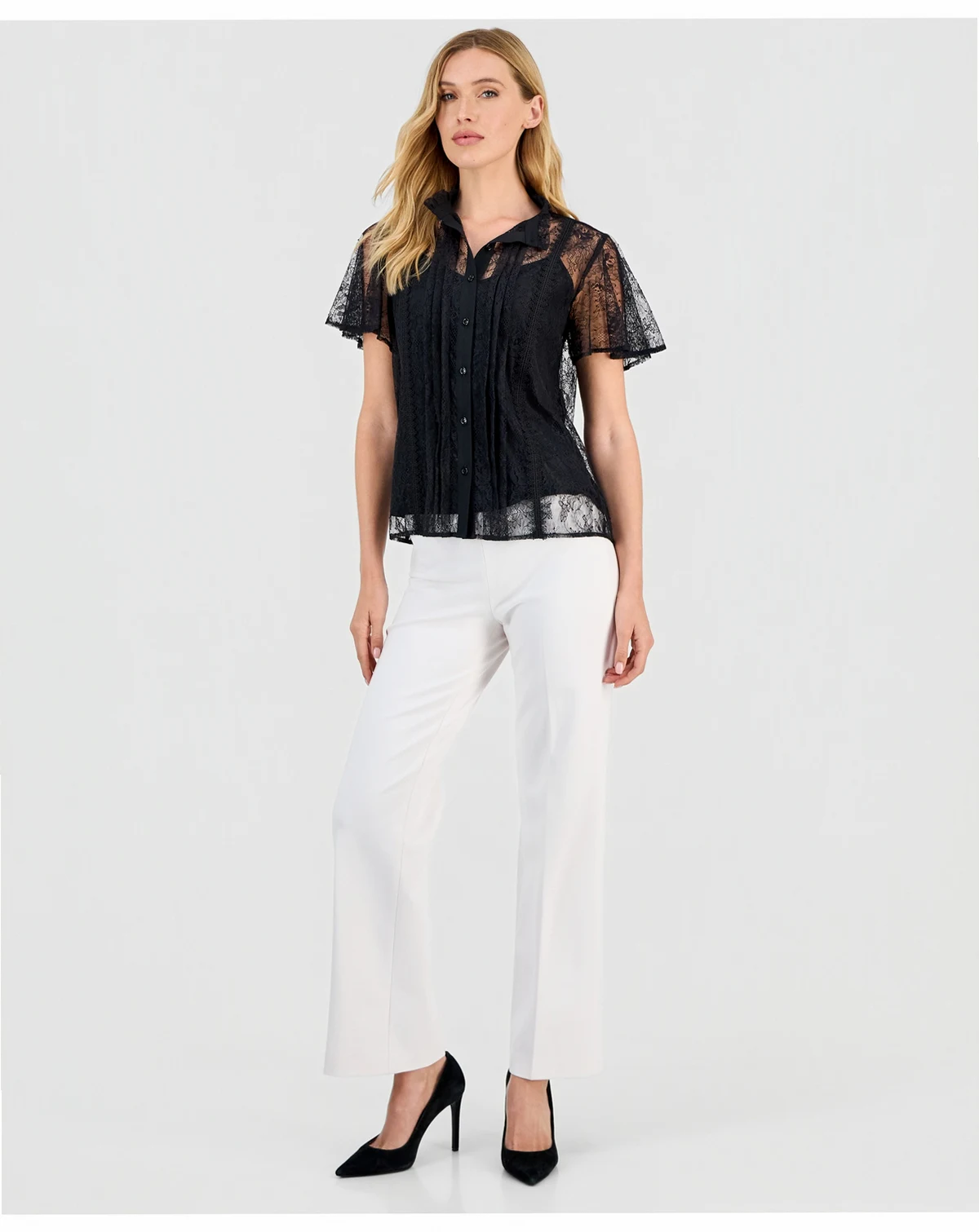 Darkly romantic with a sheer lace fabrication and ruffle-trimmed crewneck, Anne Klein's button-front blouse is finished with short flutter sleeves for whimsical balance.