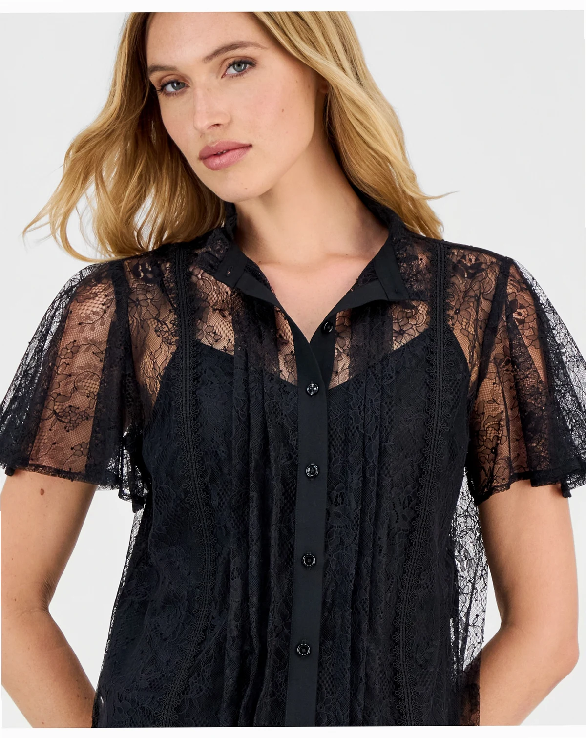 Women's Flutter-Sleeve Button-Front Lace Blouse