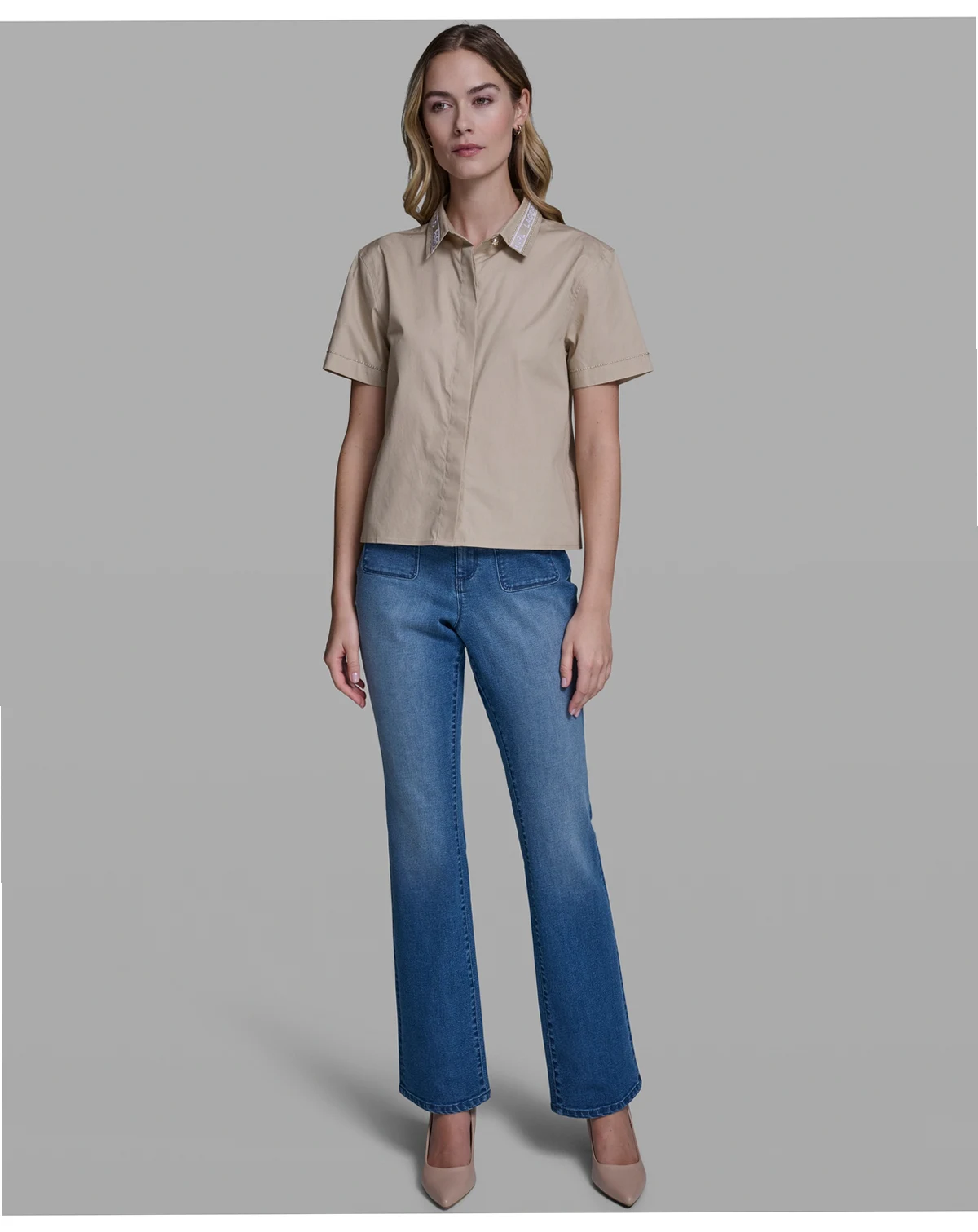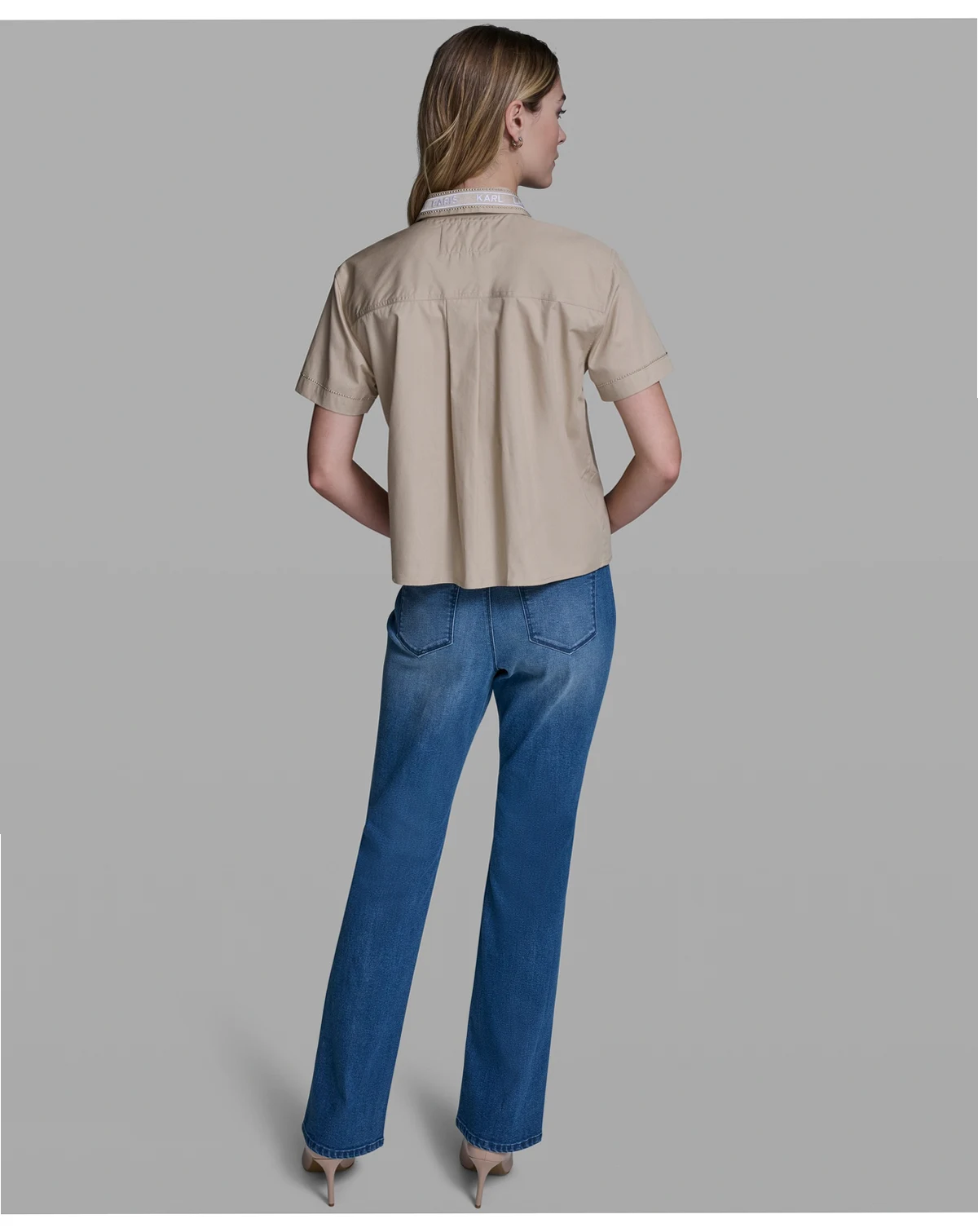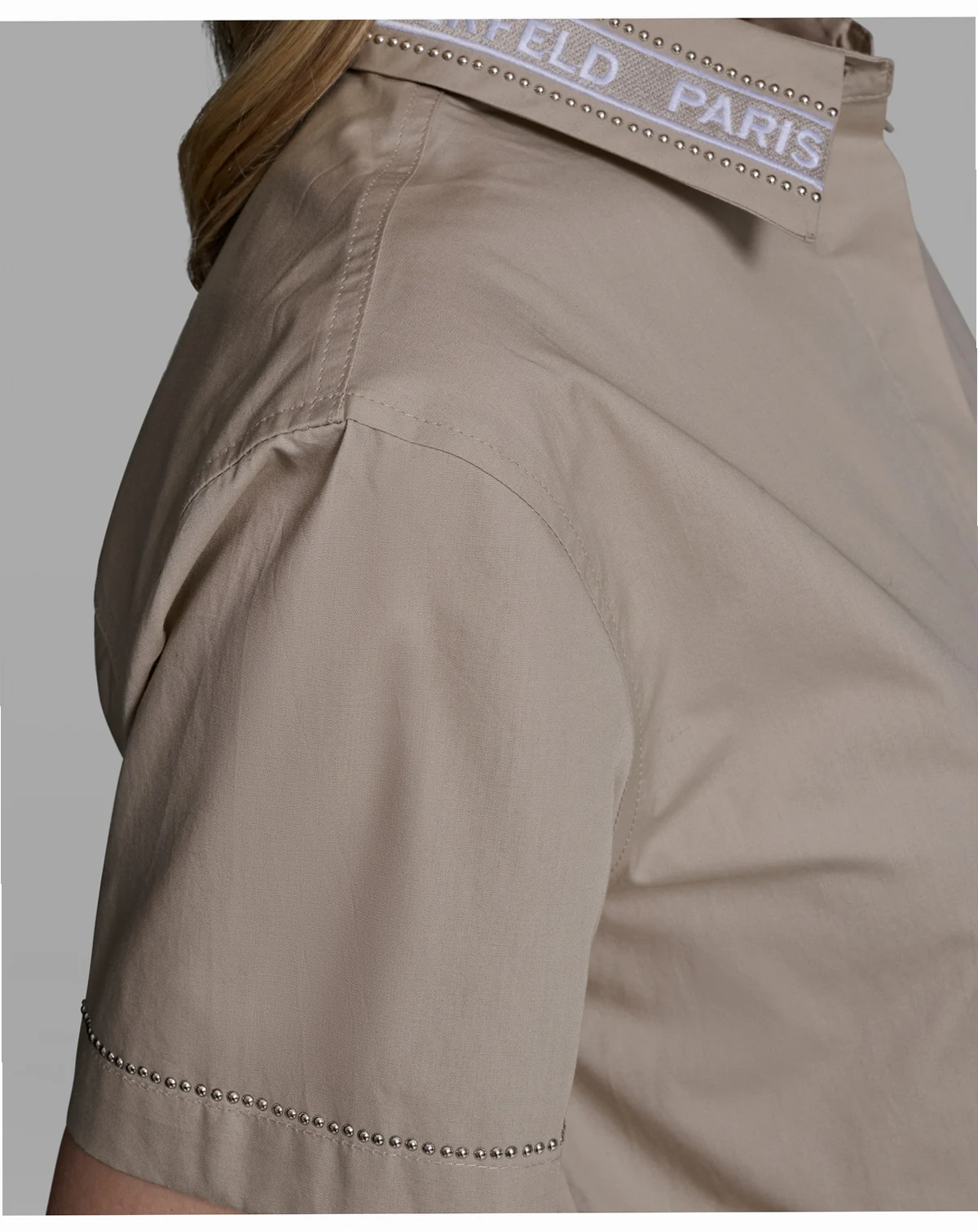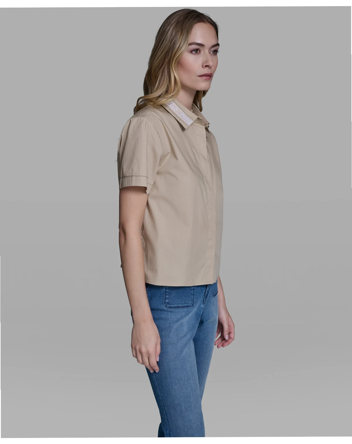 Distinctive tape detailing traces the collar of this short-sleeve poplin top from KARL LAGERFELD PARIS. A button-front closure creates a crisp, polished appearance.
