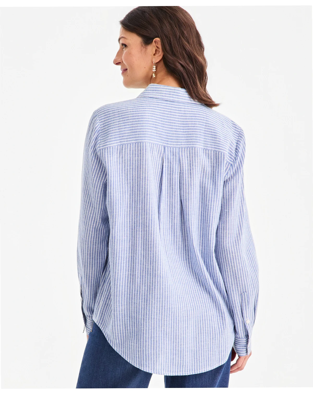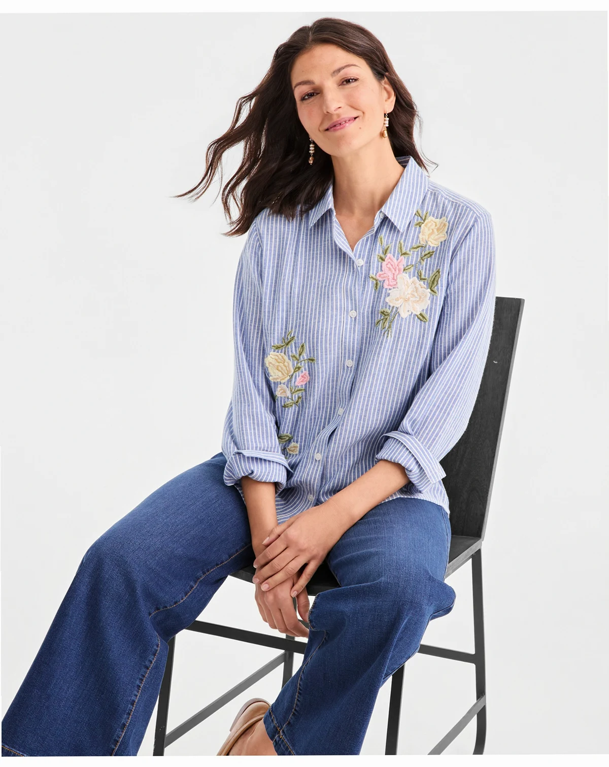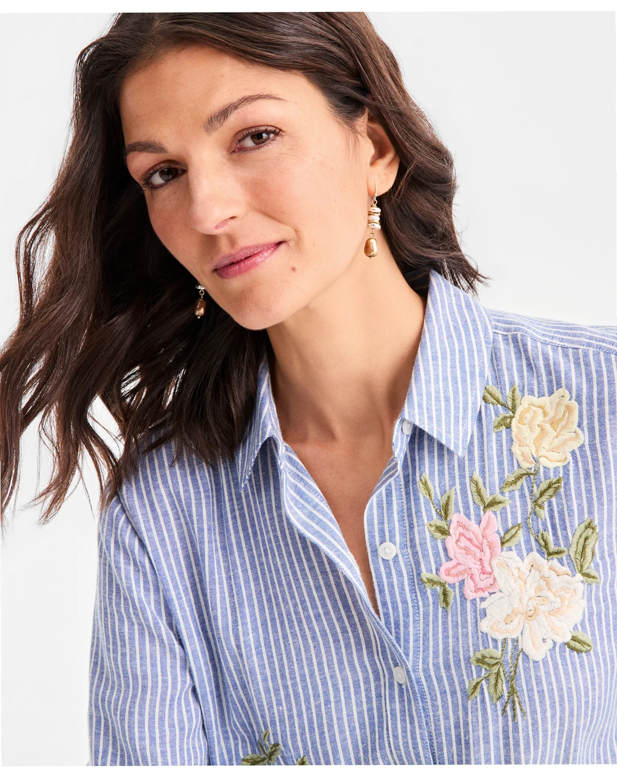 A sophisticated update to a timeless classic, this striped shirt by Style & Co features delicate embroidered detailing and a crisp, tailored fit. Its blend of traditional lines and feminine accents makes it a versatile staple for polished, everyday wear.