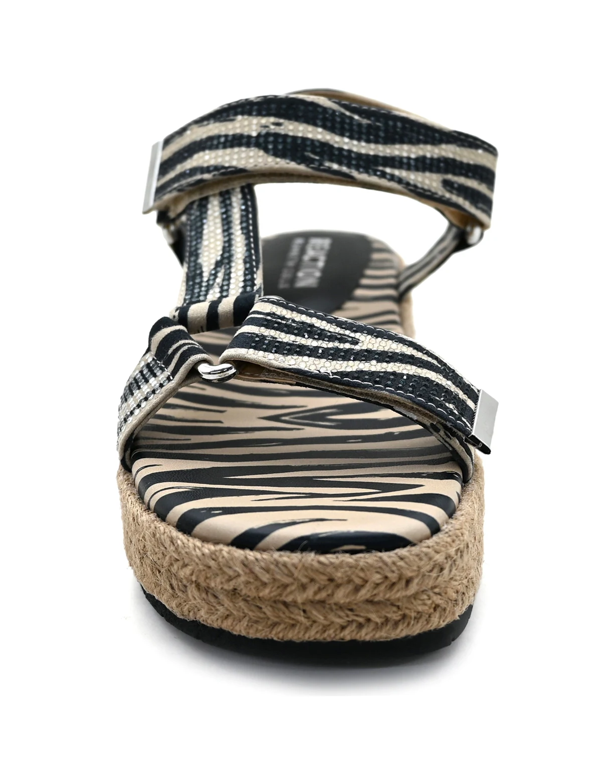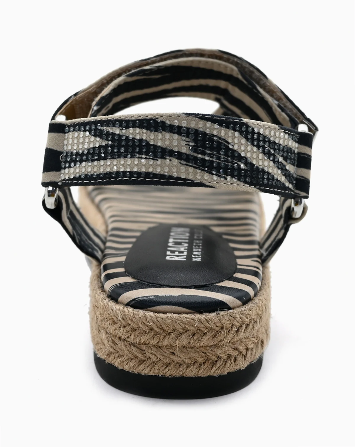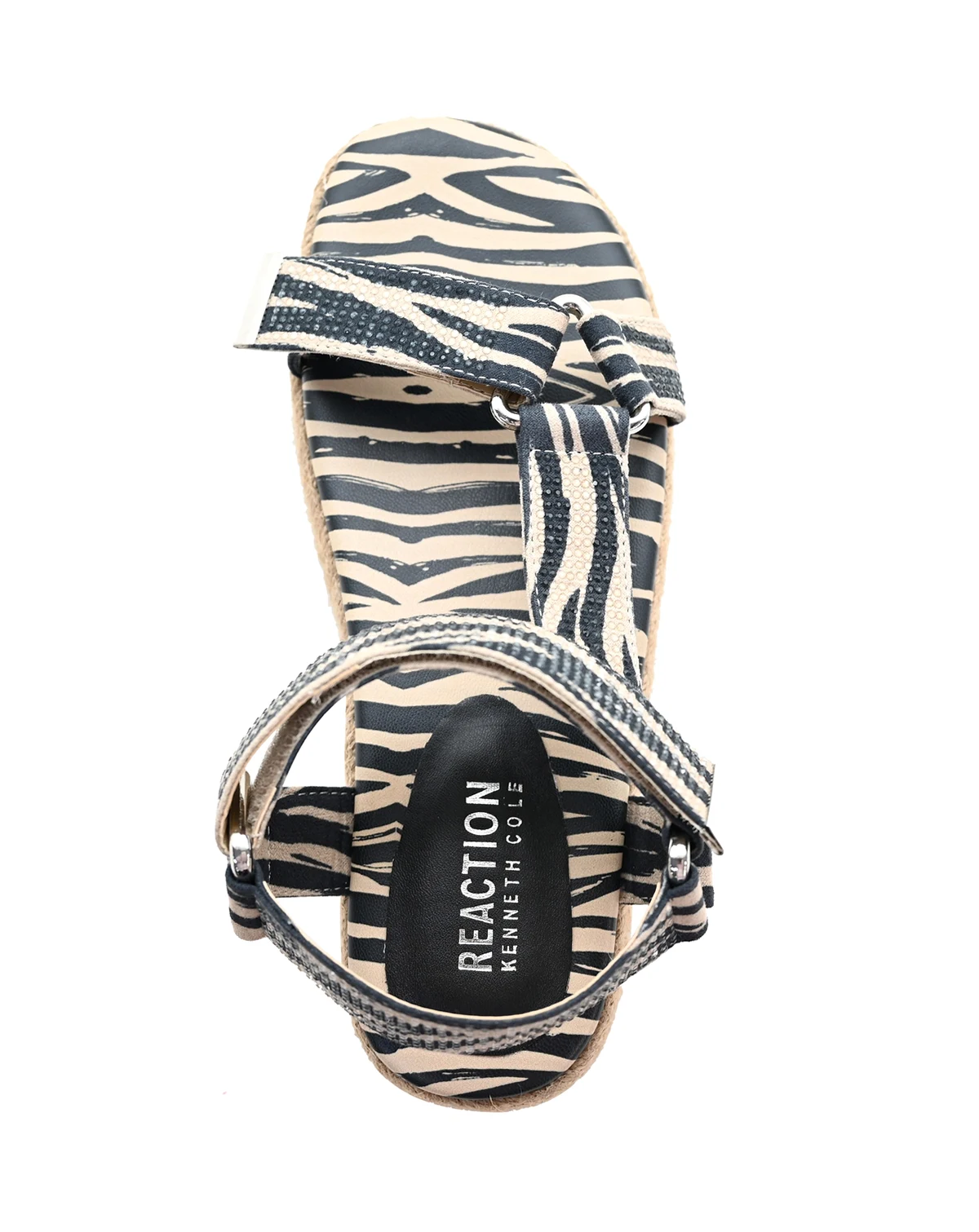 Sparkling rhinestones elevate the Kenneth Cole Reaction zebra-print sandal on a jute-wrapped platform sole for resort-ready style.