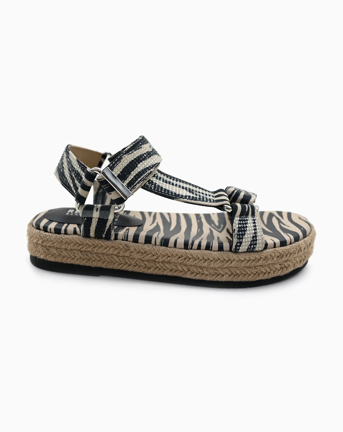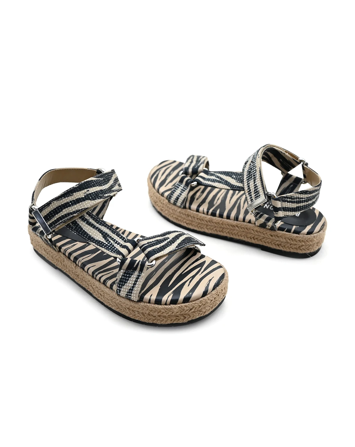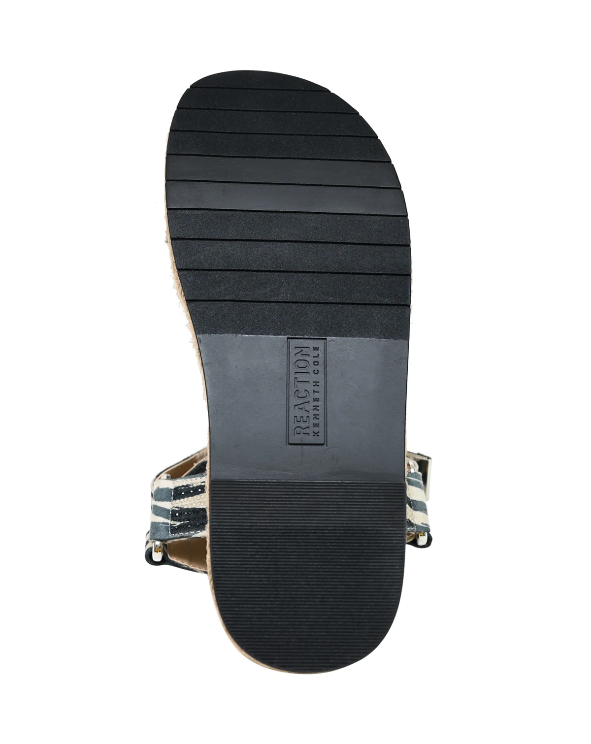 Sparkling rhinestones elevate the Kenneth Cole Reaction zebra-print sandal on a jute-wrapped platform sole for resort-ready style.