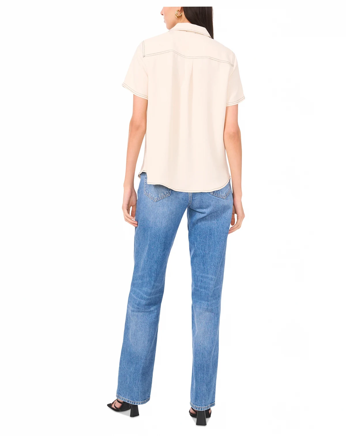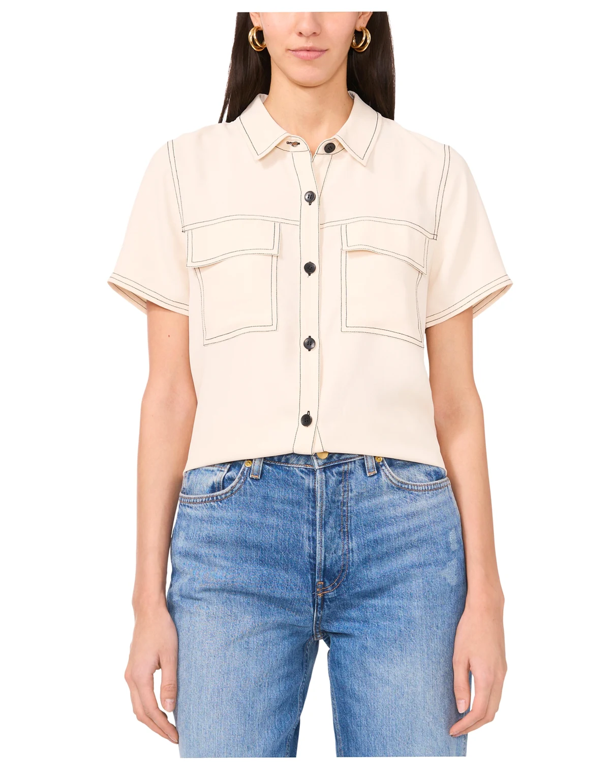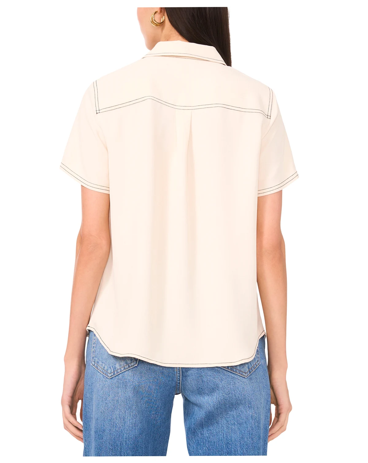 Contrast stitching brings a fresh look to this short-sleeve blouse from Vince Camuto. A pleat at the back creates stylish drape. ABOUT THE BRAND: Vince Camuto is a globally renowned brand that embodies European styling. Detailed craftsmanship across the line embraces current trends while maintaining a classic aesthetic.