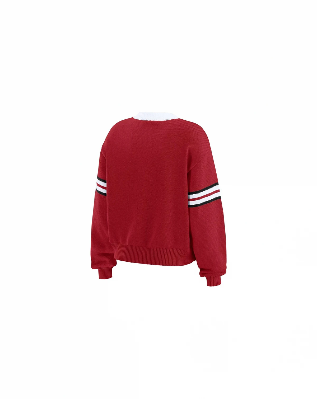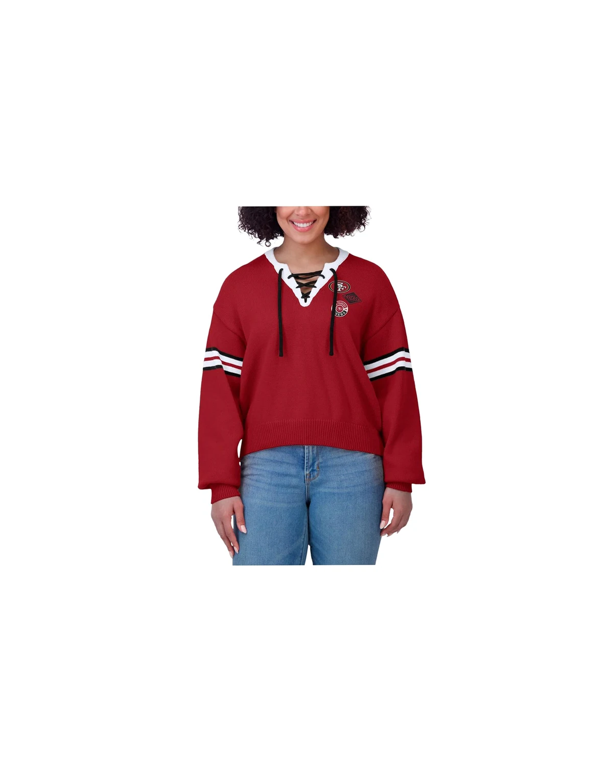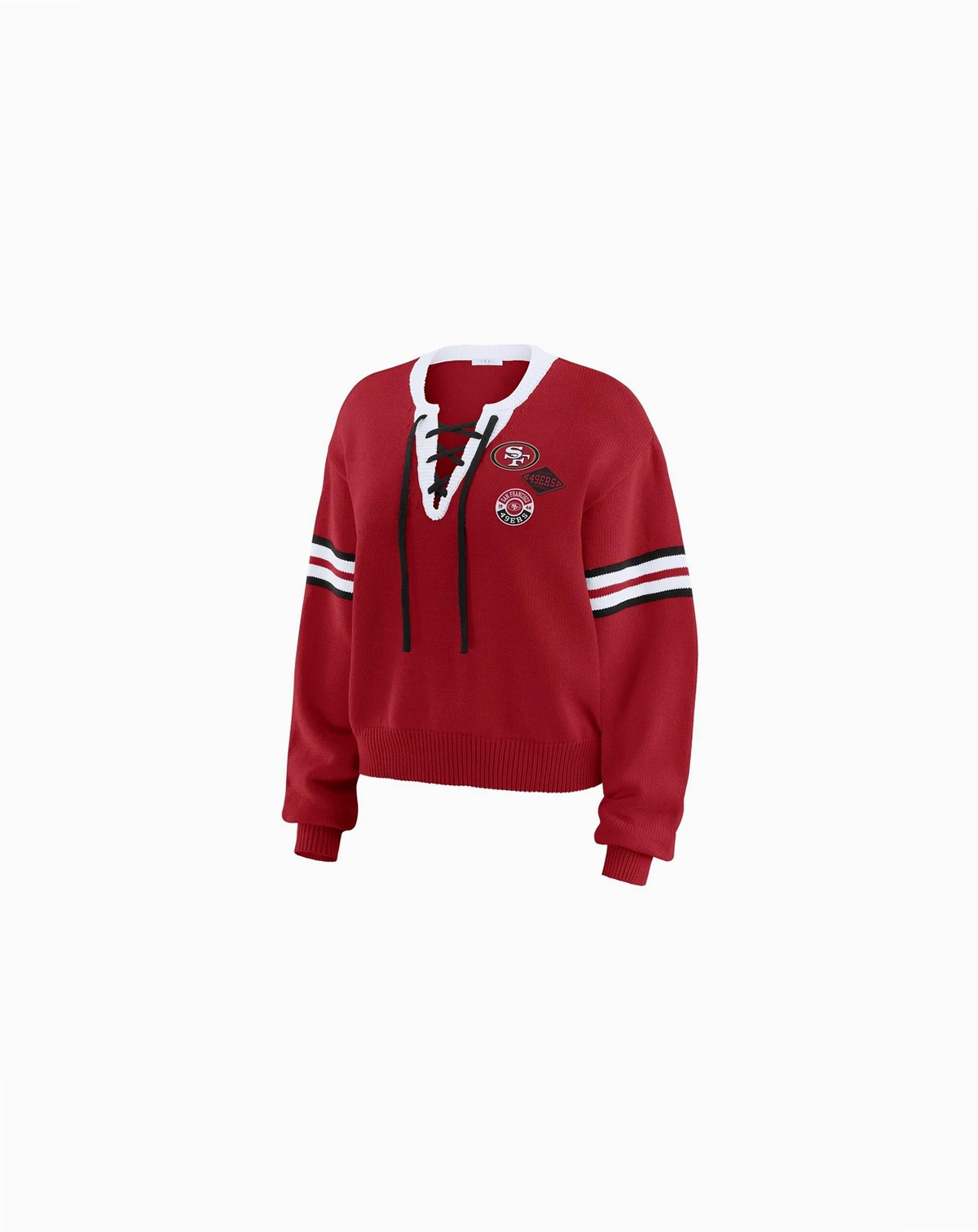 Take your game day style to the end zone with this San Francisco 49ers pullover hoodie from WEAR by Erin Andrews. It features embroidered team details on the front, a sporty lace-up neckline and traditional rib-knit striping in San Francisco 49ers colors. Dropped shoulders provide a more flexible fit for all-day comfort.
