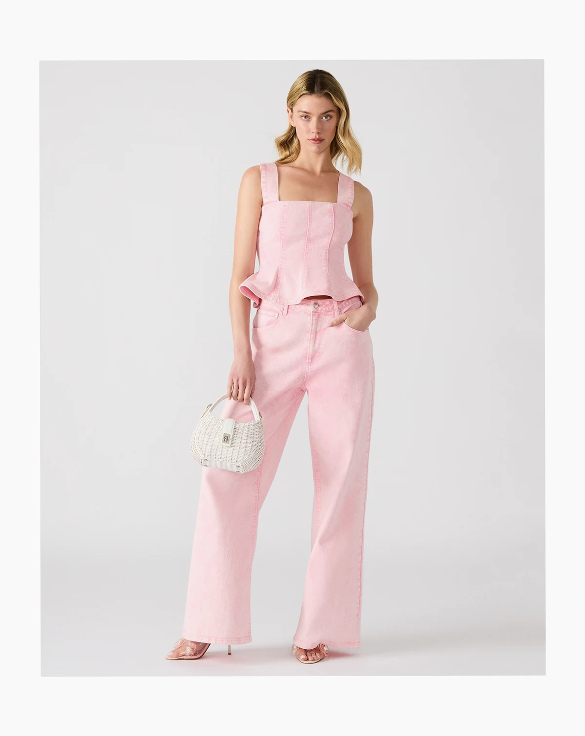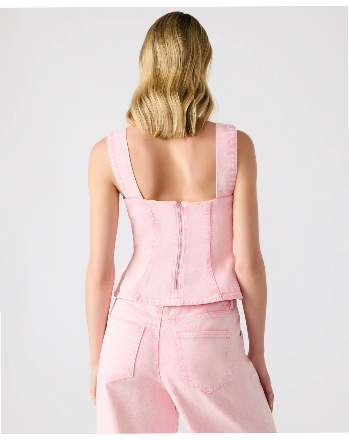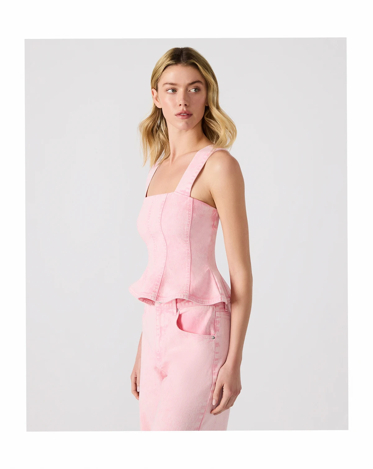 A pretty dyed denim top from Steve Madden, this peplum style top features a flattering square neckline, zipper closure at the back and wide shoulder straps for added comfort.